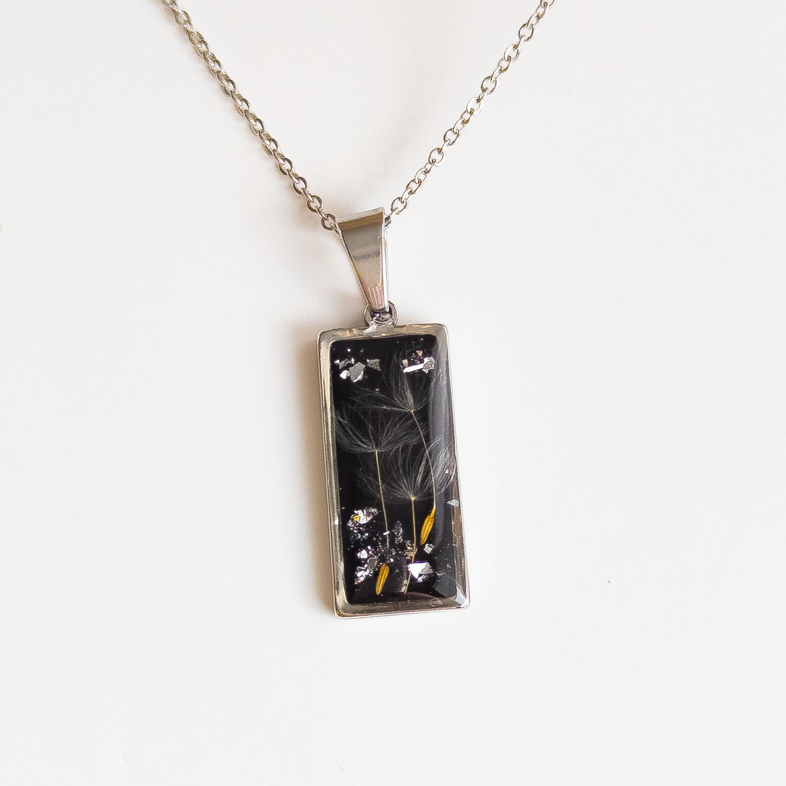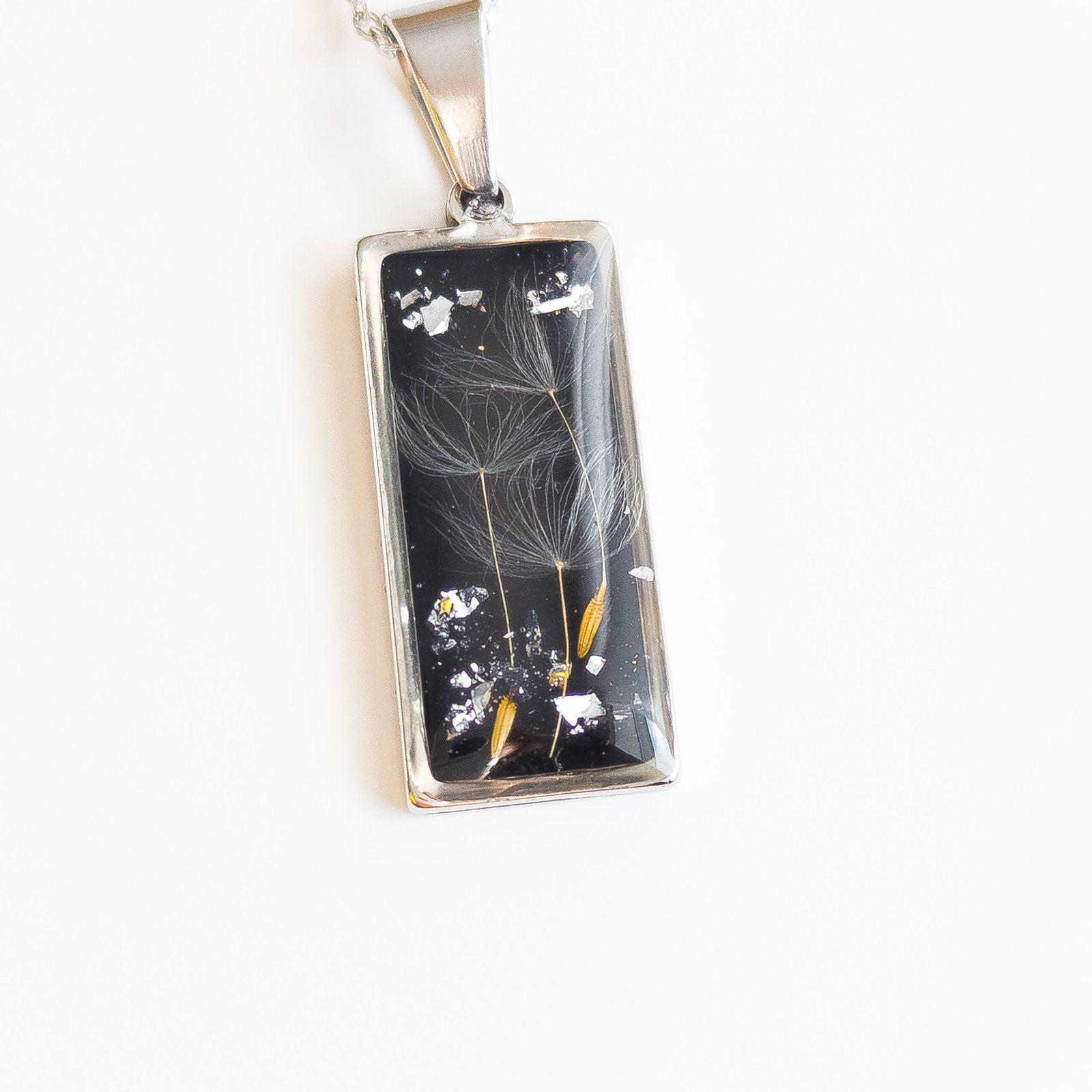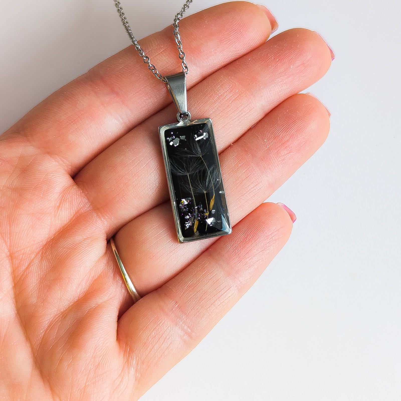 Delikatny naszyjnik z zatopionymi w żywicy nasionami dmuchawca na czarnym tle tworzy elegancką, lekko magiczną biżuterię, idealną dla miłośników natury i minimalizmu.