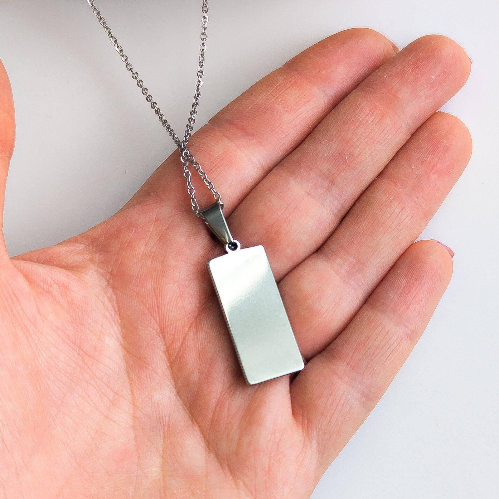 Metalowa zawieszka w kształcie prostokąta ma 3 cm długości i 1 cm szerokości i pięknie układa się na dekolcie, a srebrzyste płatki dodają subtelnego blasku. Łańcuszek ma 45 cm długości oraz dodatkową 5 cm przedłużkę, dzięki czemu łatwo dopasować naszyjnik do różnych stylizacji. Całość wykonano ze stali nierdzewnej, która jest trwała, odporna na zarysowania i idealna do codziennego noszenia.
