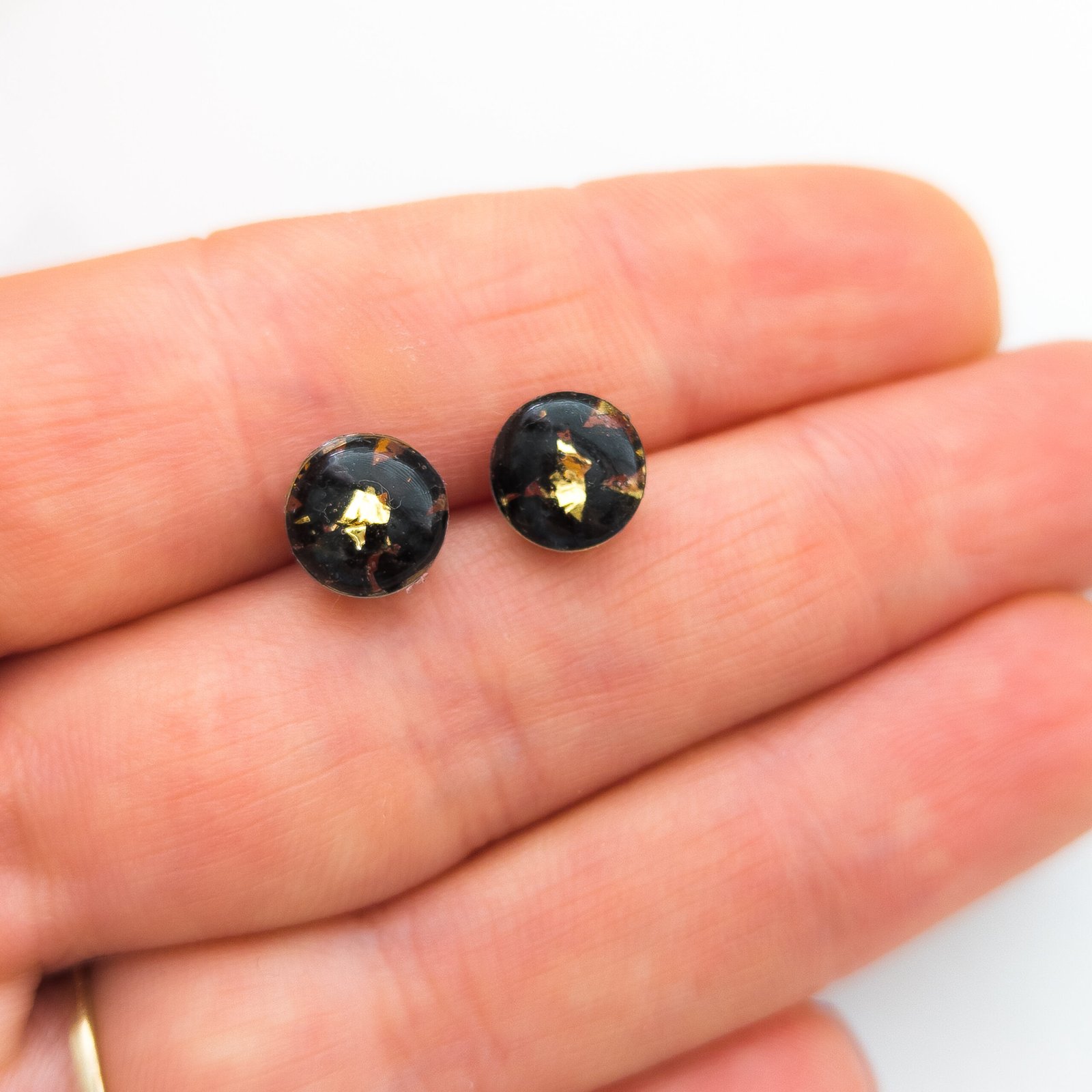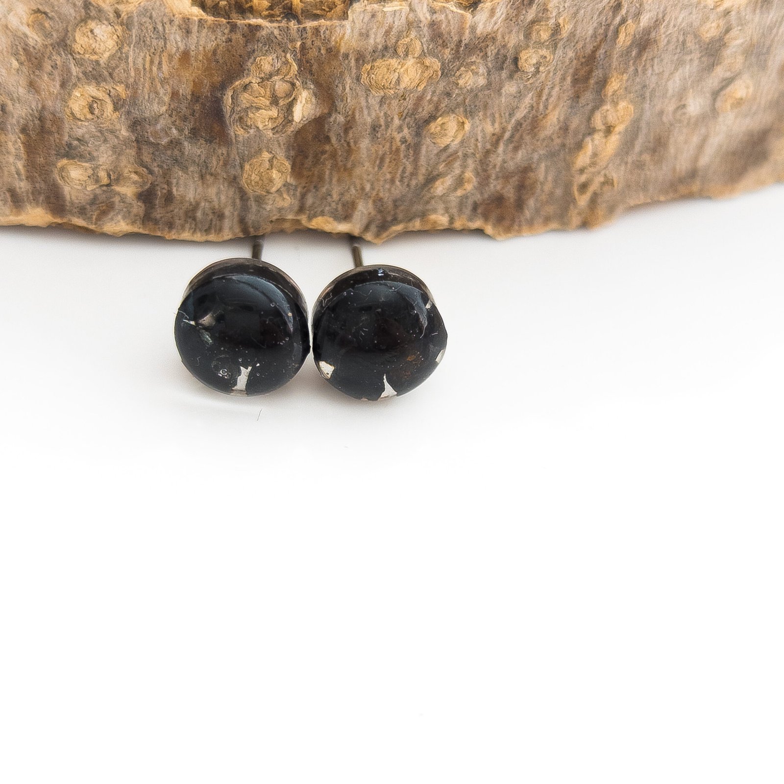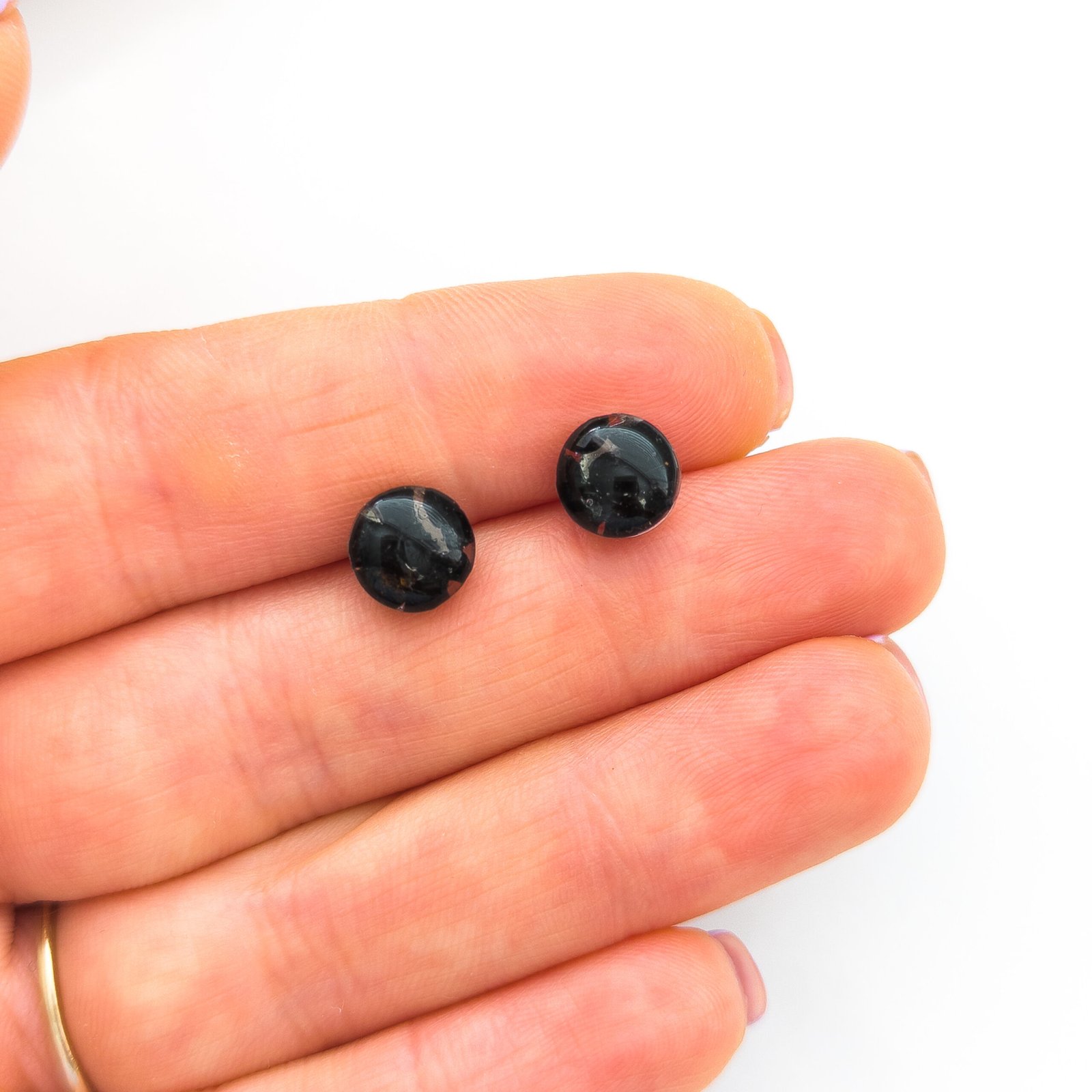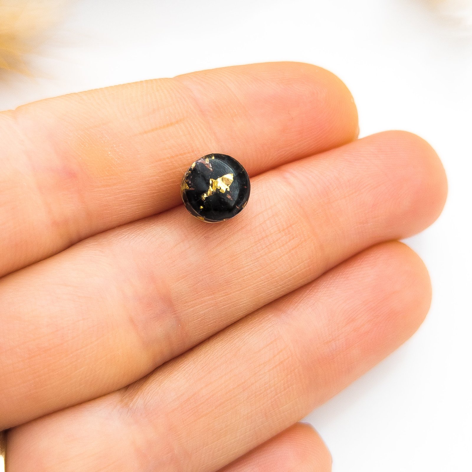 Kolczyki sztyfty z czarnym turmalinem to klasyka i ponadczasowość — idealne do noszenia na co dzień, jak i na eleganckie okazje. Dostępne w trzech wersjach: ze złotymi płatkami, ze srebrnymi płatkami lub minimalistyczne (sam kamień bez dodatków). Średnica wynosi 0,5 cm, a wszystkie elementy metalowe wykonane są ze stali nierdzewnej.