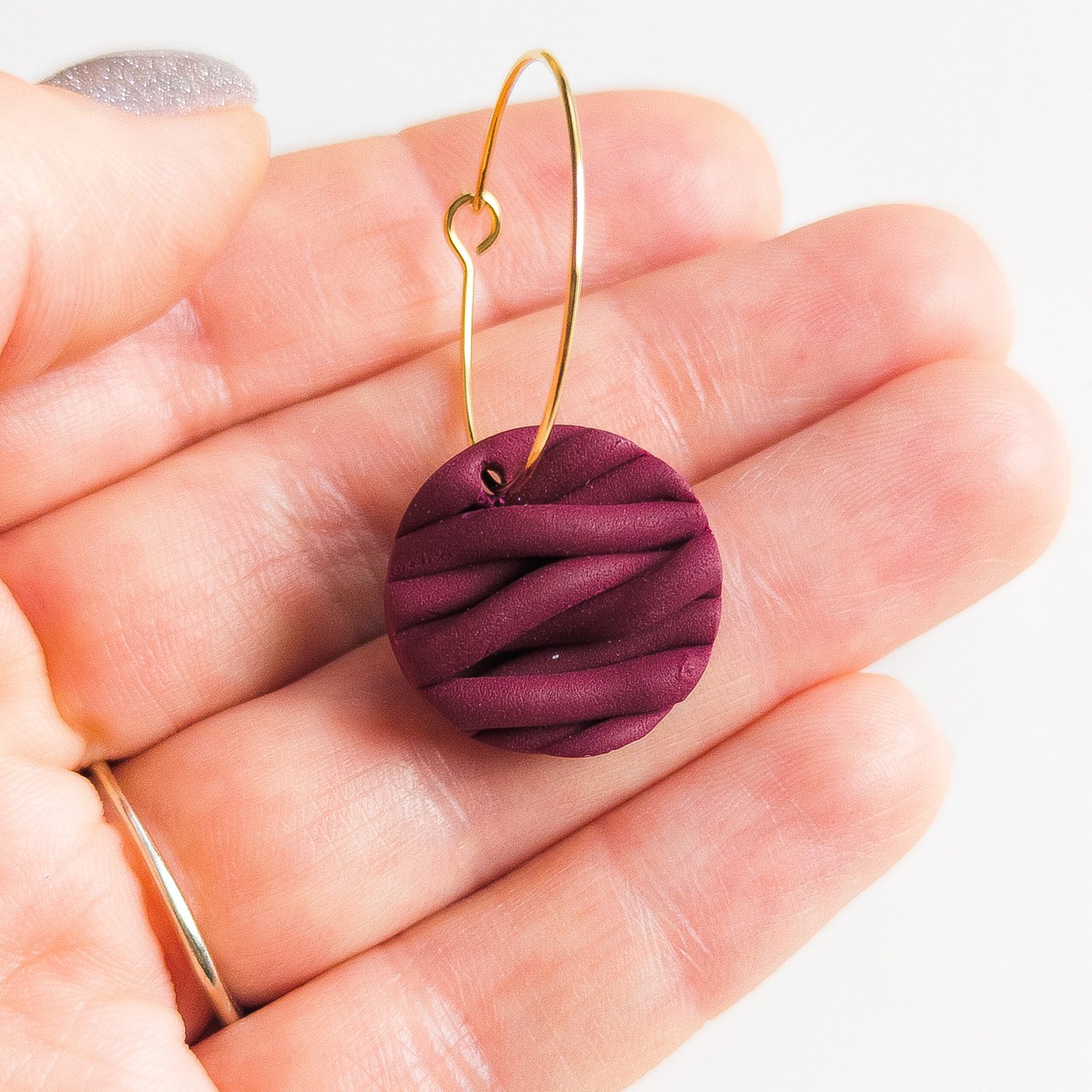 Delikatne kolczyki z gliny polimerowej w głębokim, burgundowym odcieniu, ręcznie zaplecione w małą, okrągłą zawieszkę o charakterystycznej, przytulnej fakturze przypominającej sweter.