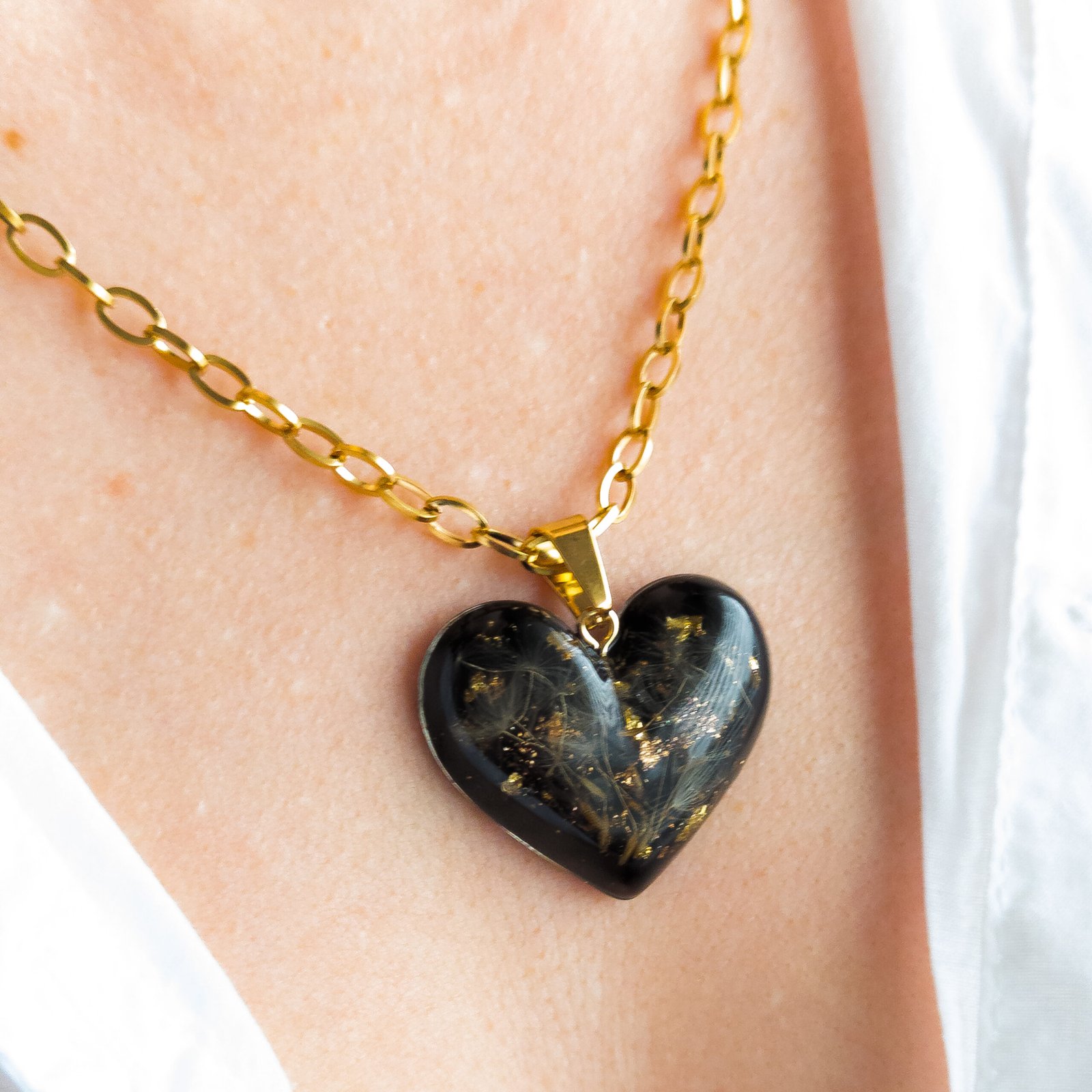 Elegancki naszyjnik z wypukłą zawieszką w kształcie serca, w której na głębokim, czarnym tle zatopiono delikatne nasiona dmuchawca oraz płatki złotej folii. To idealny wybór dla osób ceniących biżuterię z przesłaniem, symbolizującą marzenia i nowe początki.