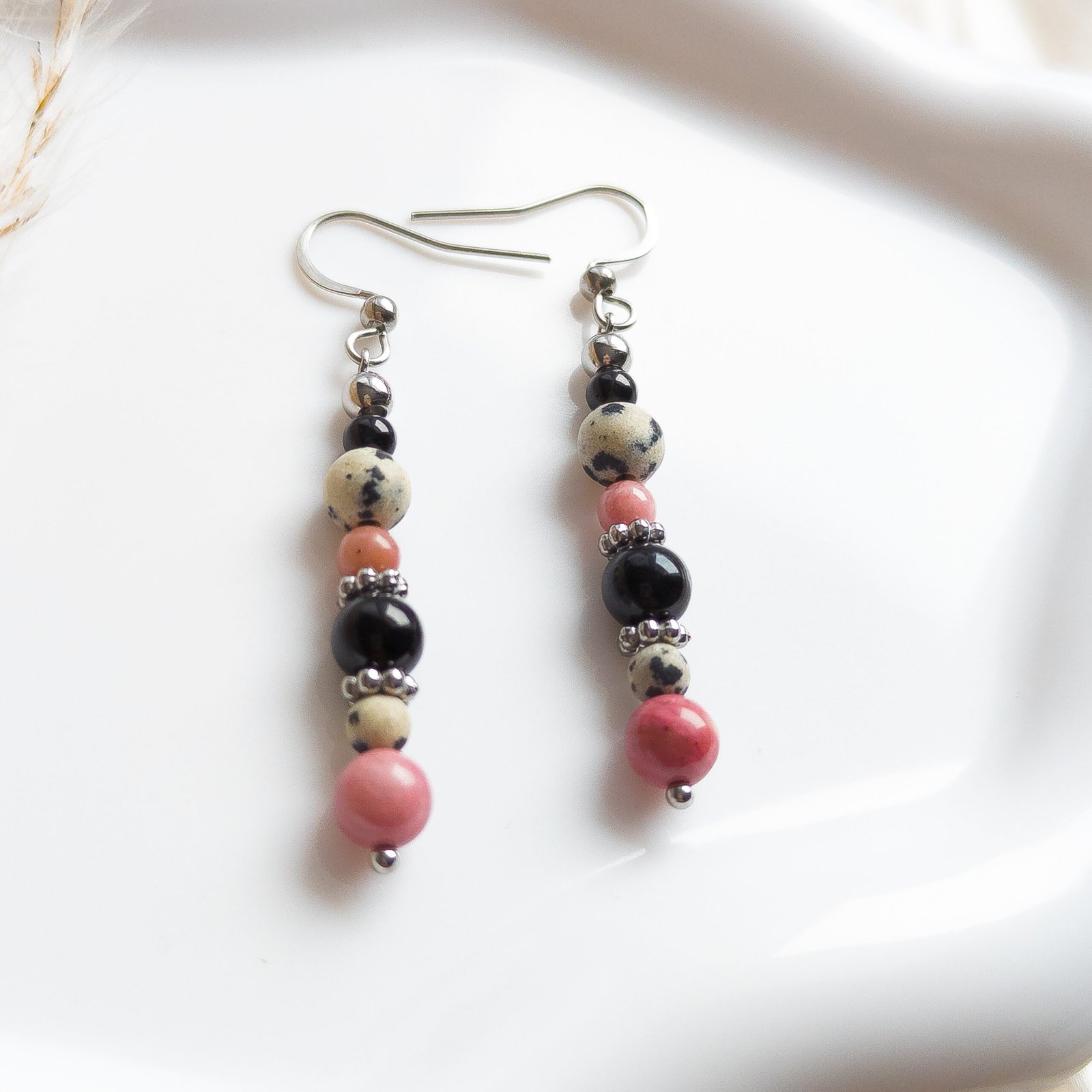 Kolczyki mają długość 5,5 cm i charakteryzują się subtelną grą kolorów: od jasnego nakrapianego jaspisu, przez róż rodonitu, aż po głęboką czerń turmalinu. Elementy metalowe, w tym bigle, wykonane są z wysokiej jakości stali nierdzewnej, co gwarantuje trwałość i bezpieczeństwo dla skóry.