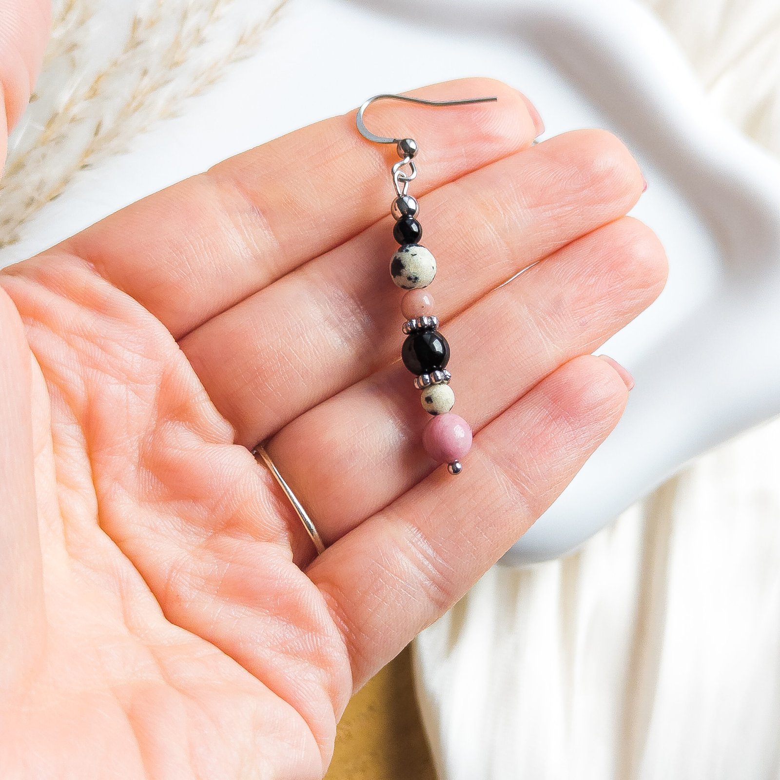Wyjątkowe kolczyki z kamieni naturalnych, które łączą w sobie uziemiającą energię jaspisu dalmatyńskiego, kojący rodonit oraz ochronny turmalin. Ta kombinacja działa stabilizująco na emocje – rodonit pomaga leczyć rany przeszłości i budować miłość własną, jaspis dalmatyński dodaje energii i radości, a czarny turmalin chroni przed negatywnymi wpływami otoczenia.