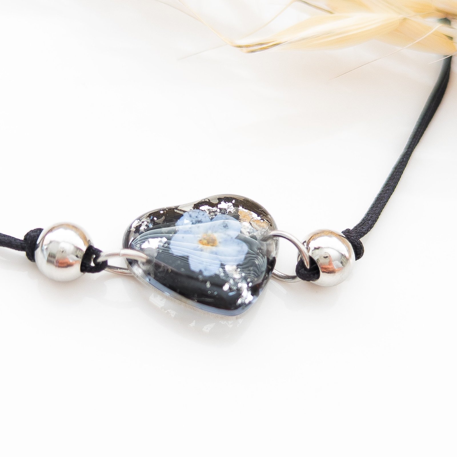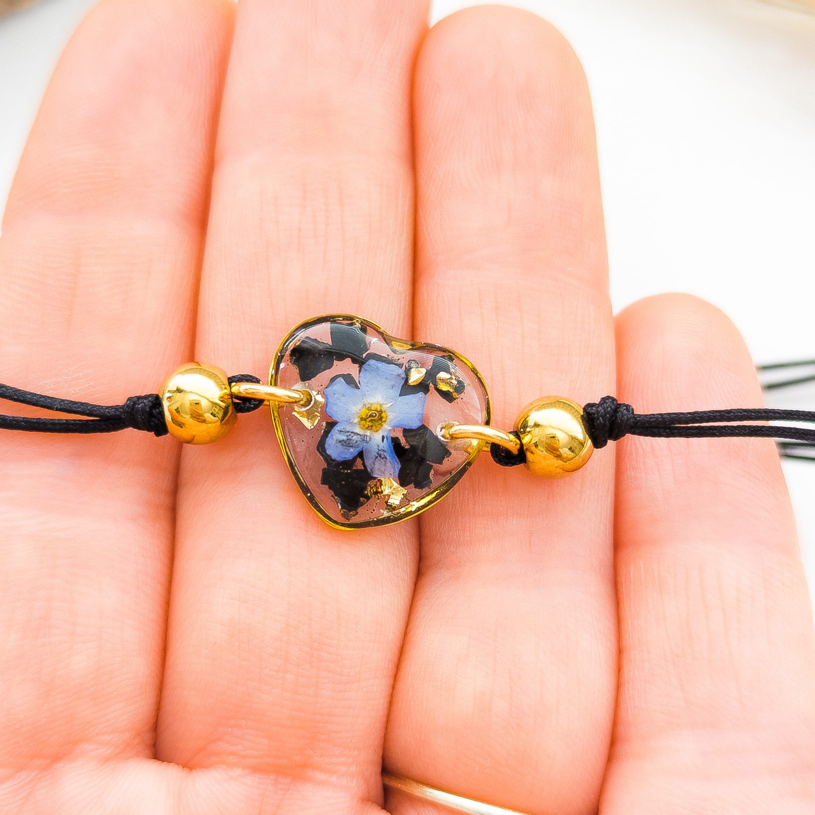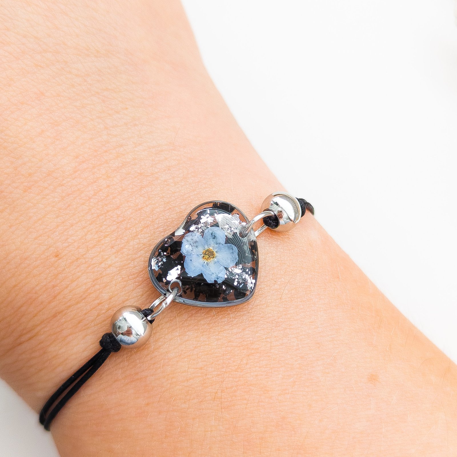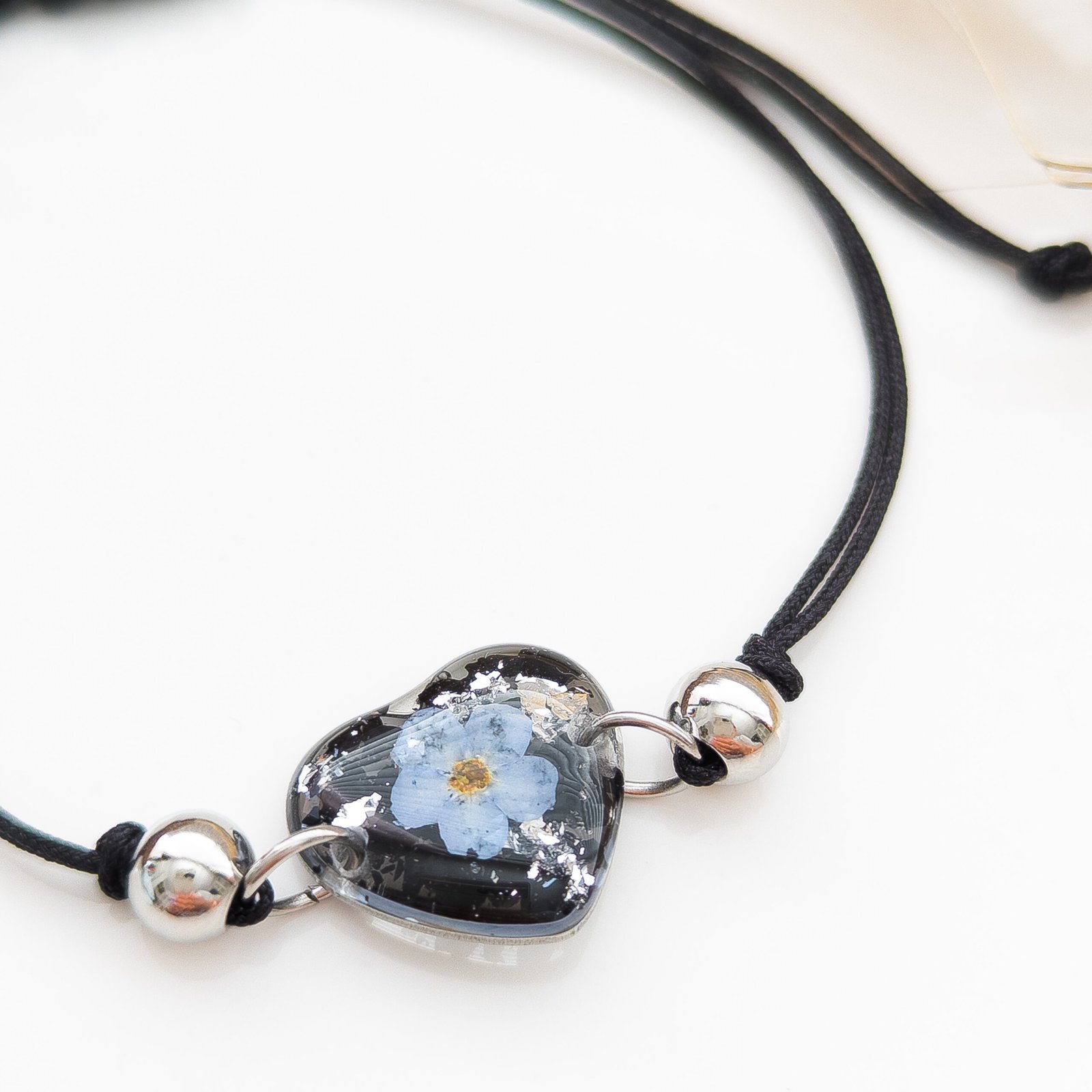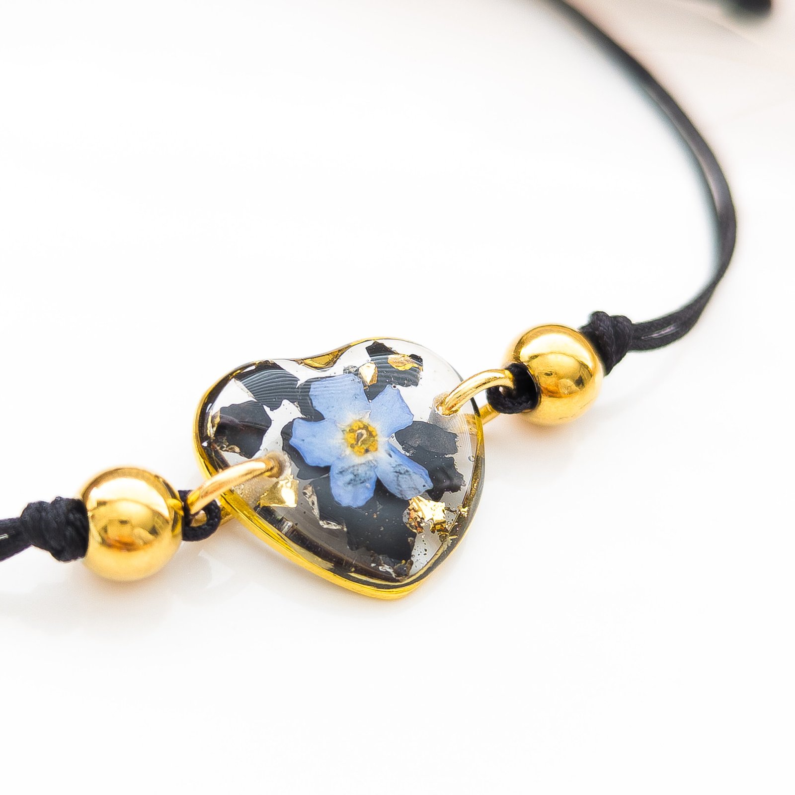 Ta bransoletka to regulowany produkt na czarnym nylonowym sznurku z zawieszką w kształcie serca o wielkości 1,5 cm. Zawieszka z żywicy zawiera czarny turmalin i kwiatek niezapominajki. Turmalin jest ceniony za swoje właściwości ochronne — chroni przed negatywną energią oraz wzmacnia poczucie bezpieczeństwa i motywację. Niezapominajka symbolizuje pamięć, lojalność i wdzięczność; jest to kwiat, który pomaga zachować wyjątkowe wspomnienia i więzi.