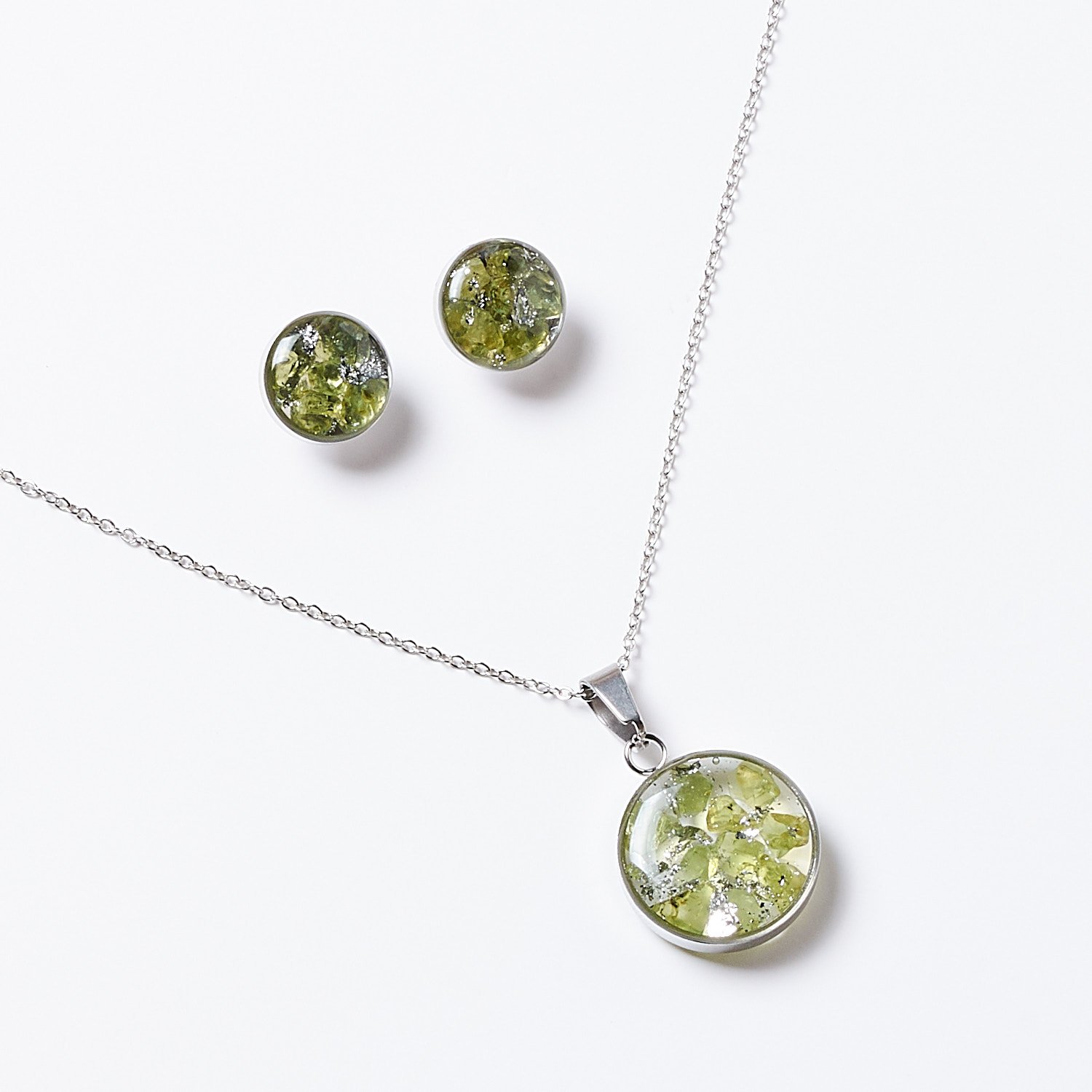 Srebrny komplet biżuterii z perydotem zachwyca świeżością i naturalnym blaskiem tego zielonego kamienia. Perydot to klejnot radości i optymizmu, który pomaga oczyścić umysł, wzmacnia pozytywną energię i poprawia relacje. Srebrna oprawa podkreśla elegancję oraz subtelność tego mineralnego zestawu, idealnego zarówno na co dzień, jak i na specjalne okazje.