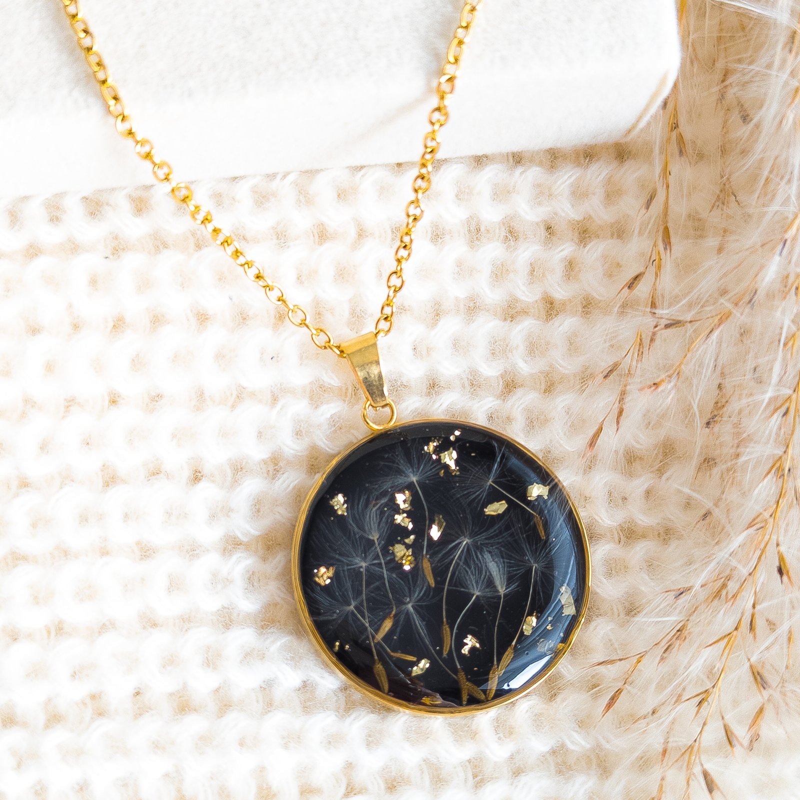 Uroczy naszyjnik z okrągłym wisiorem, w którym delikatne nasiona dmuchawca oraz płatki złotej folii zostały zatopione na eleganckim, czarnym tle. Ta unikalna kompozycja z żywicy przypomina gwiaździste nocne niebo i jest idealnym wyborem dla osób ceniących biżuterię inspirowaną naturą.