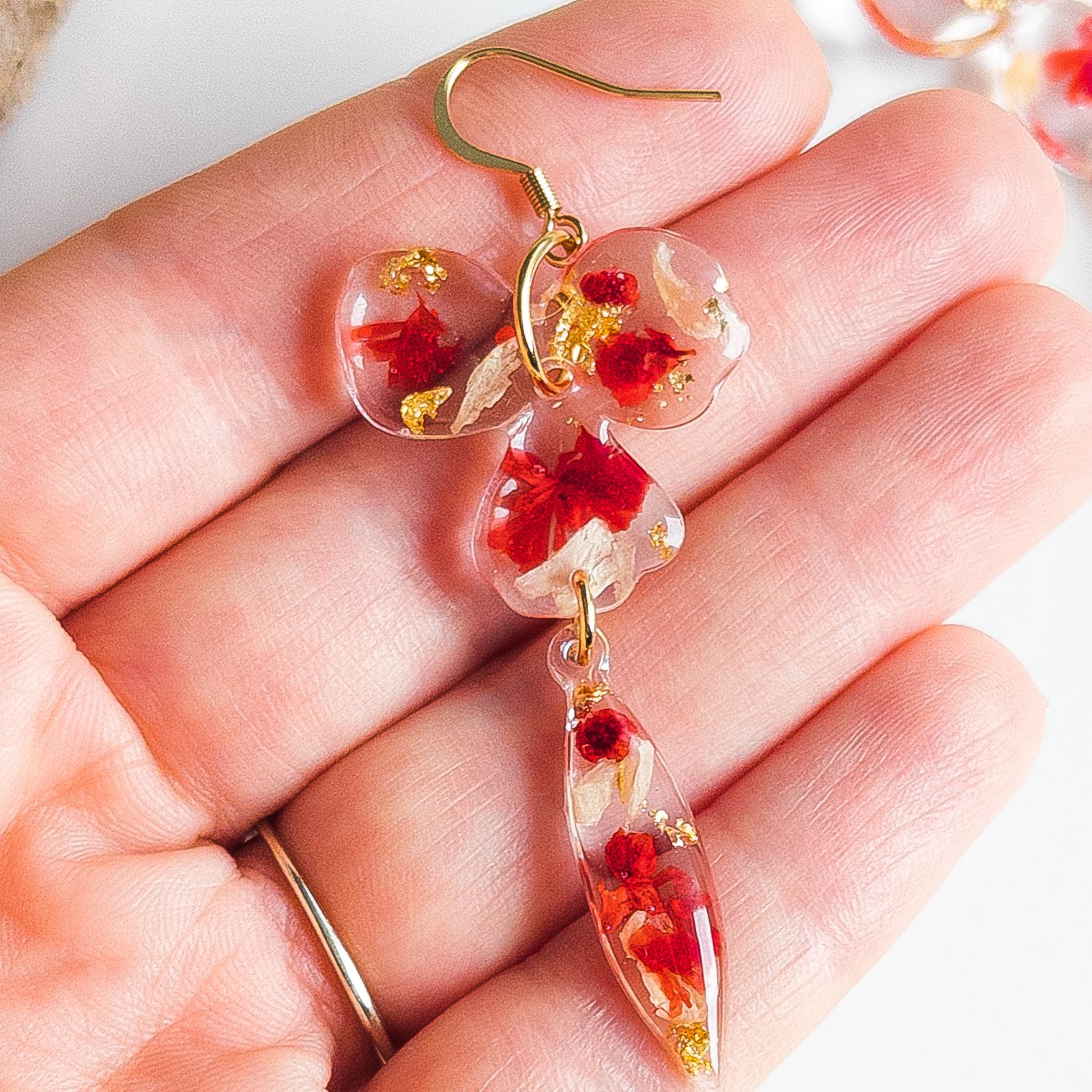 Romantyczne, długie kolczyki wykonane z przezroczystej żywicy, z zatopionymi w środku intensywnie czerwonymi kwiatami i delikatnymi płatkami złotej folii.