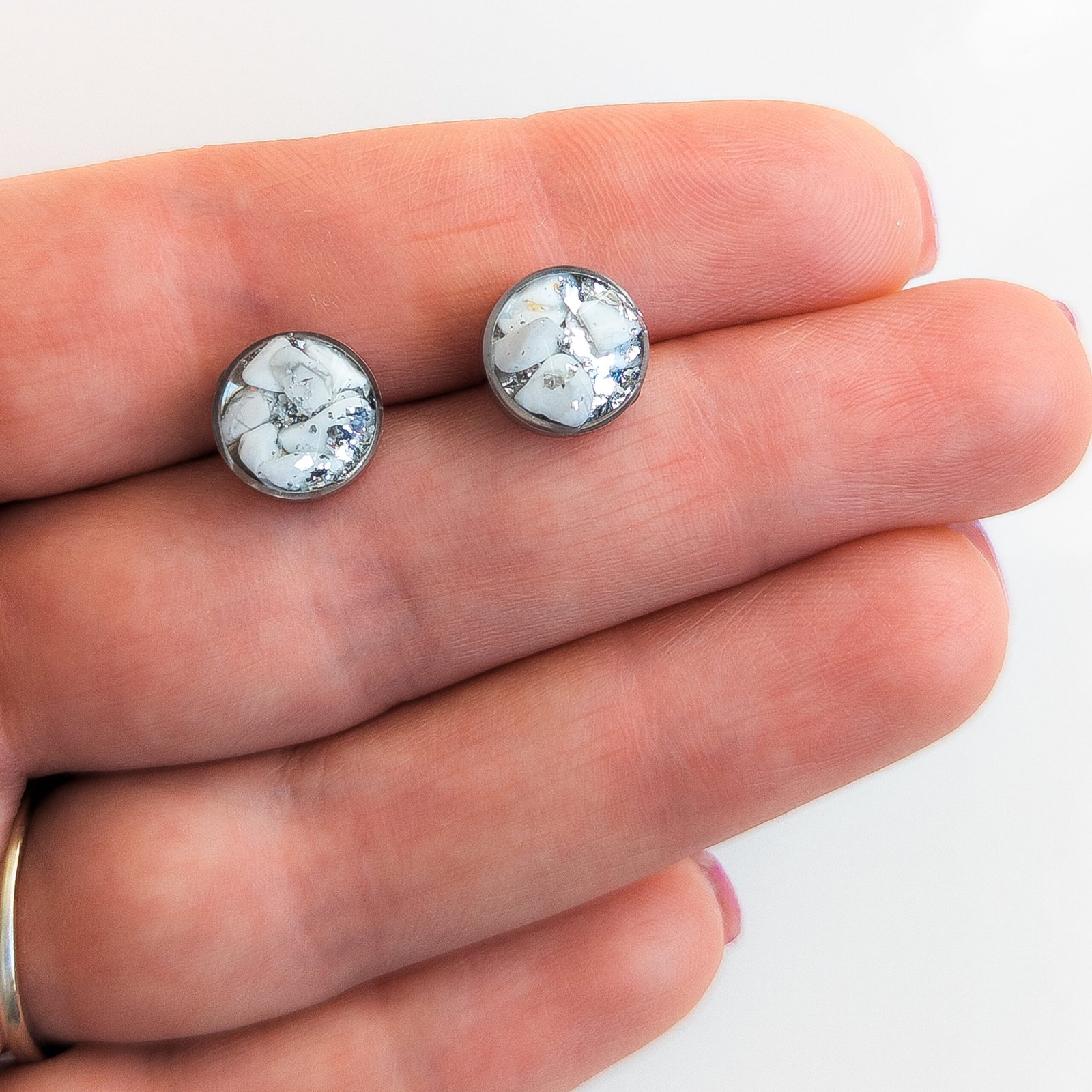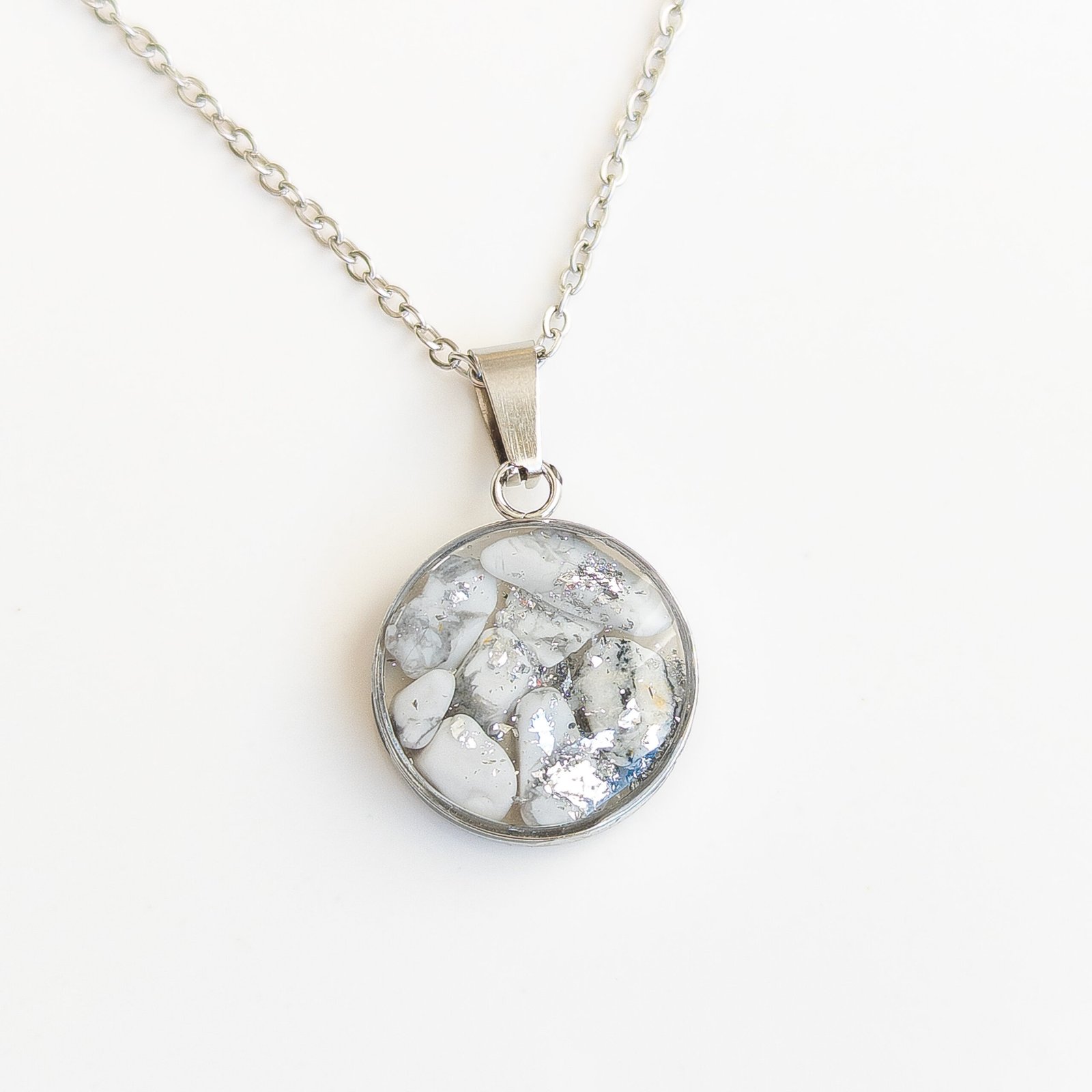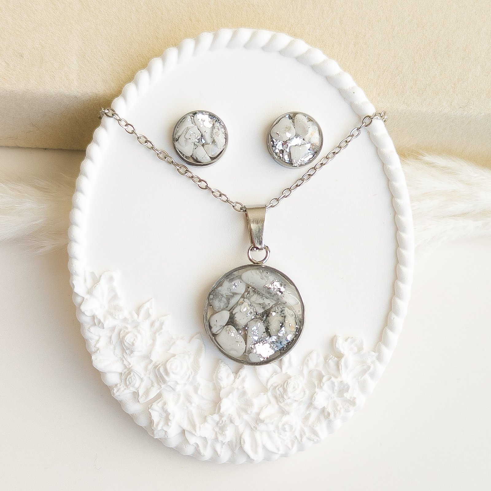 Subtelny zestaw biżuterii wykonany ze stali nierdzewnej z zatopionym howlitem w odcieniach bieli i szarości, dopełniony delikatnym, srebrzystym blaskiem.