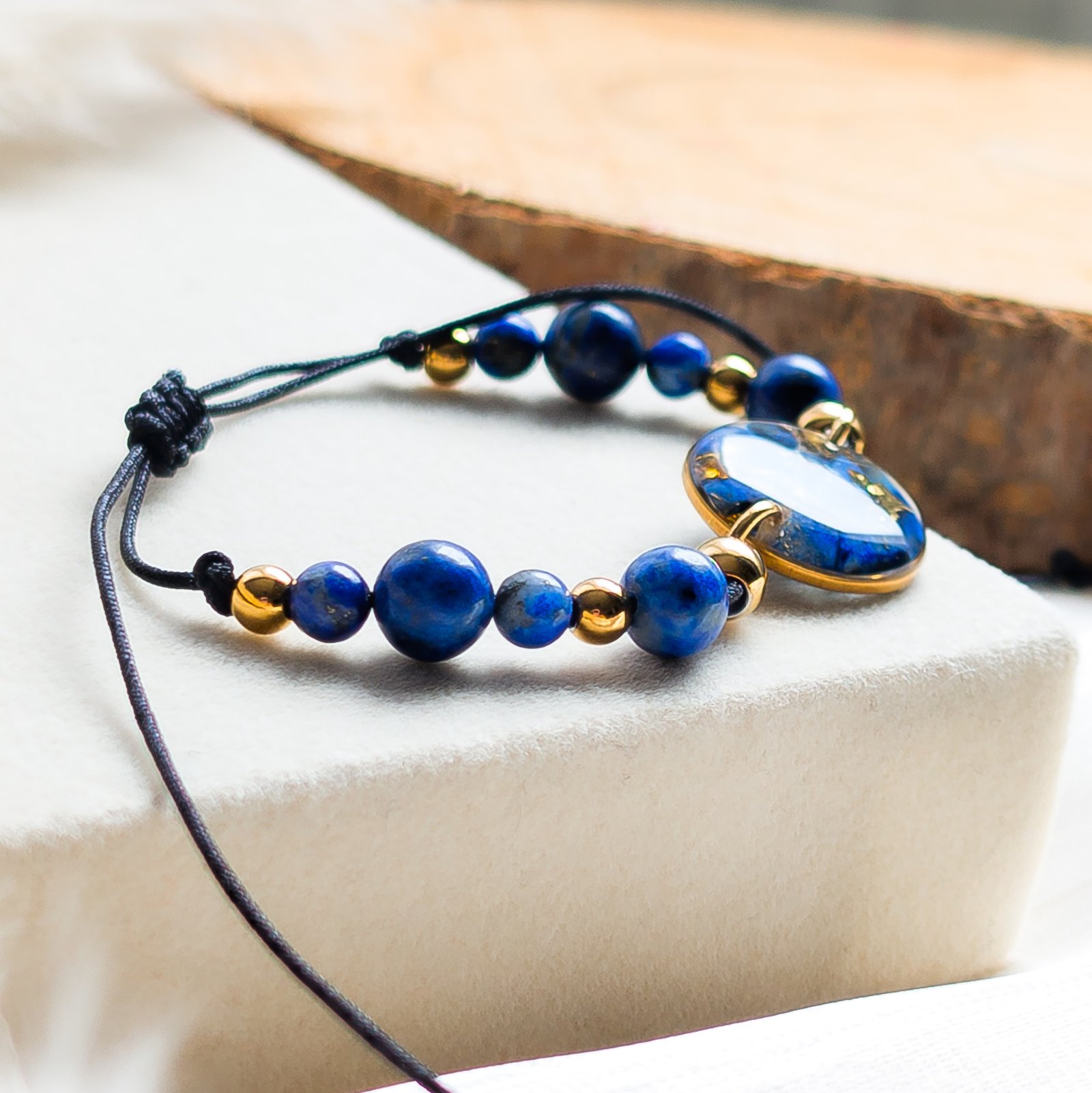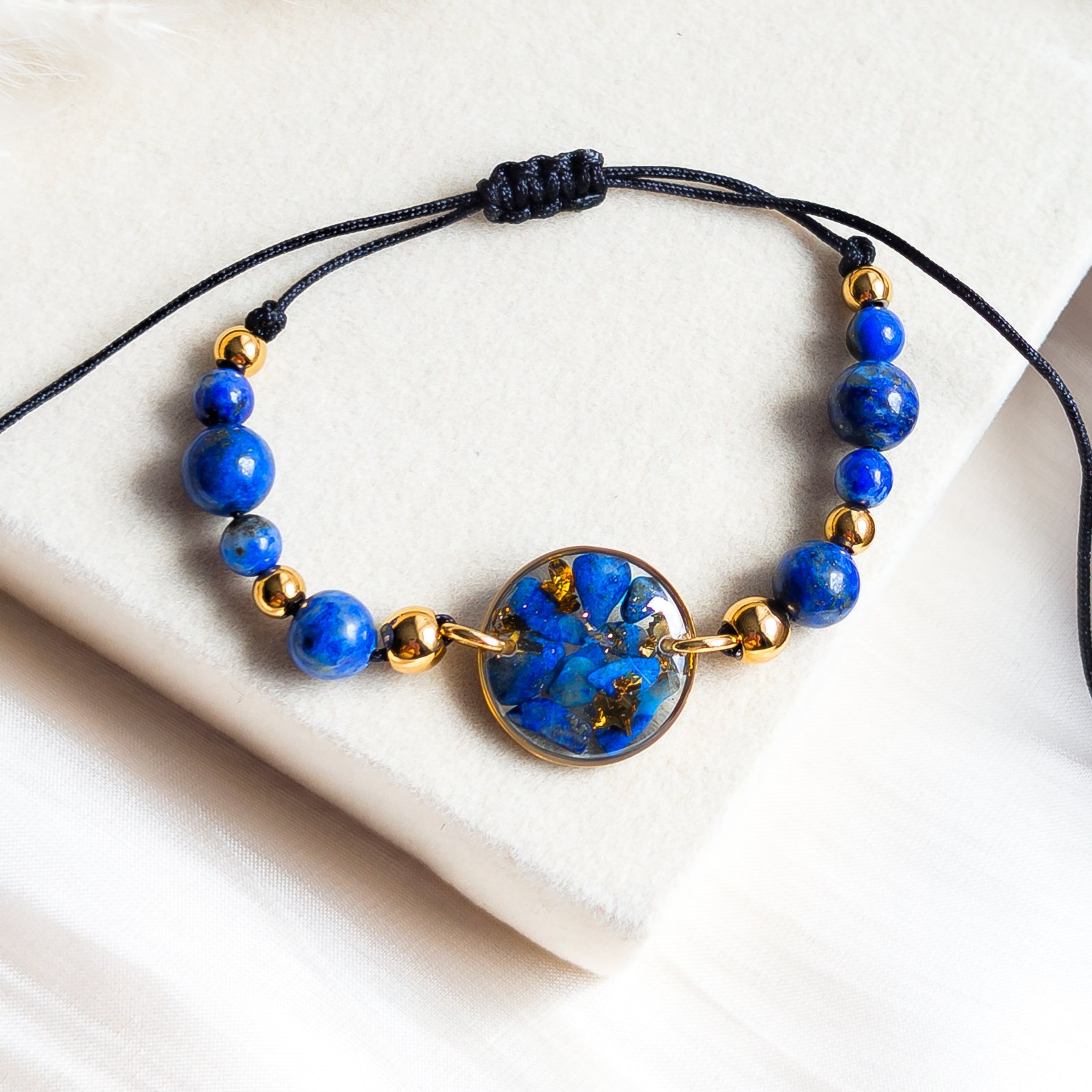 Wyjątkowa bransoletka wykonana z naturalnych kamieni lapis lazuli o głębokim niebieskim kolorze. Centralnym punktem biżuterii jest okrągła zawieszka z zatopionymi drobinkami lapis lazuli, która idealnie komponuje się ze złotymi dodatkami. Bransoletka została zapleciona na wytrzymałym, czarnym sznurku nylonowym, a dzięki regulowanemu zapięciu typu makrama pasuje na każdy nadgarstek.