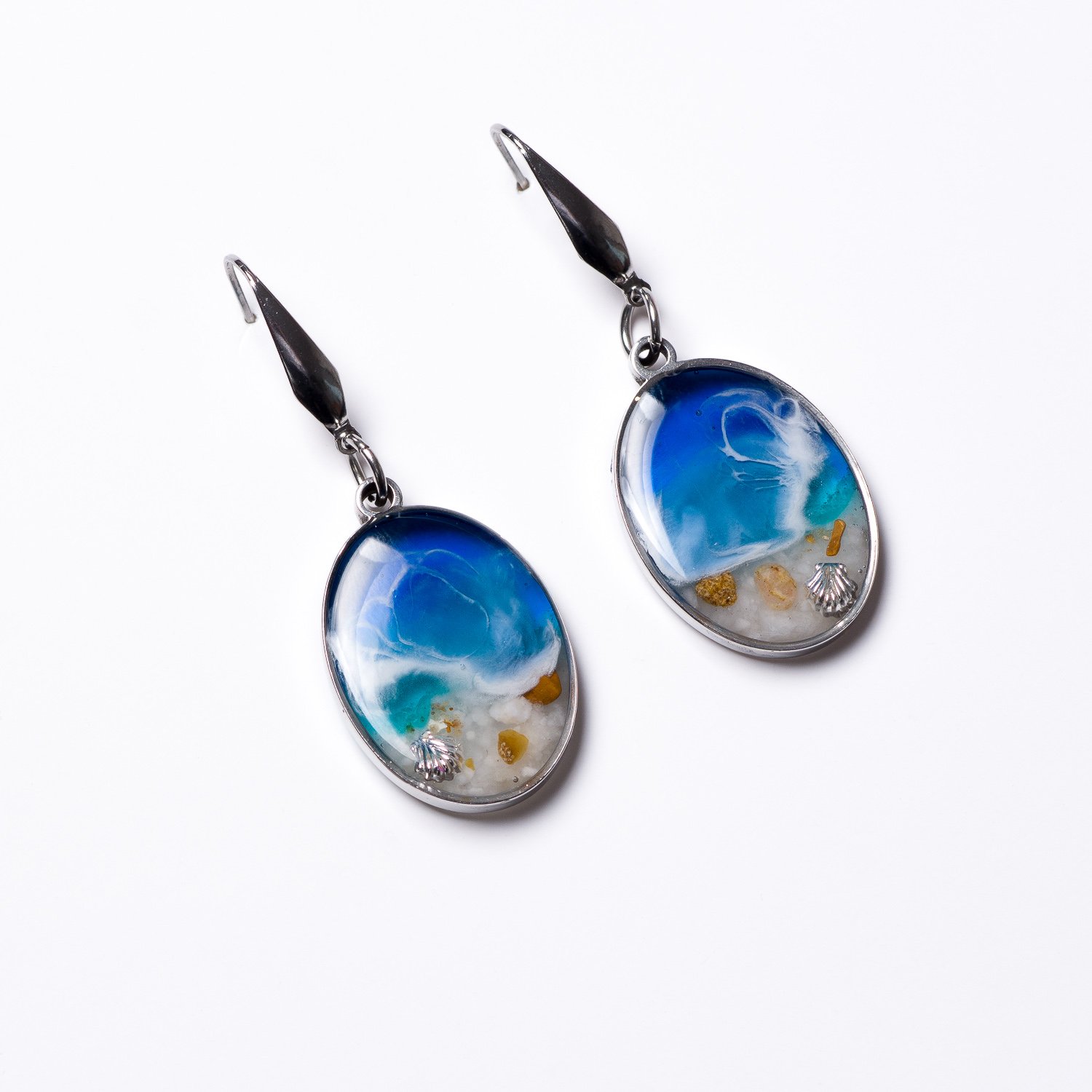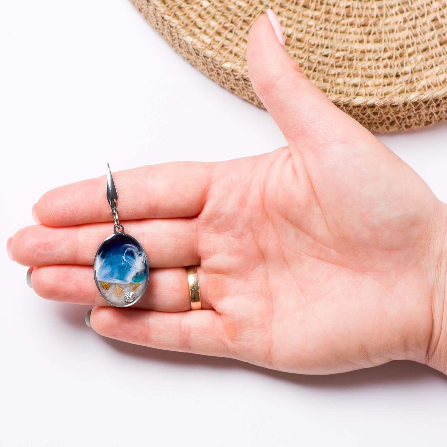 Te piękne, inspirowane morzem kolczyki z zatopionymi prawdziwymi kamykami oraz piaskiem z morskiego brzegu to idealny wybór dla osób kochających oceaniczne klimaty.