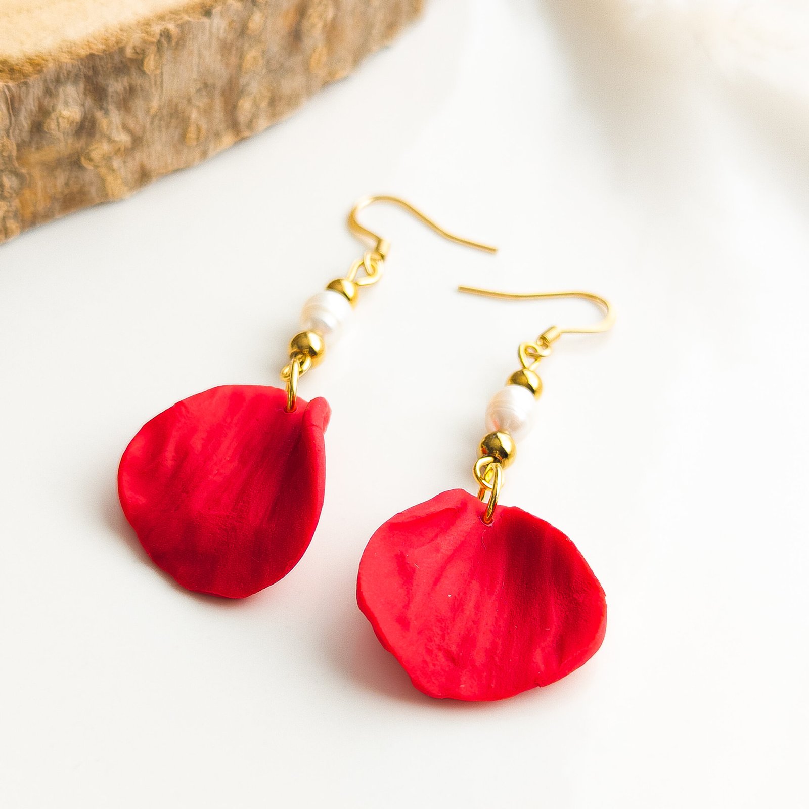 Te wiszące kolczyki są wykonane ręcznie z gliny polimerowej, dzięki czemu są lekkie i komfortowe w noszeniu pomimo swojej długości wynoszącej 6 cm. Czerwone kształty przypominające płatki zostały połączone z małymi koralikami ze stali nierdzewnej w kolorze złotym oraz naturalną perłą słodkowodną, co dodaje im odrobiny delikatnej elegancji.