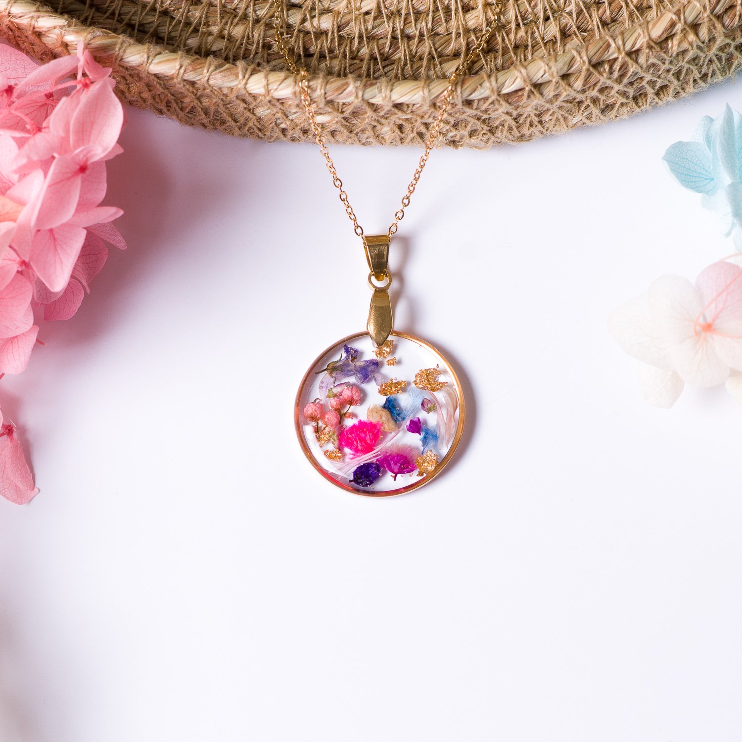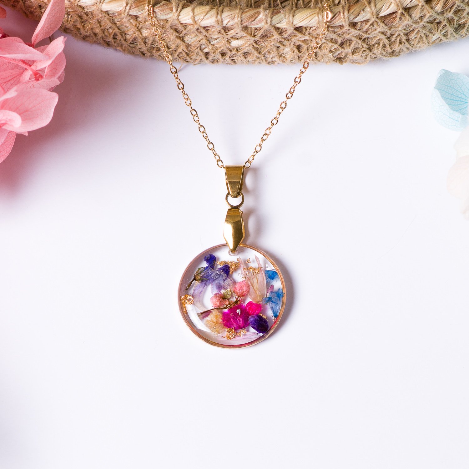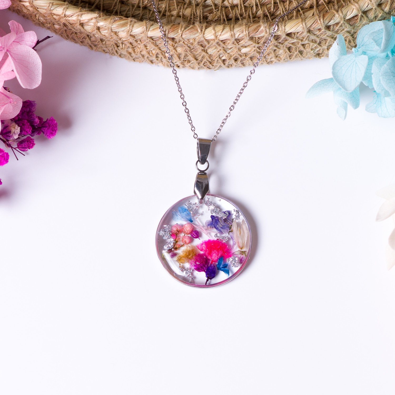 Piękny naszyjnik z kolorowymi kwiatami, idealny do wiosennych i letnich stylizacji. Stanowi również doskonały prezent.