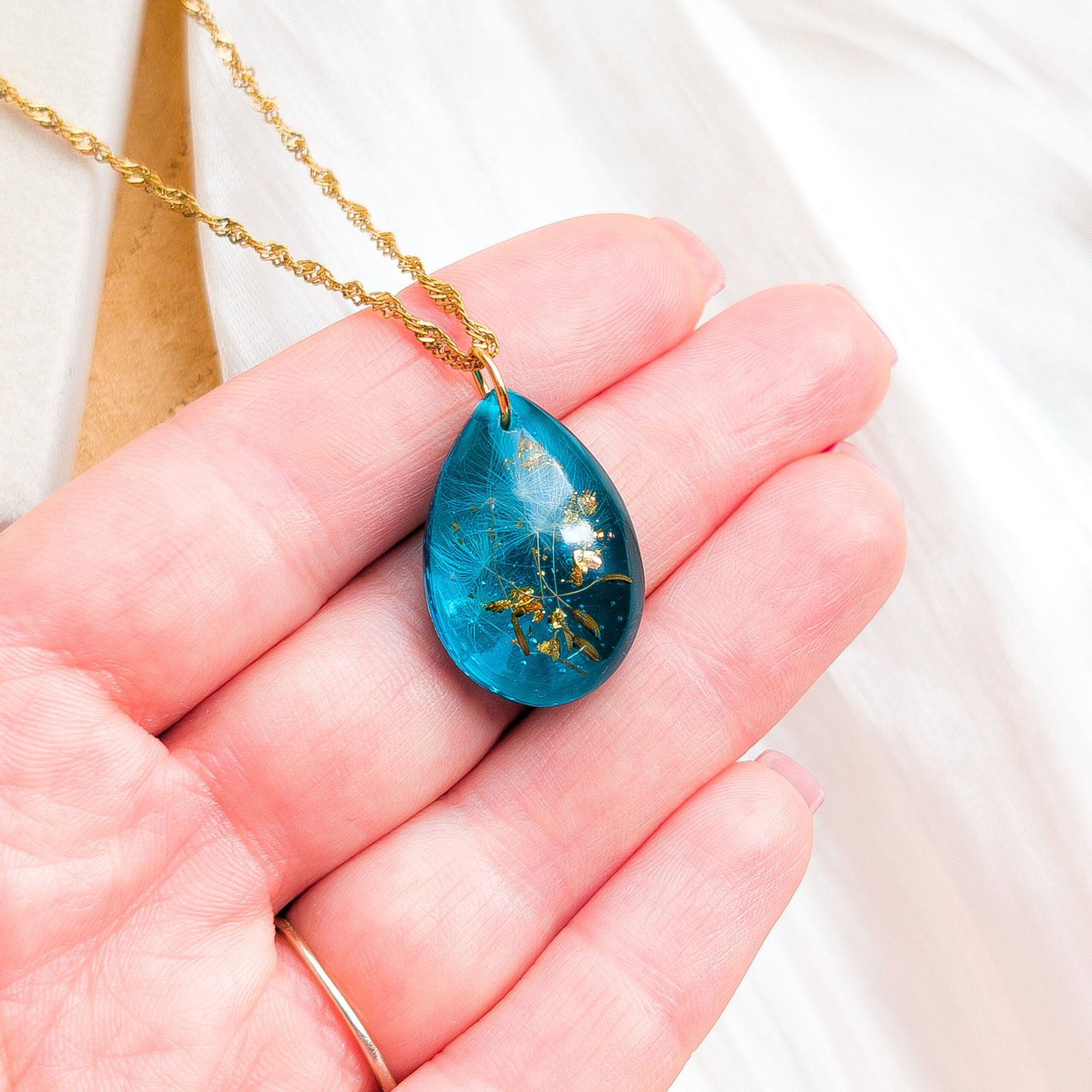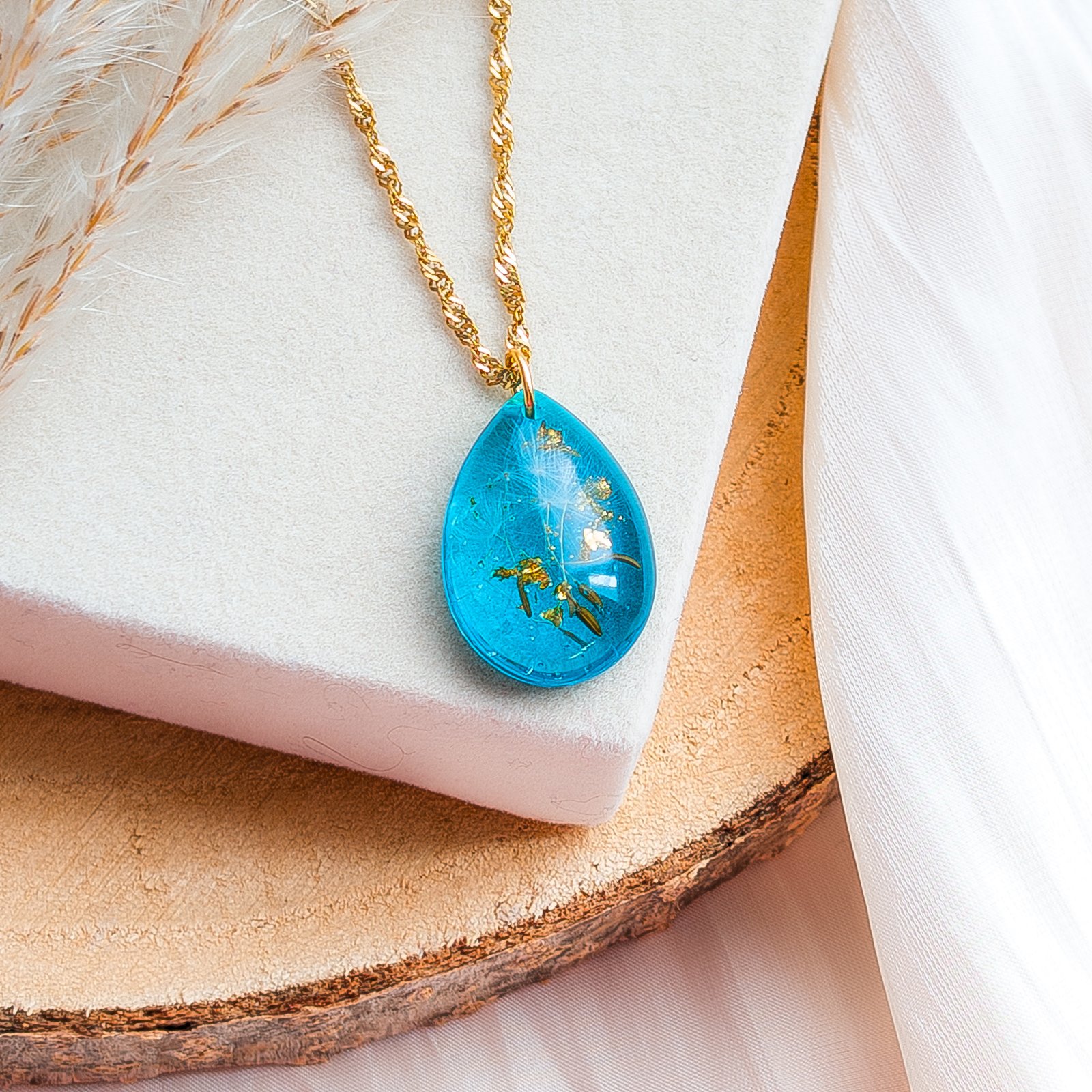 Piękny naszyjnik w kształcie kropli z zatopionymi nasionami dmuchawca i delikatnymi płatkami złotej folii na turkusowym tle, idealny na różne okazje. Biżuteria jest lekka i wygodna w noszeniu, stanowiąc wyjątkowy akcent każdego stroju.