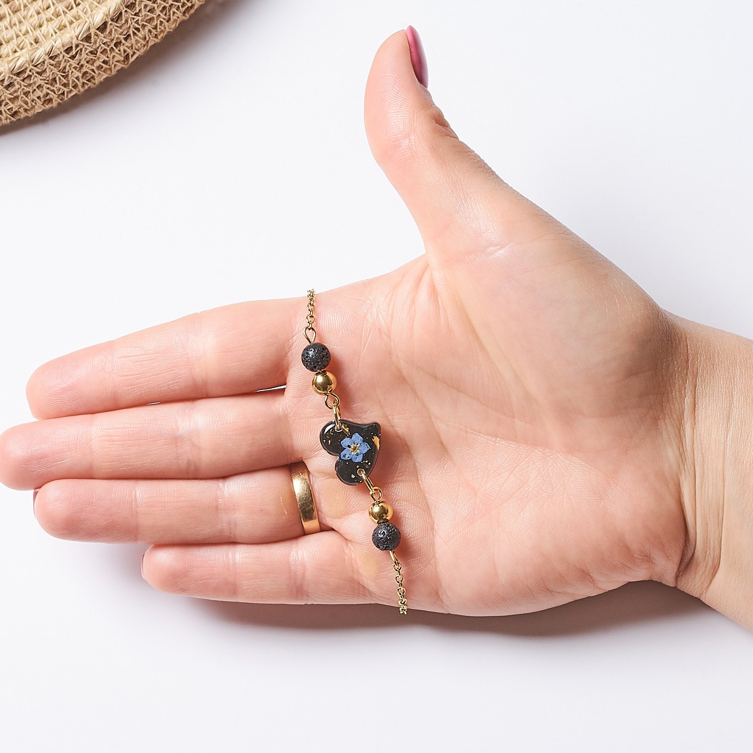 Bransoletka z niezapominajką w sercu i koralikami z czarnej lawy to propozycja, która łączy w sobie subtelność z charakterystyczną mocą natury. Zawieszka w kształcie serca (1,5 cm) została ręcznie wypełniona suszoną niezapominajką — symbolem pamięci, wierności i szczęścia. Koraliki z lawy wulkanicznej wzbogacają projekt o unikalny, naturalny wygląd i są cenione jako minerały, które wzmacniają siłę, odwagę, wspierają równowagę emocjonalną oraz odpędzają negatywną energię.