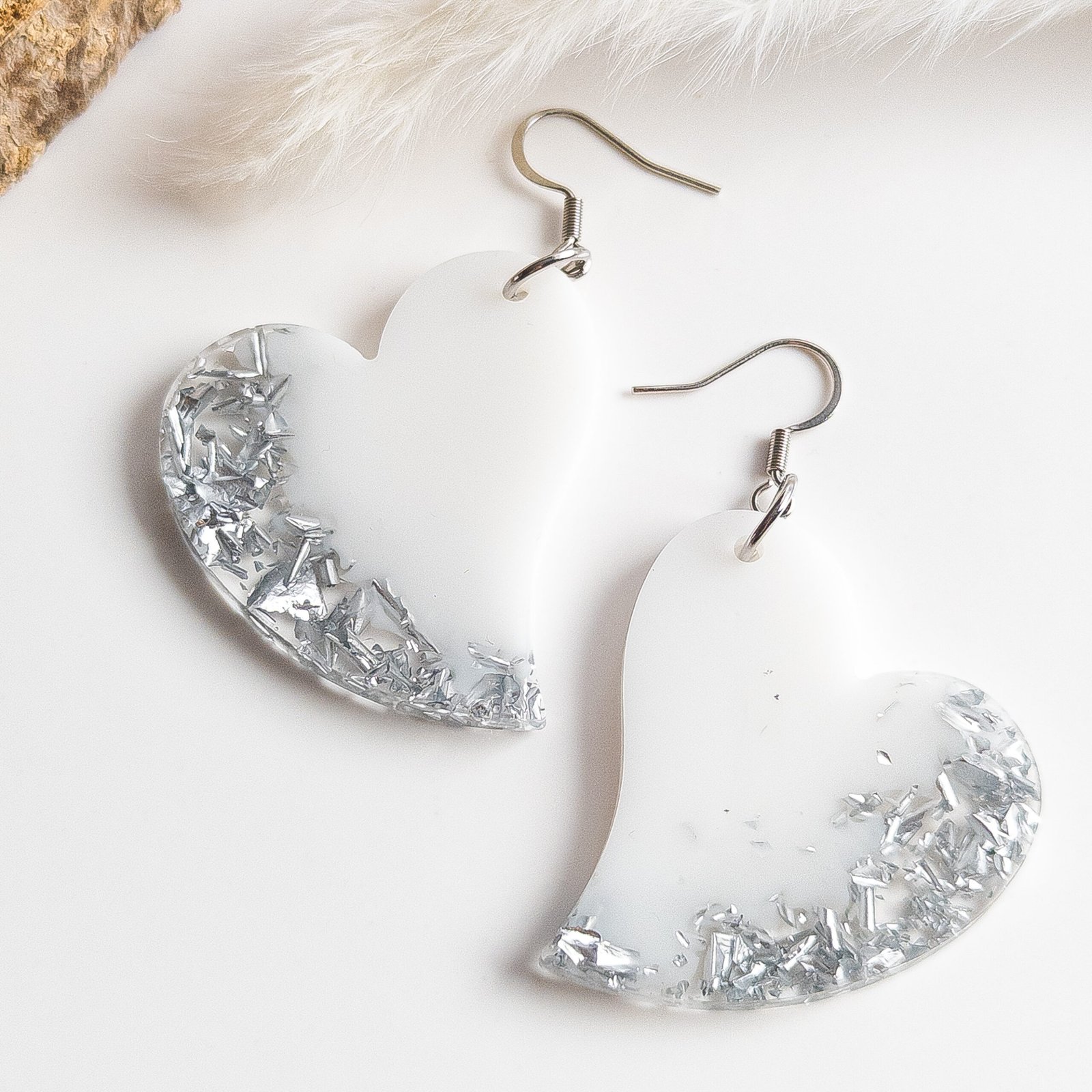 Efektowne kolczyki w kształcie dużych, asymetrycznych serc wykonane z białej żywicy, z przezroczystą dolną krawędzią wypełnioną srebrnymi płatkami, które pięknie łapią światło.