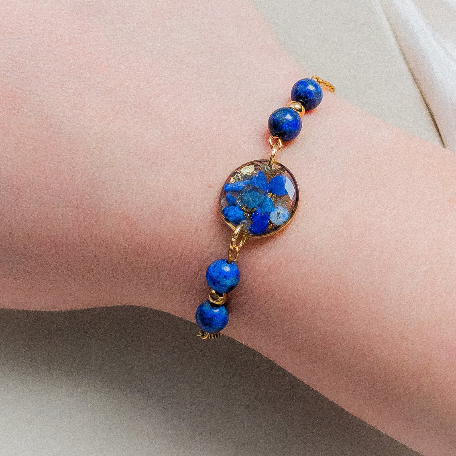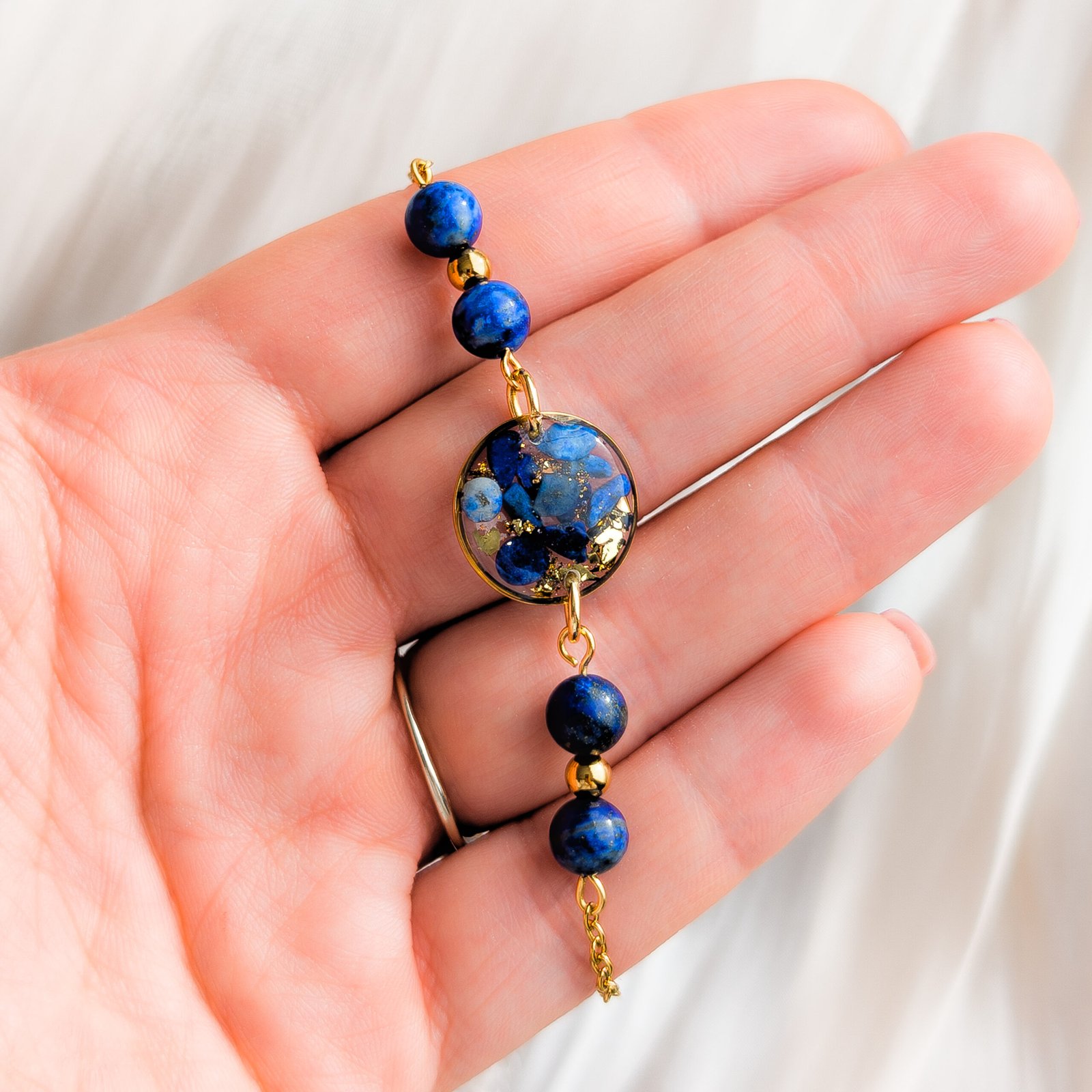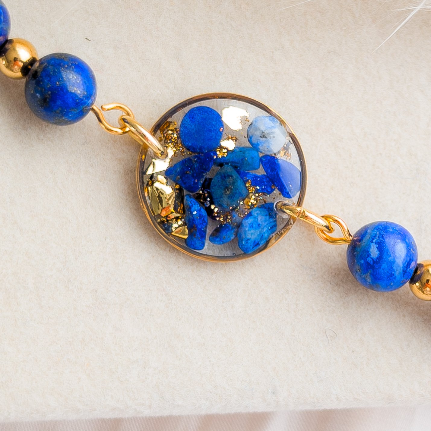 Piękna bransoletka wykonana z naturalnego lapis lazuli oraz subtelnego złotego łańcuszka, z unikatową okrągłą zawieszką, w której zatopione zostały drobne kamyki tego szlachetnego minerału. Biżuteria jest lekka i wygodna w noszeniu, stanowiąc doskonałe połączenie luksusowej elegancji z głębią naturalnego koloru kamienia.