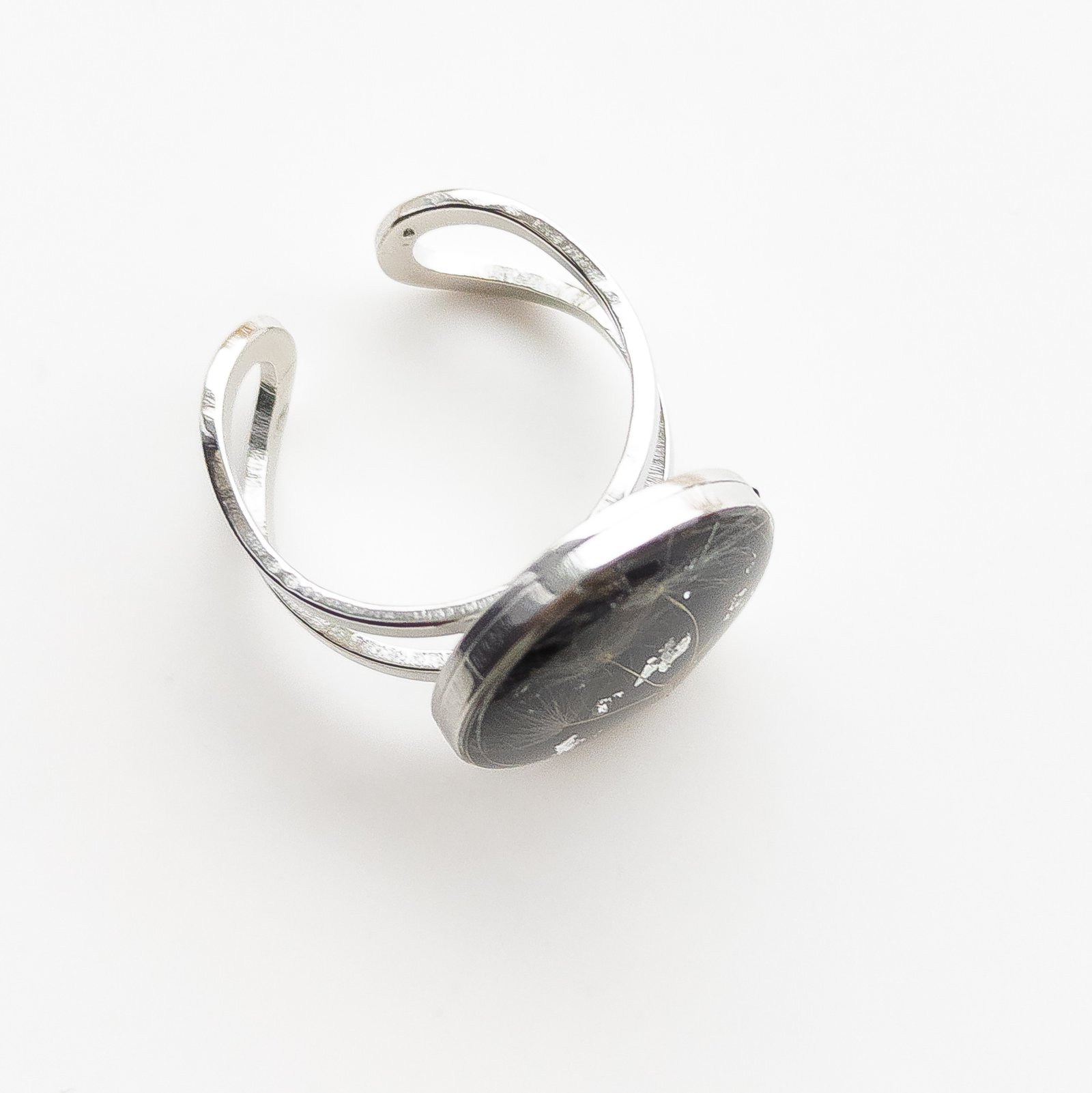 A delicate adjustable ring made of stainless steel, featuring a 1.5 cm round bezel filled with real dandelion seeds set against a deep dark background.