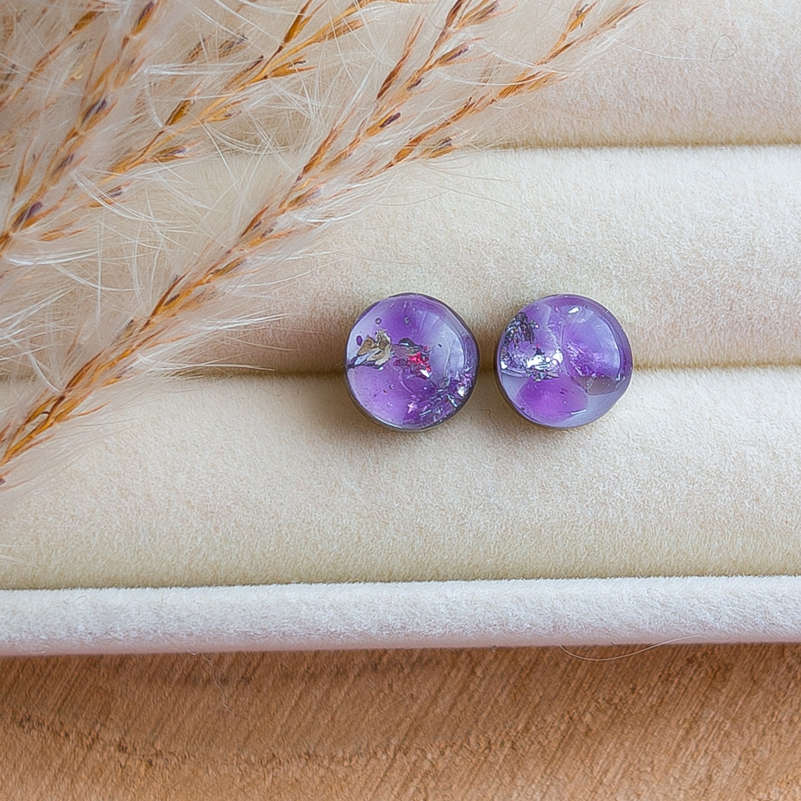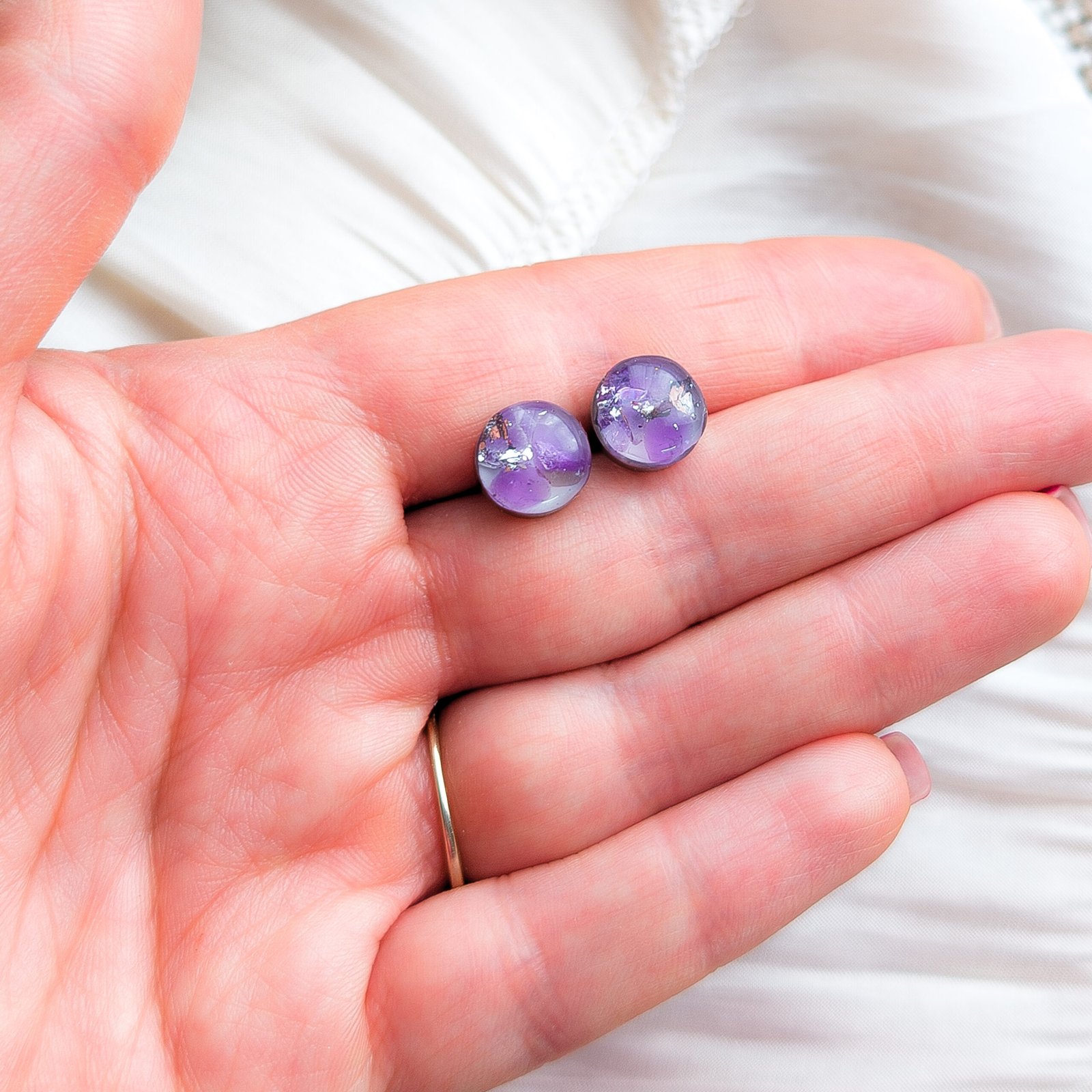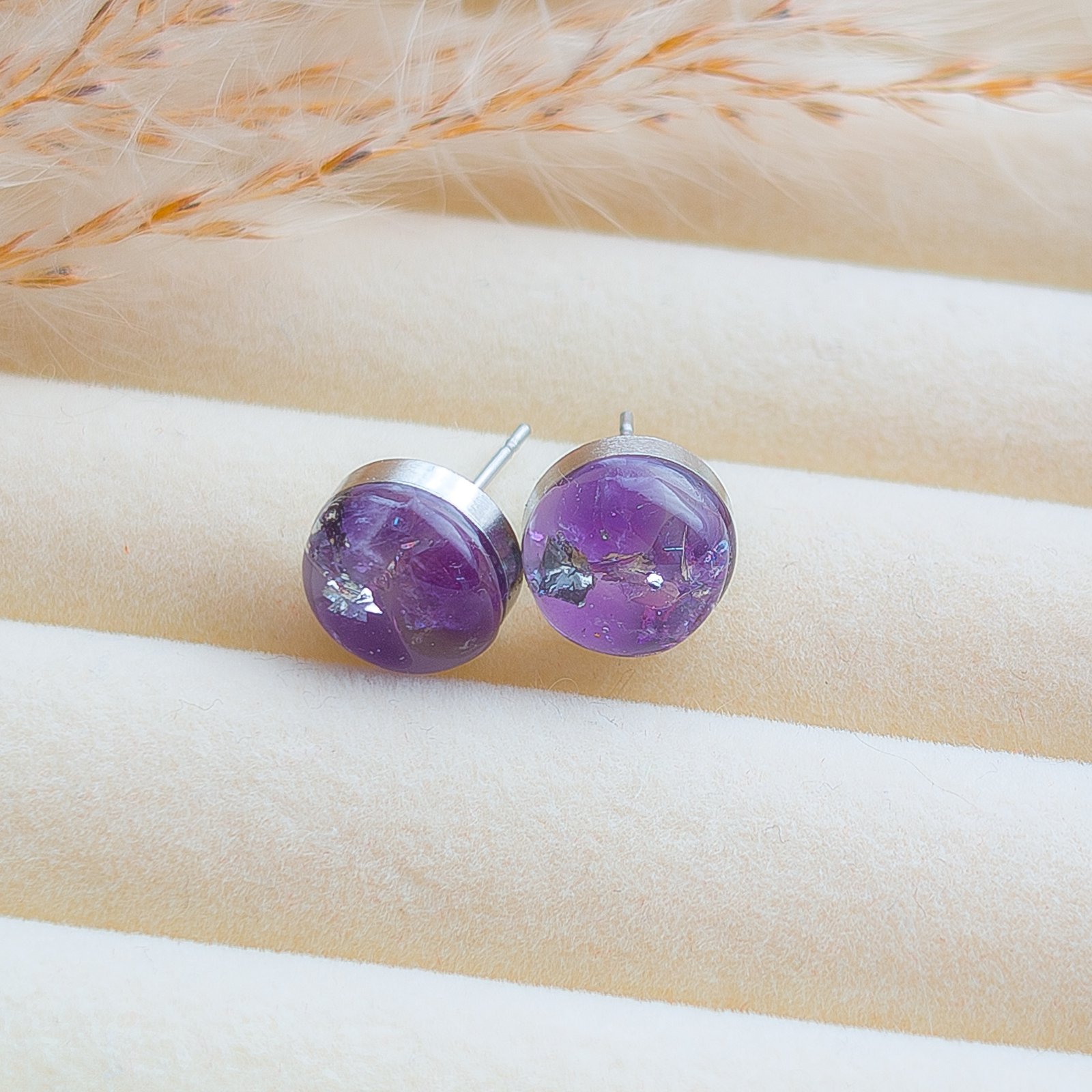 Beautiful stud earrings with embedded natural amethyst on a white background, perfect as a subtle addition to both everyday and evening outfits. The earrings are exceptionally lightweight and comfortable to wear, catching the eye with the deep purple hue of the mineral.