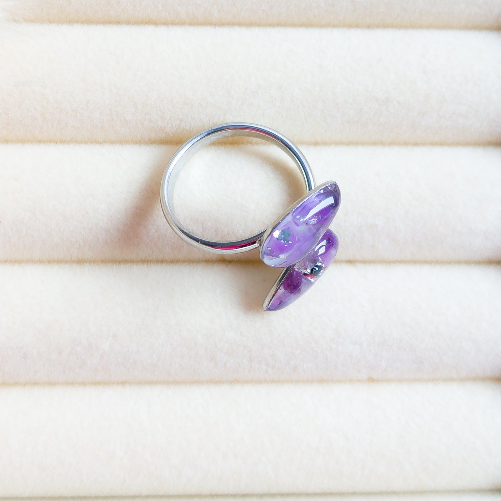 An elegant open ring featuring two teardrop-shaped elements with embedded natural amethyst fragments and silver flakes. Known as the stone of peace and harmony, amethyst provides a beautiful purple hue that pairs perfectly with the silver-toned finish.