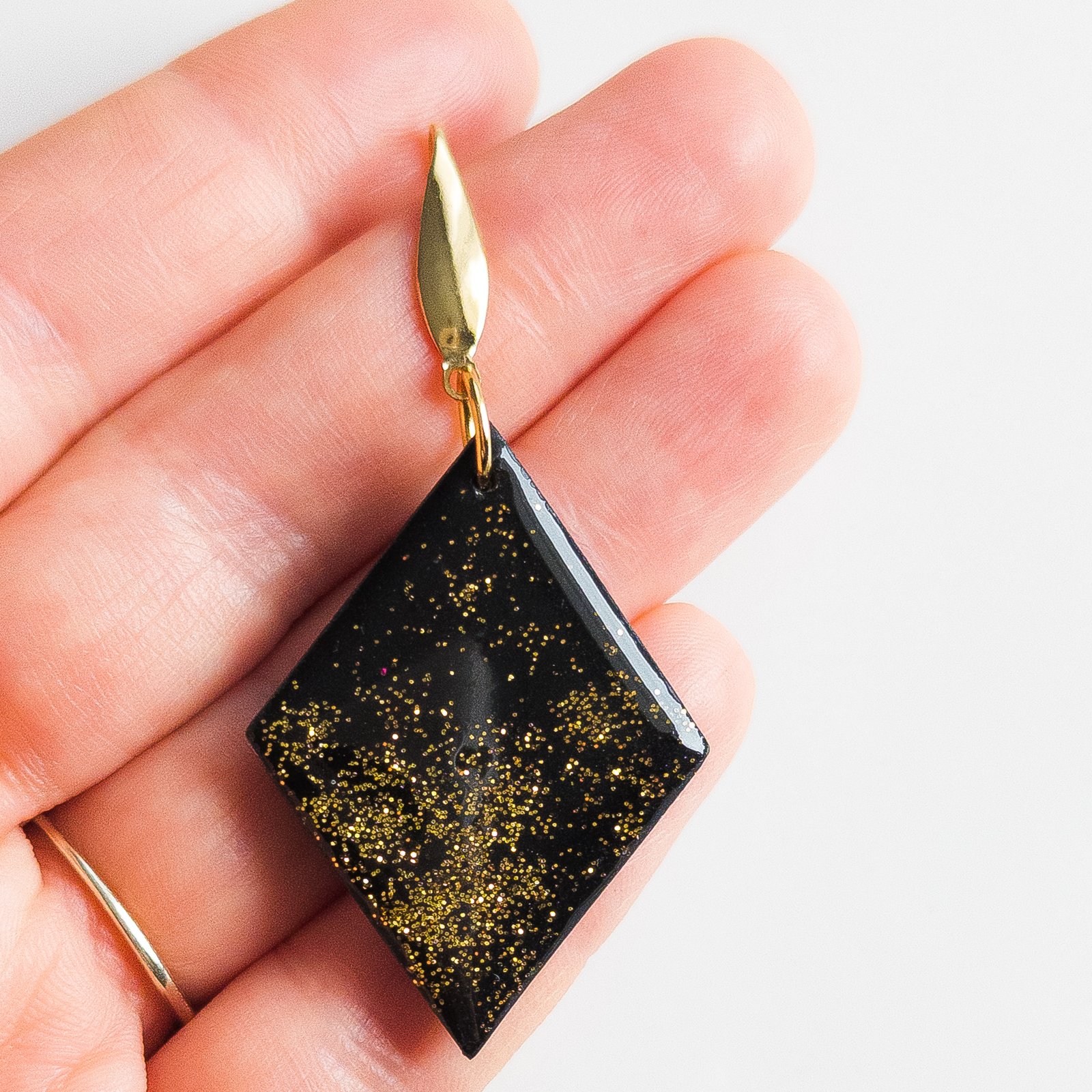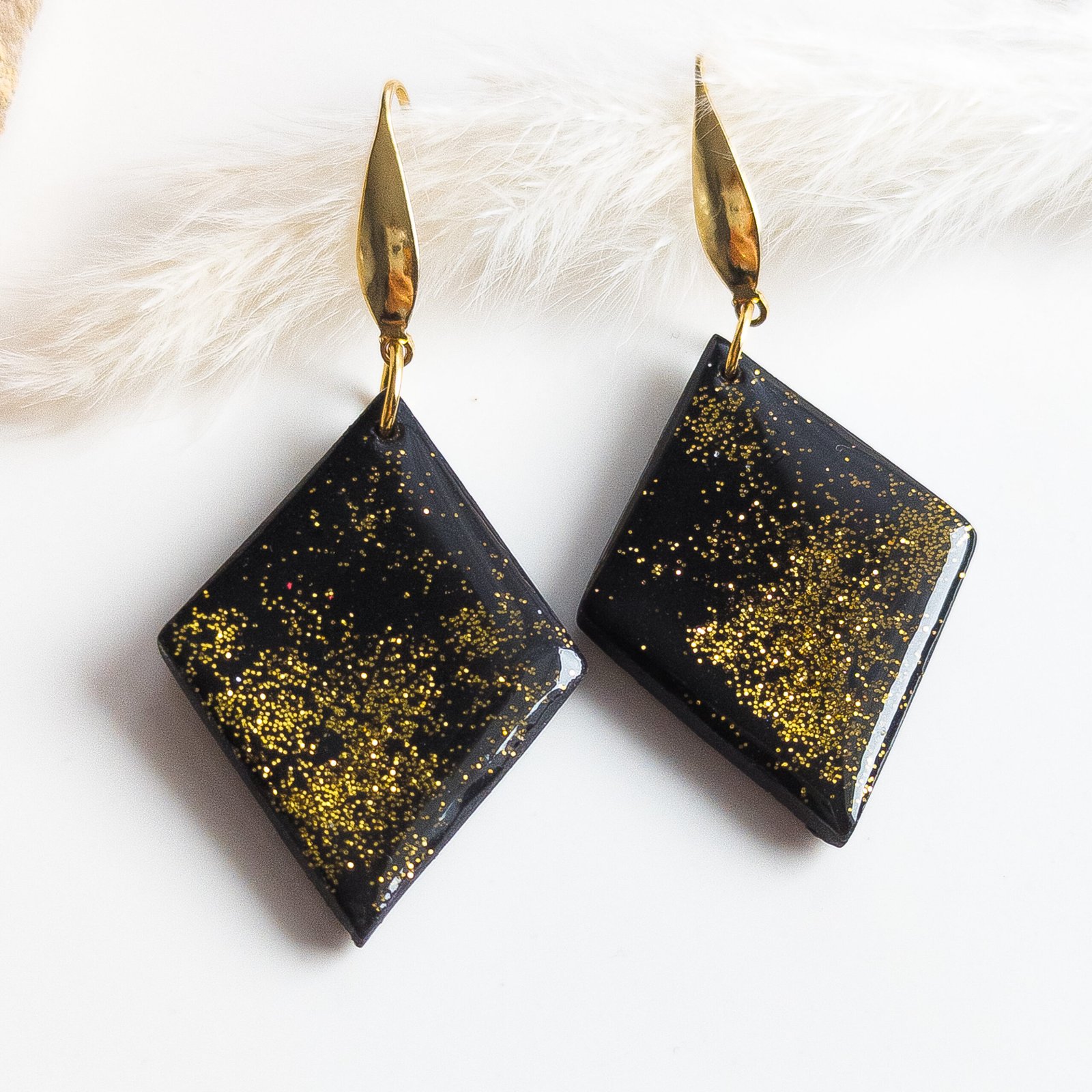 Elegant earrings made from black polymer clay coated with a glossy layer of resin containing gold glitter, which on the deep black background looks like scattered stars in the night sky.