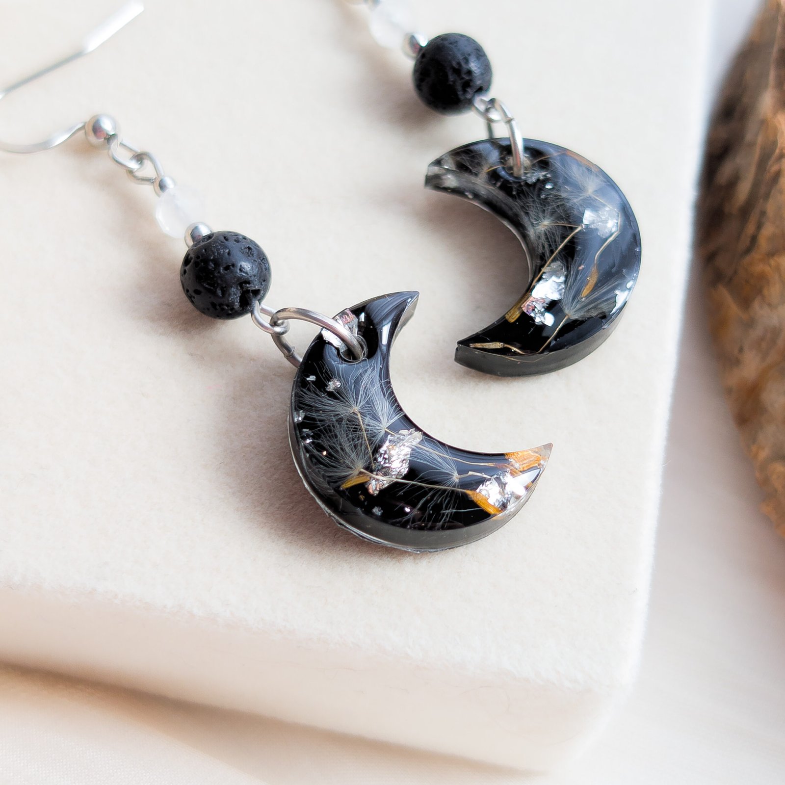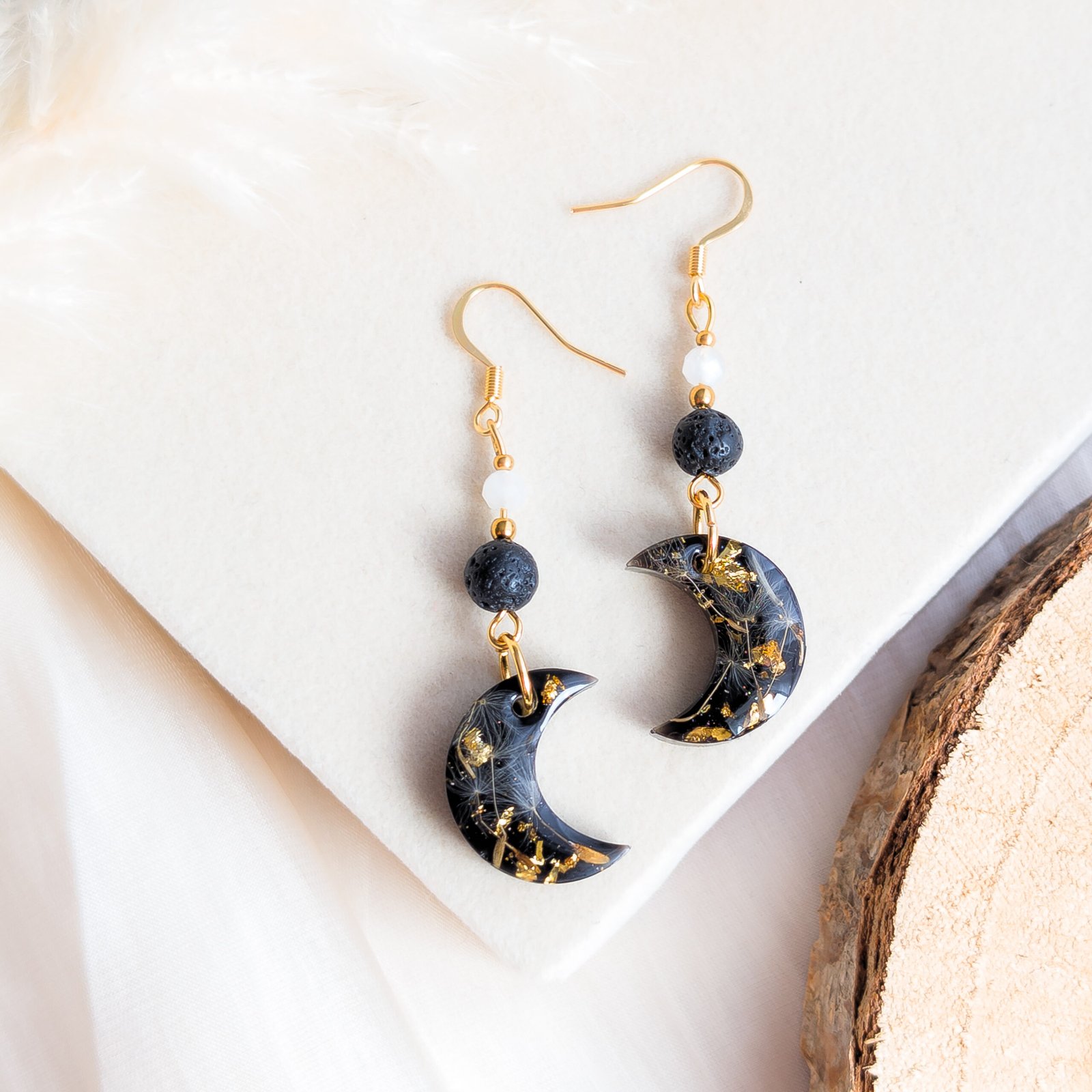 Beautiful crescent moon earrings featuring embedded dandelion seeds, available in two versions: gold and silver. The combination of dandelion seeds on a dark background, accented with natural lava stone and luminous moonstone, creates a mystical and elegant piece of jewellery.
