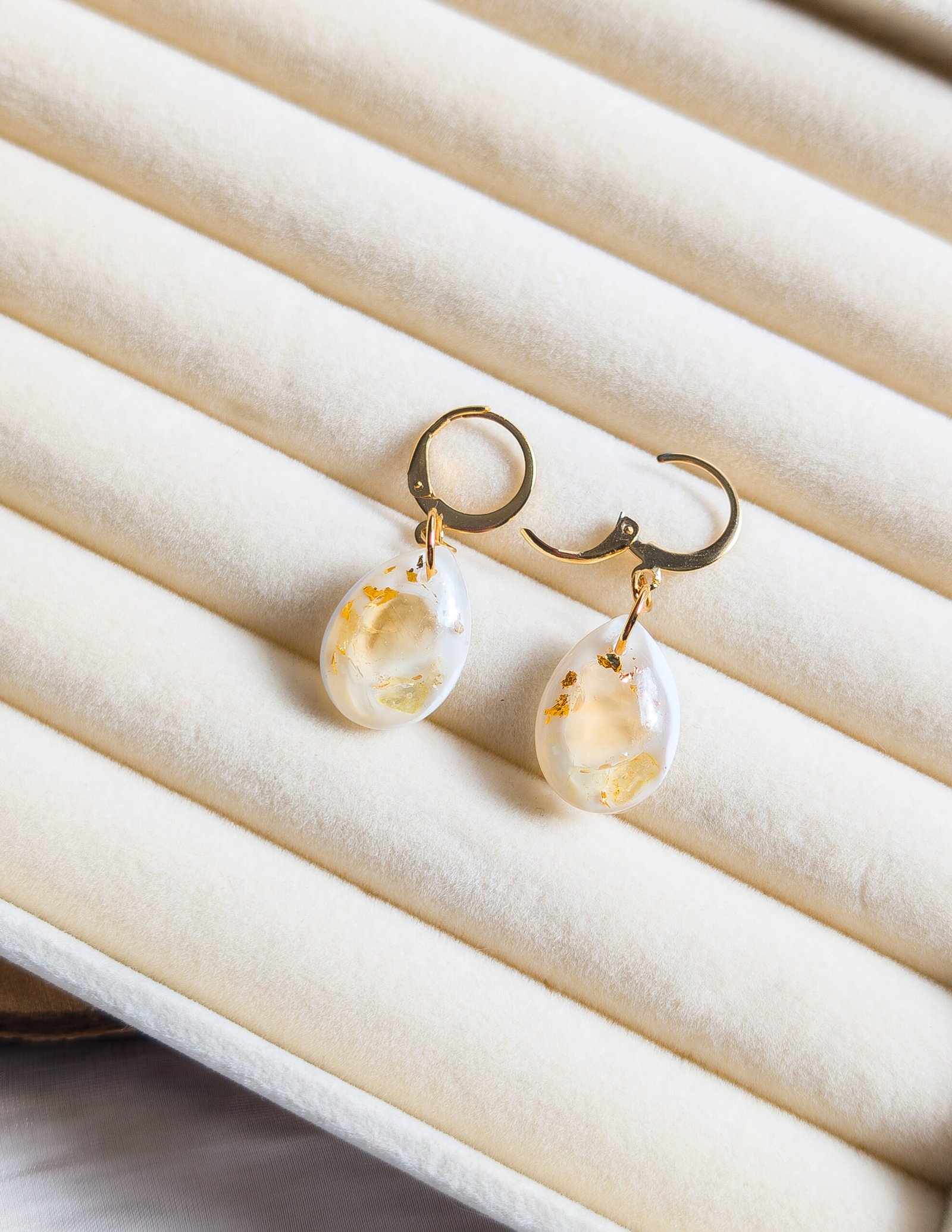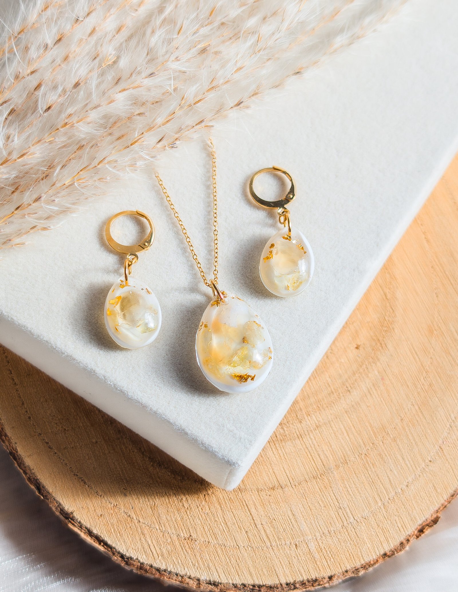 Elegant jewellery set with citrine embedded in resin on a white background with gold flecks – necklace with 3 cm pendant on a 45 cm chain + 5 cm extender, and earrings 3 cm long. All metal parts made of stainless steel, lightweight and durable jewellery. Citrine symbolises abundance, success, positive energy, self-confidence, and attracting prosperity – an ideal stone for motivation and joy of life.