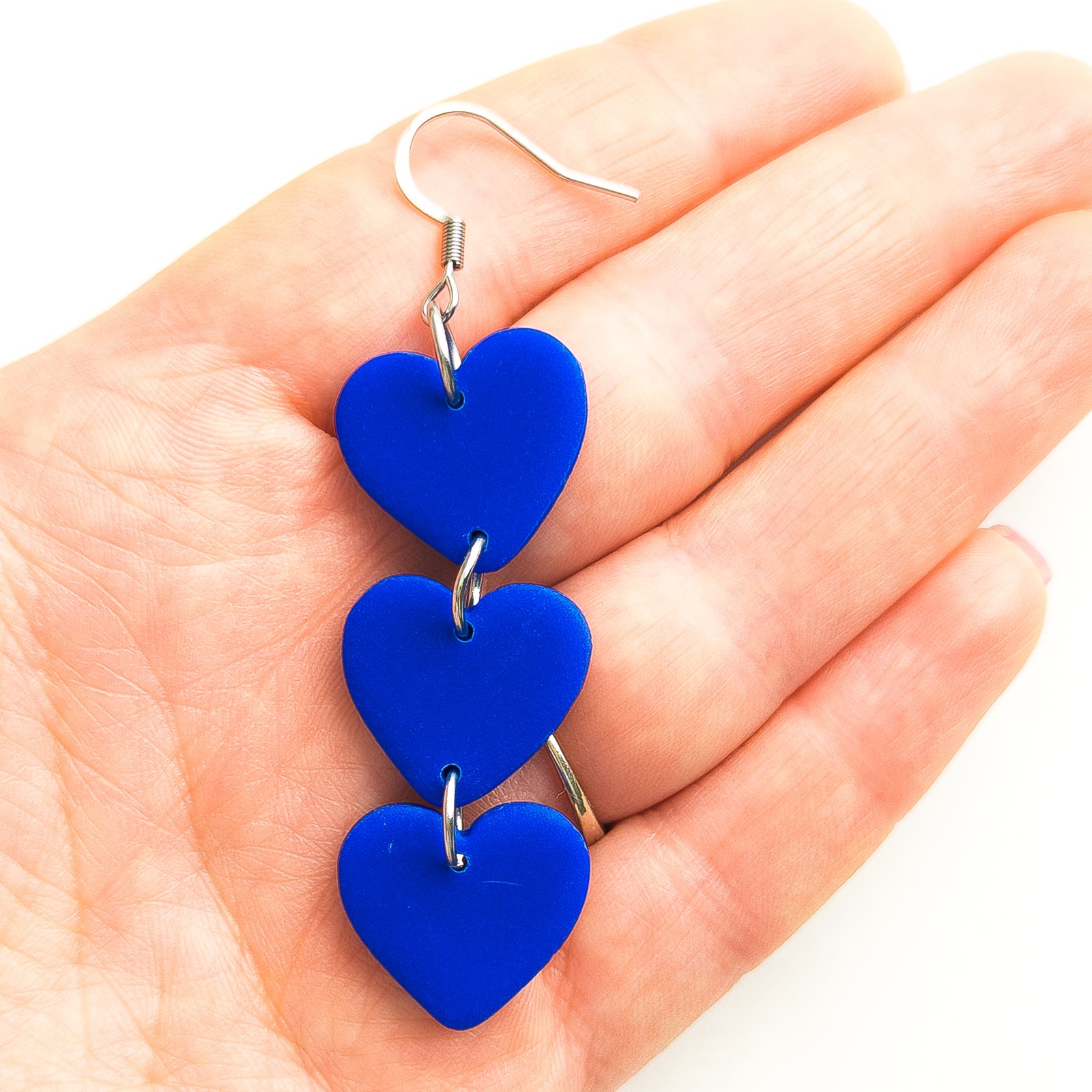 Polymer clay earrings in an intense cobalt blue shade, composed of three connected heart shapes that create a striking, elongated line along the face.