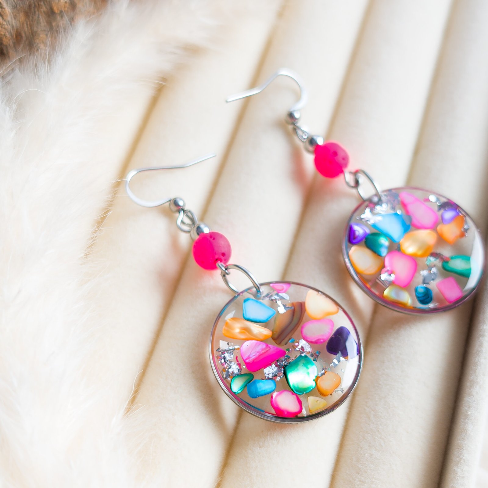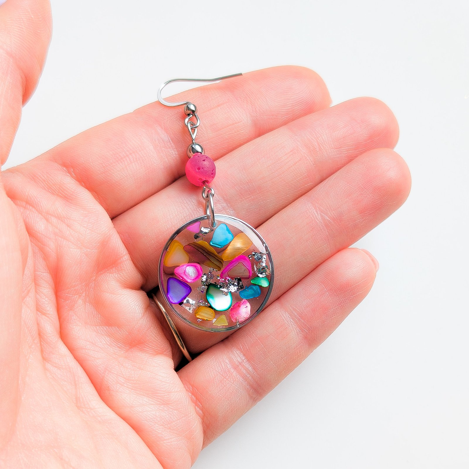 Joyful and vibrant earrings, perfect for bright spring and summer days. Multi-coloured fragments of natural sea shells and silver flakes are embedded in clear resin, shimmering beautifully in the sunlight. The design is finished with an intense pink volcanic lava bead, giving the jewellery an energetic and contemporary feel.