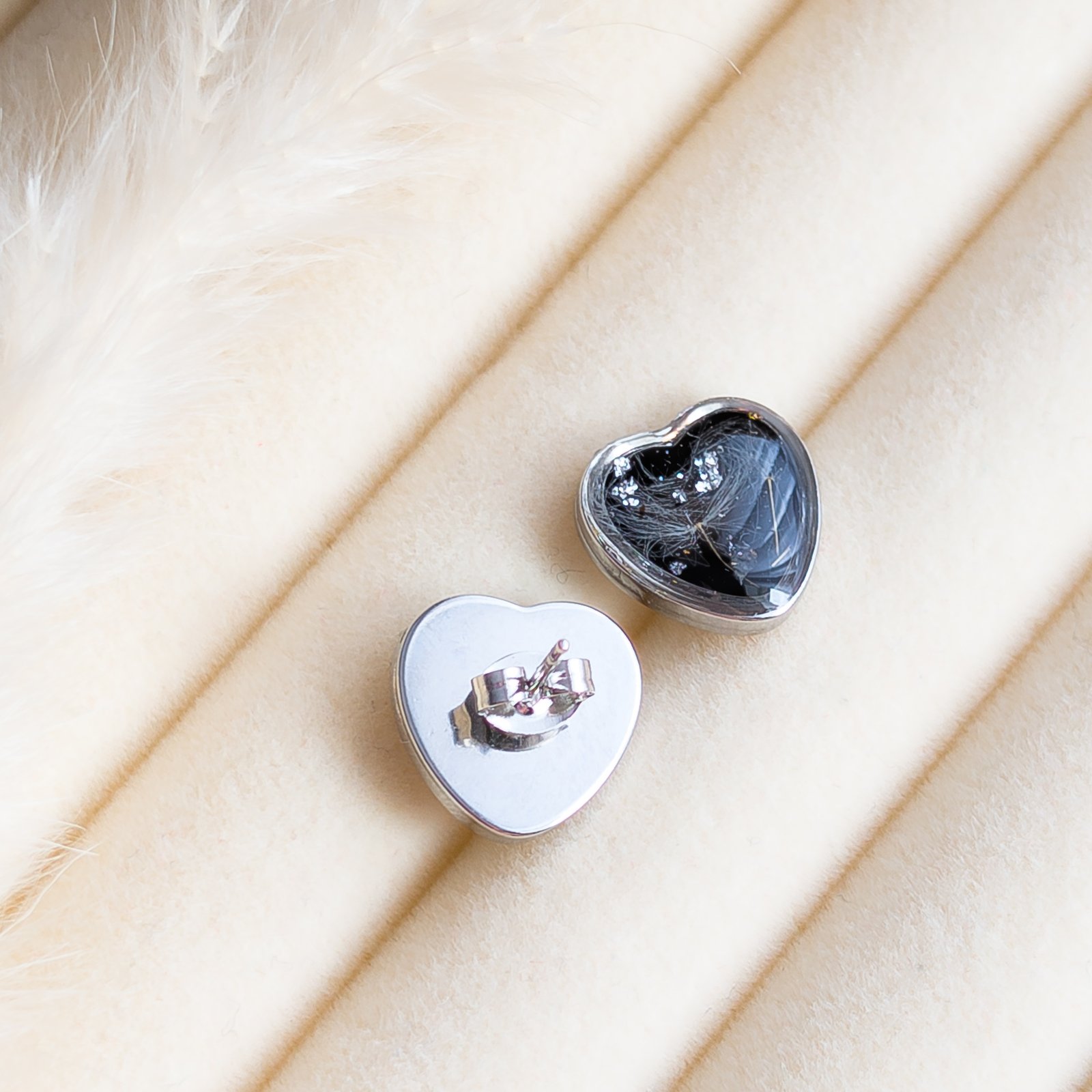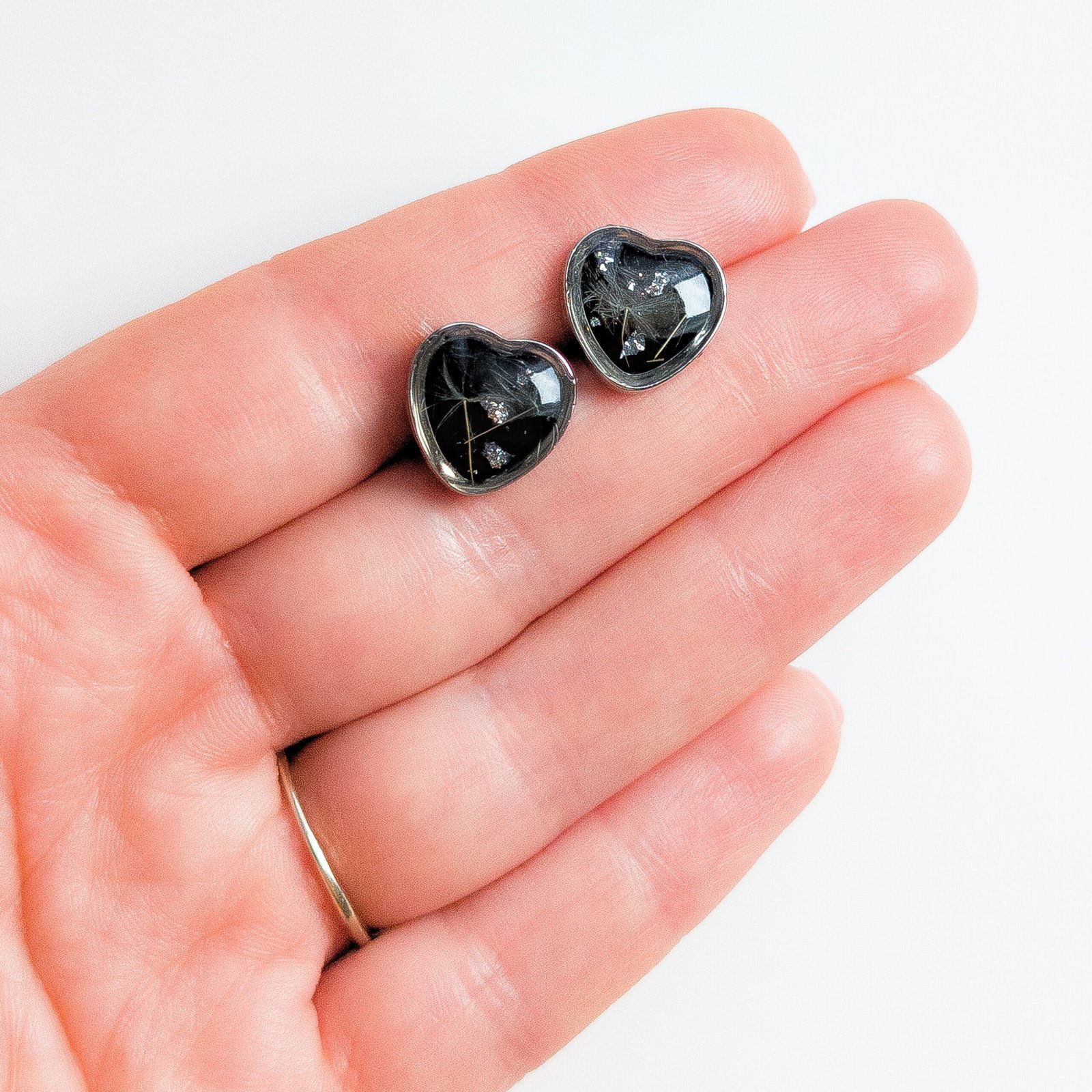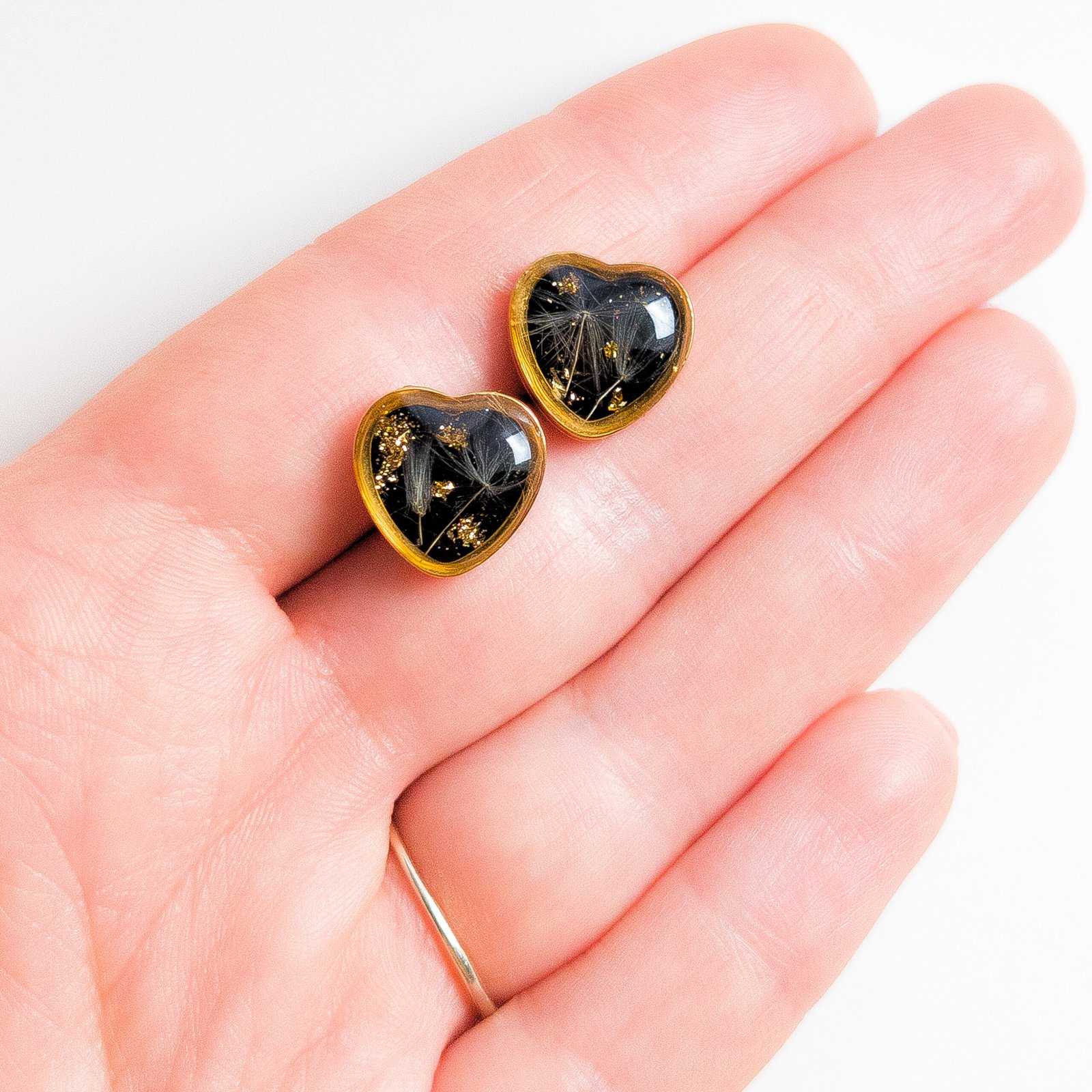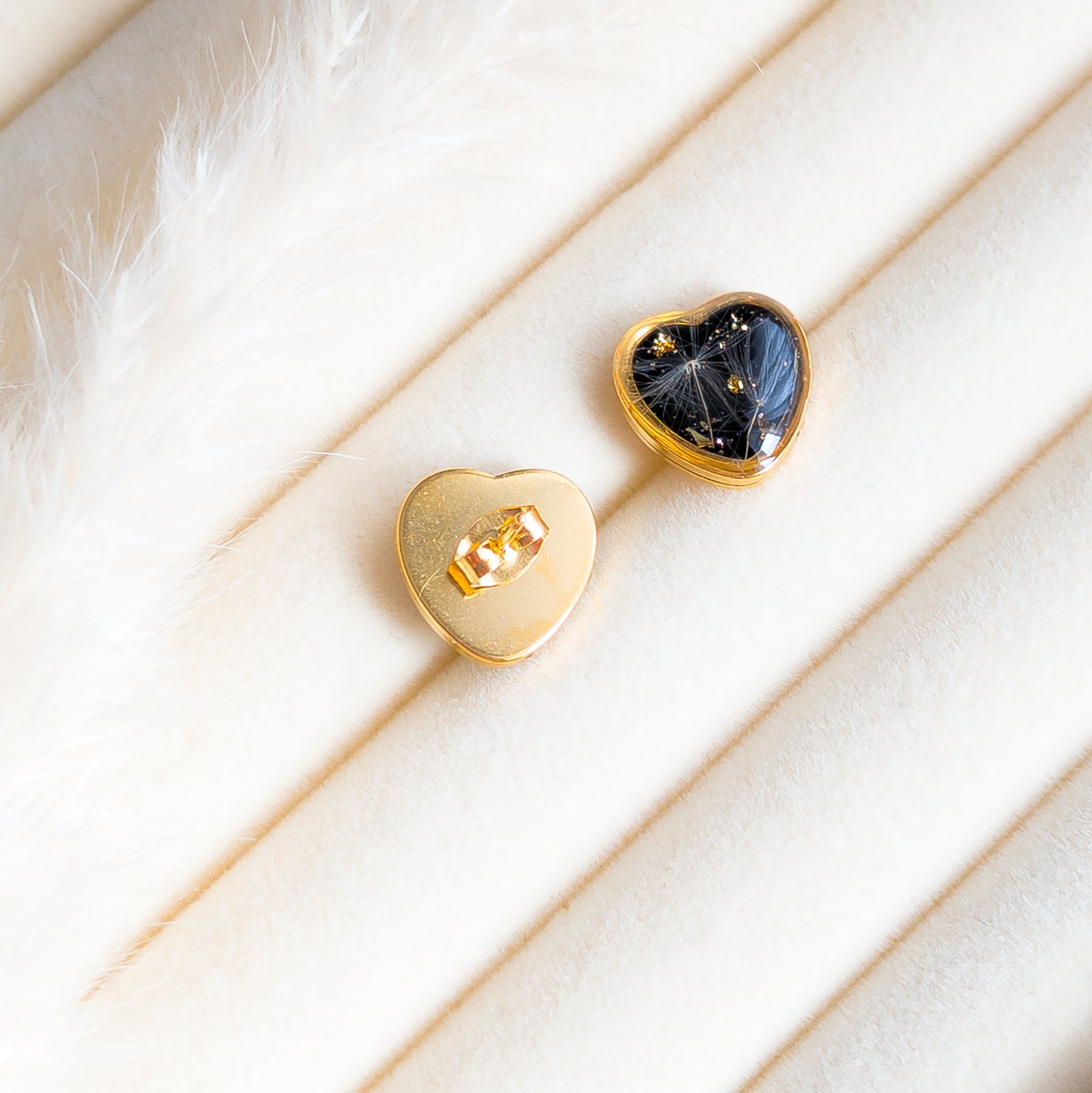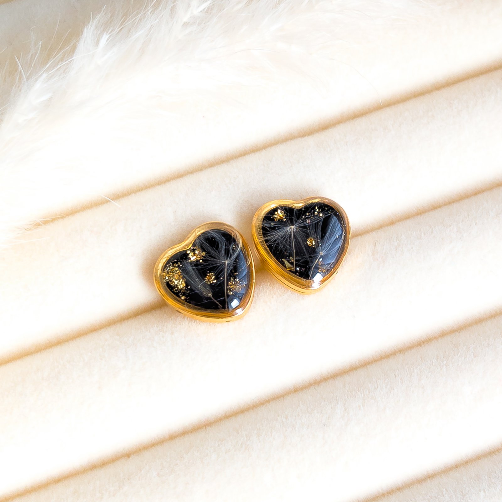 Charming heart-shaped earrings featuring embedded dandelion seeds, available in two elegant versions: gold and silver. The delicate dandelion seeds set against a dark background create a unique, magical effect that captures the eye.