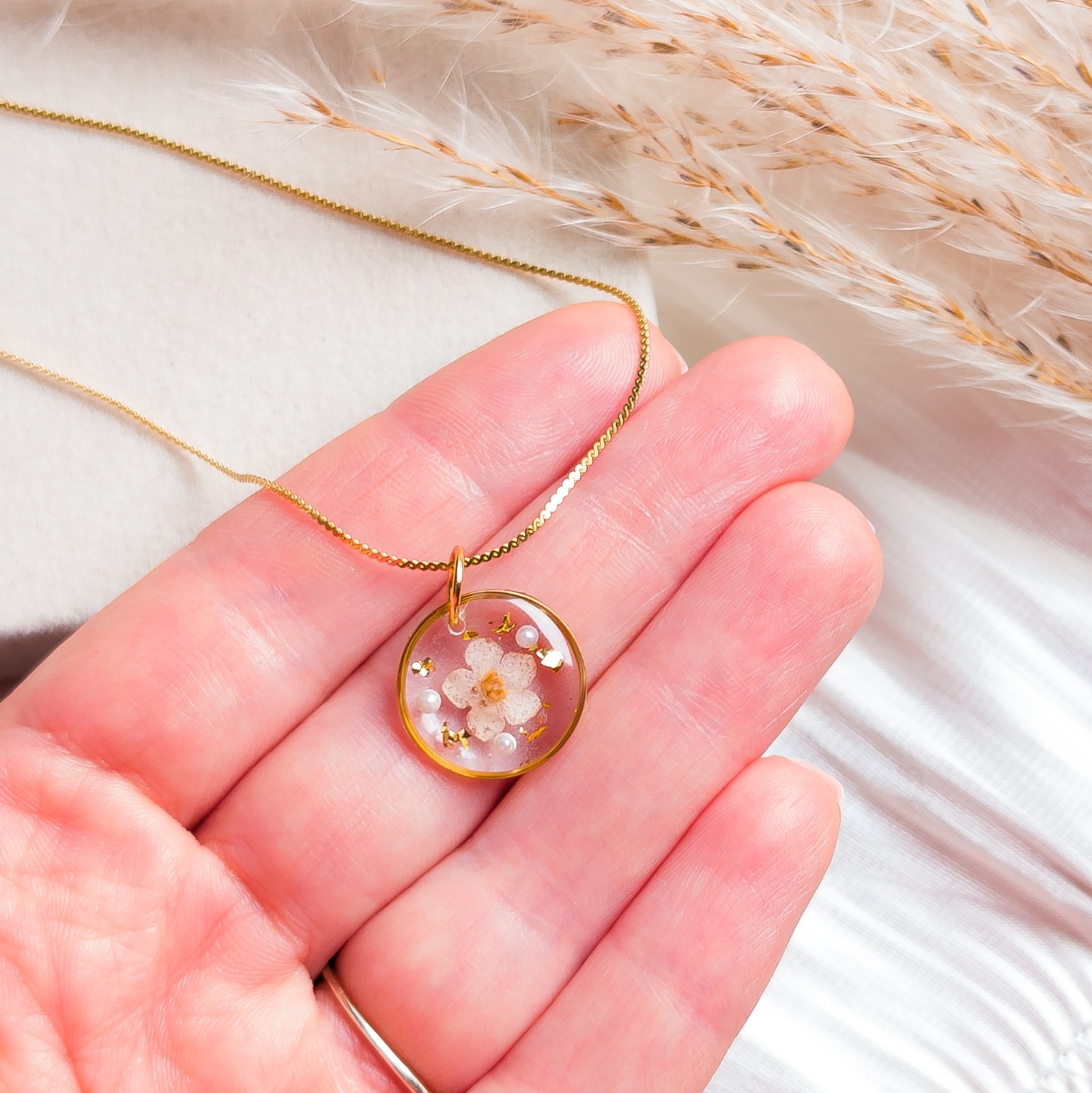 Beautiful and extremely delicate necklace with an embedded natural white flower, subtle pearls, and gold foil flakes. This is an ideal choice for those who appreciate delicate jewellery that adds lightness and a romantic touch to any outfit.