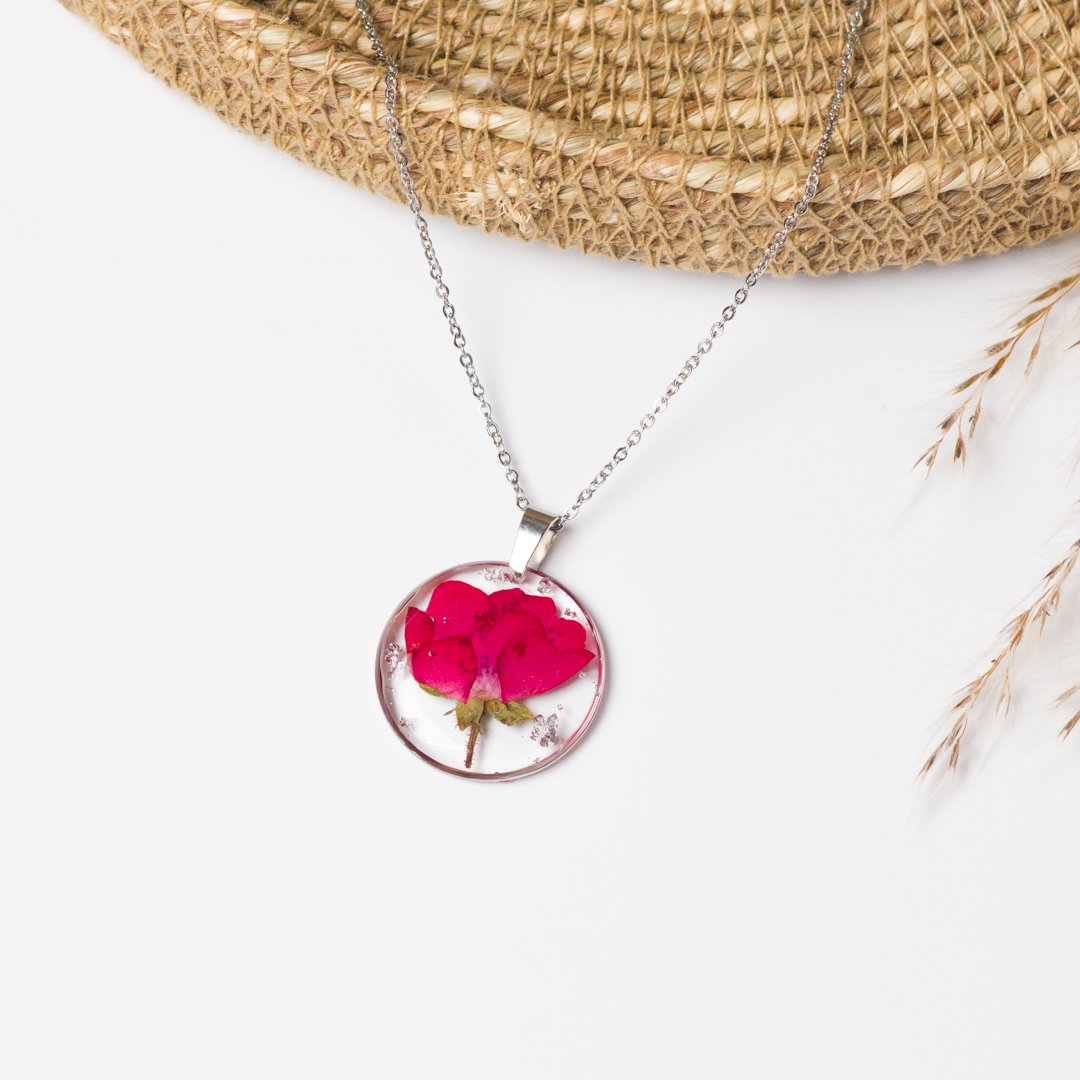 Capture the beauty of nature with this stunning handmade pendant necklace. Featuring a real dried rose delicately preserved in clear resin, this piece showcases the timeless elegance of natural florals. Encased in a sleek metal frame and suspended from a fine chain, the pendant is lightweight and comfortable for everyday wear or special occasions. Its minimalist yet sophisticated design makes it a perfect gift or a unique addition to any jewellery collection.