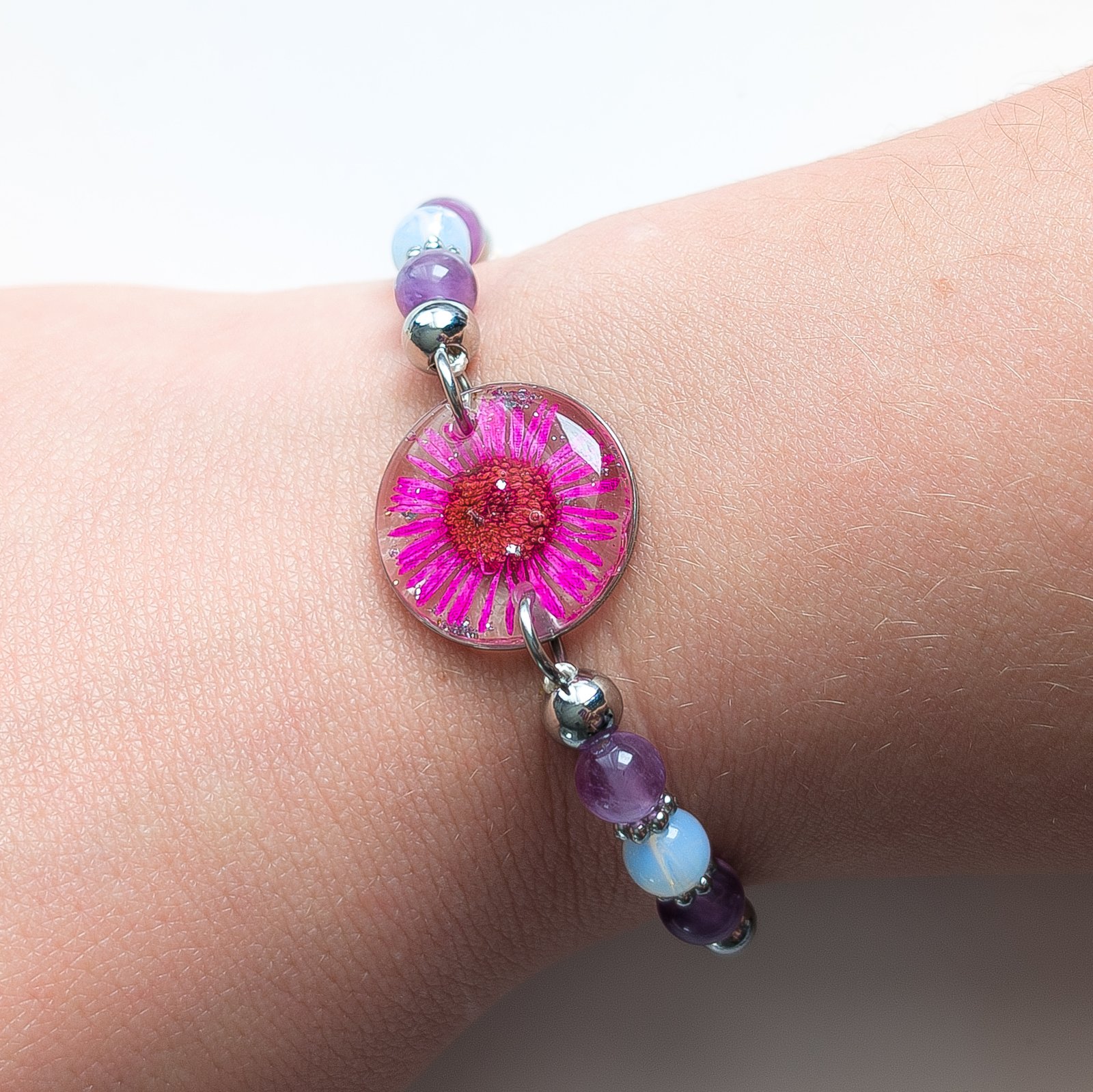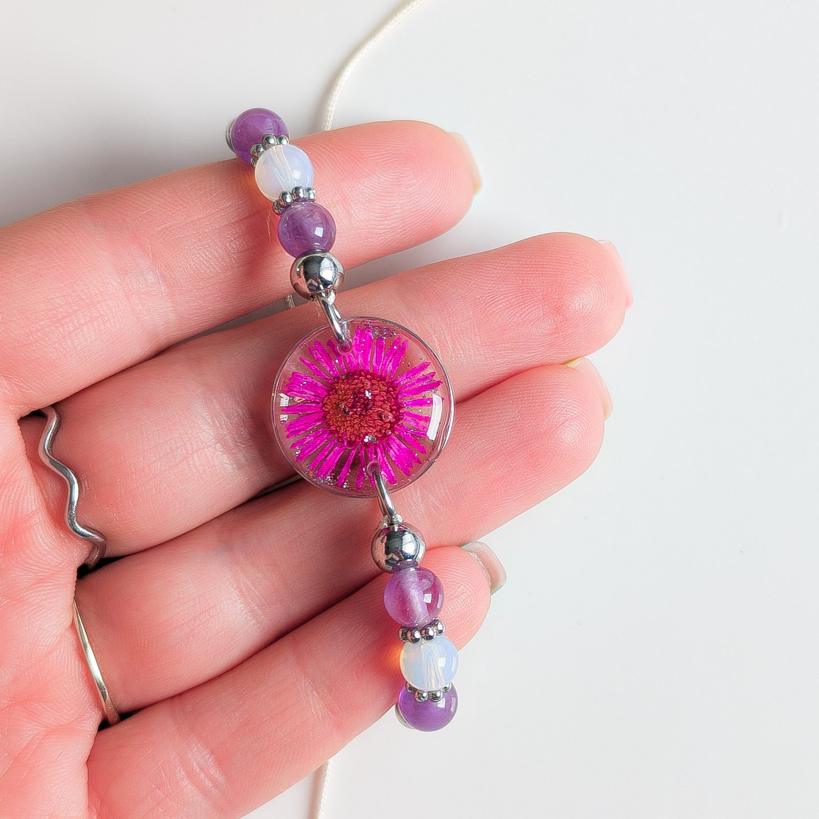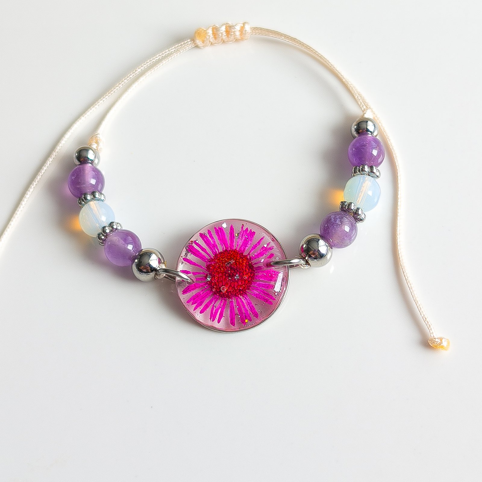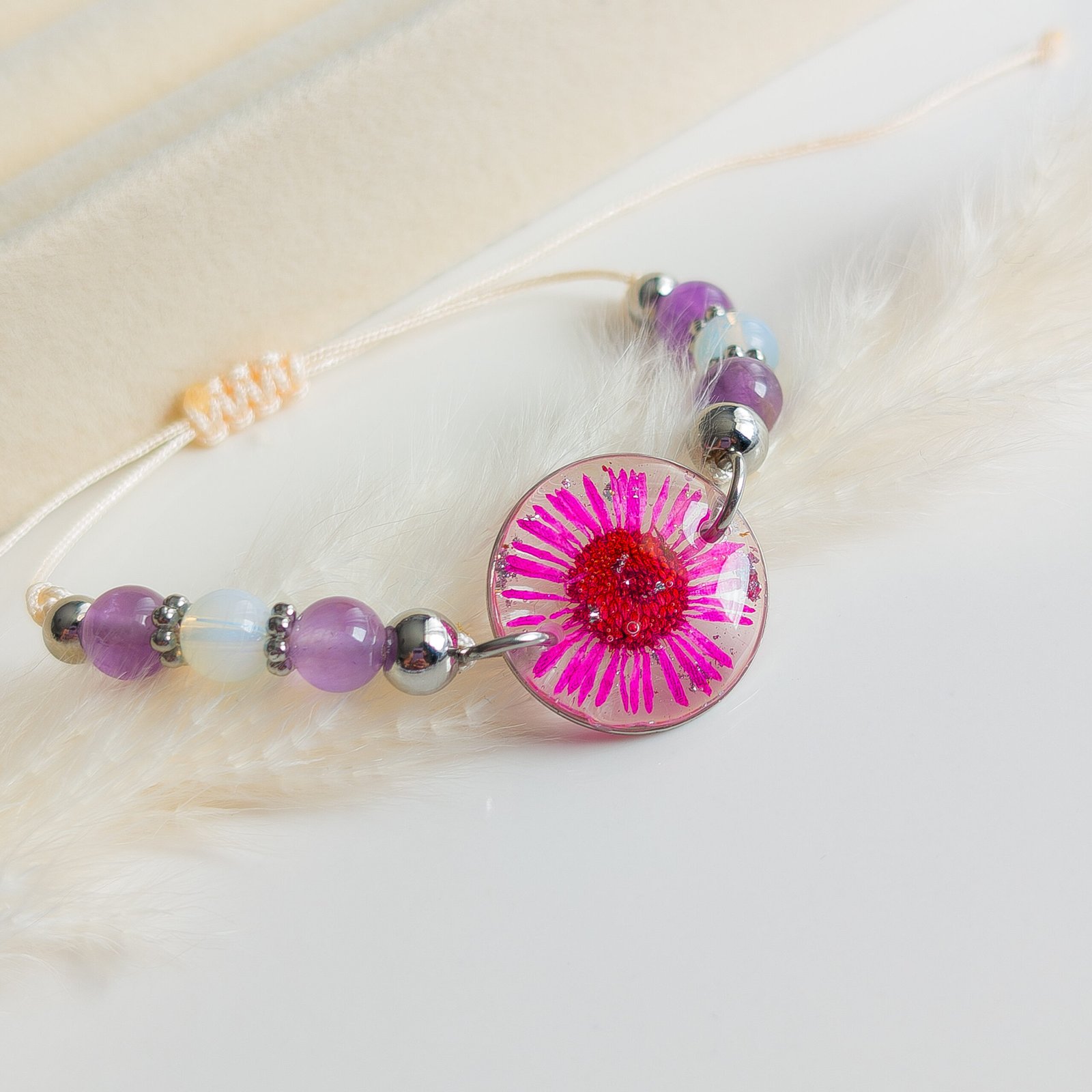 A delicate bracelet with a floral charm in a vivid pink shade, complemented by opalite and amethyst beads. This combination gives the piece a soft, elegant look while still feeling light, feminine and eye-catching.