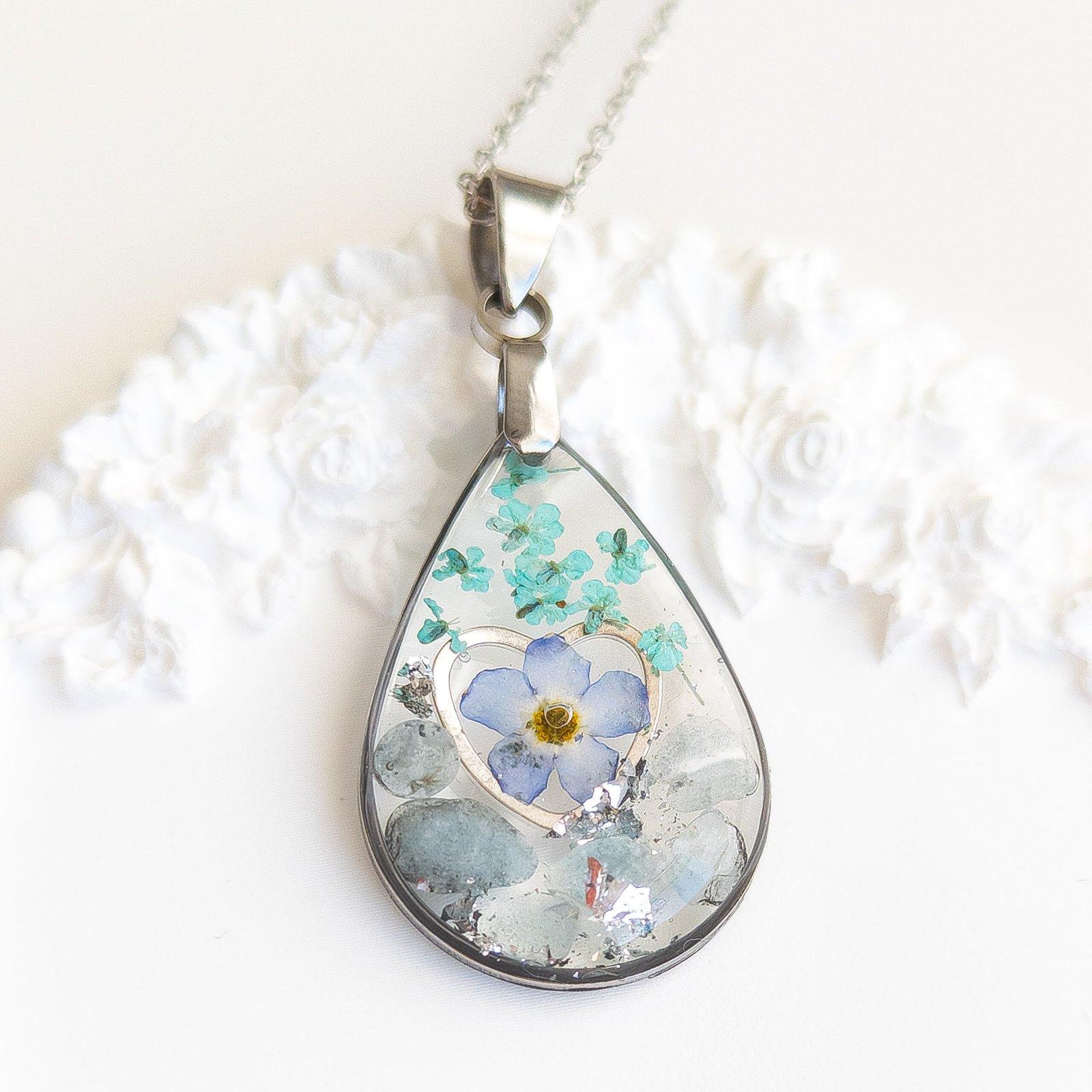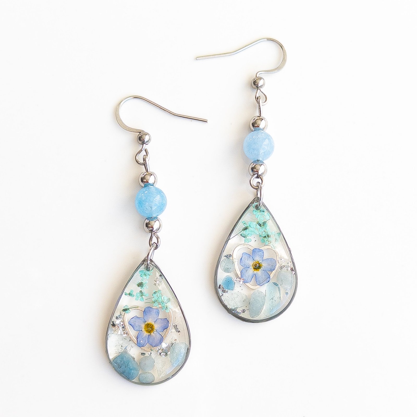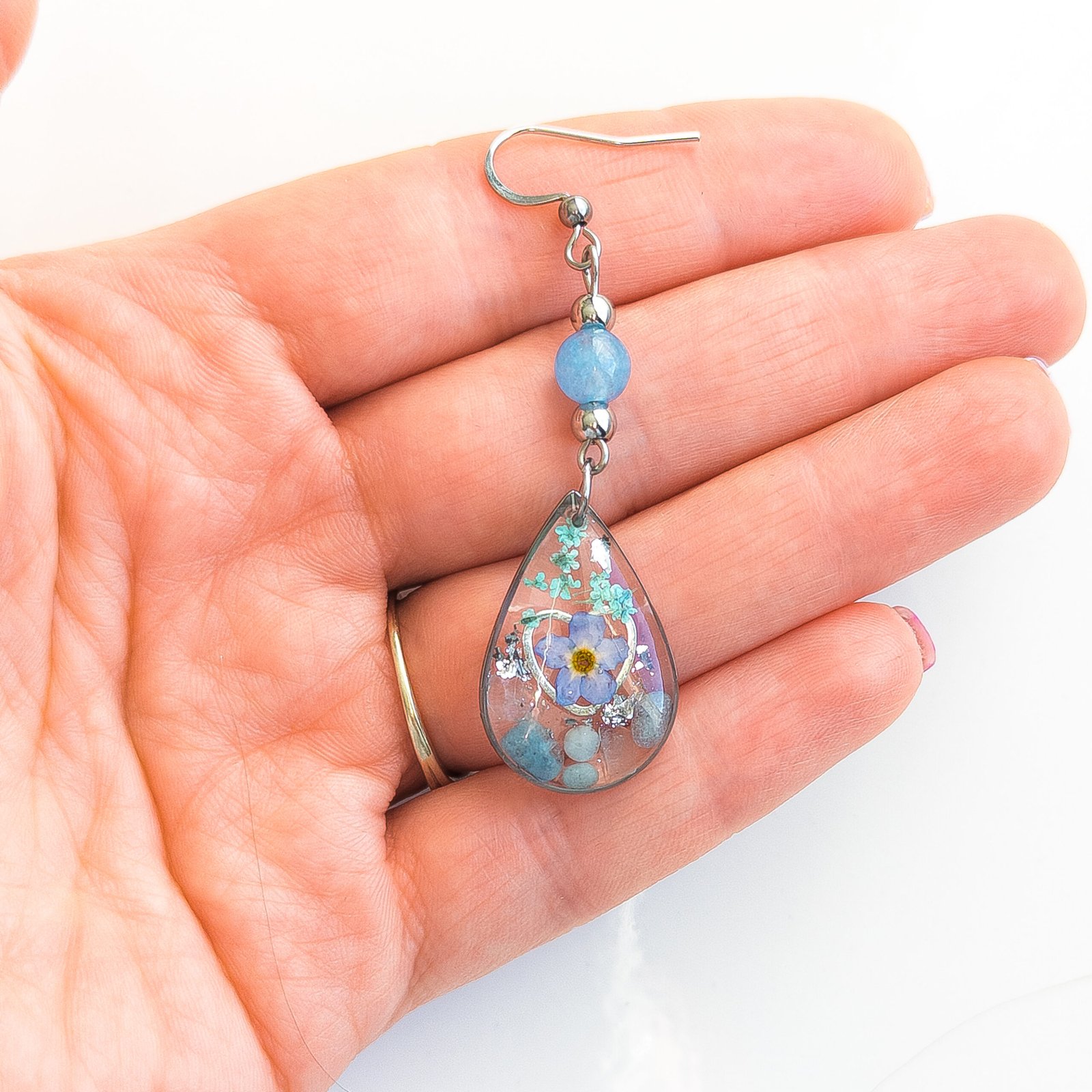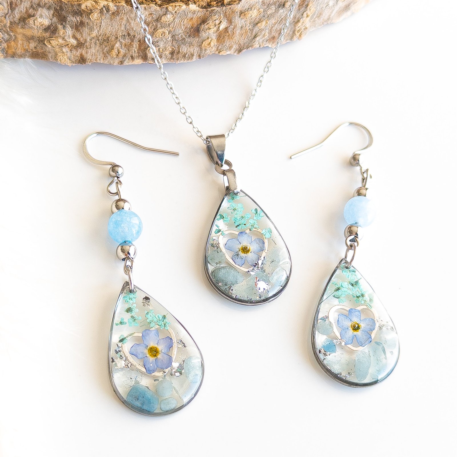 Delicate stainless steel jewellery set with a forget-me-not flower embedded in resin, aquamarine stones and light blue wild carrot flowers. The earrings are additionally adorned with round aquamarine beads that beautifully enhance the cool, pastel character of the design.