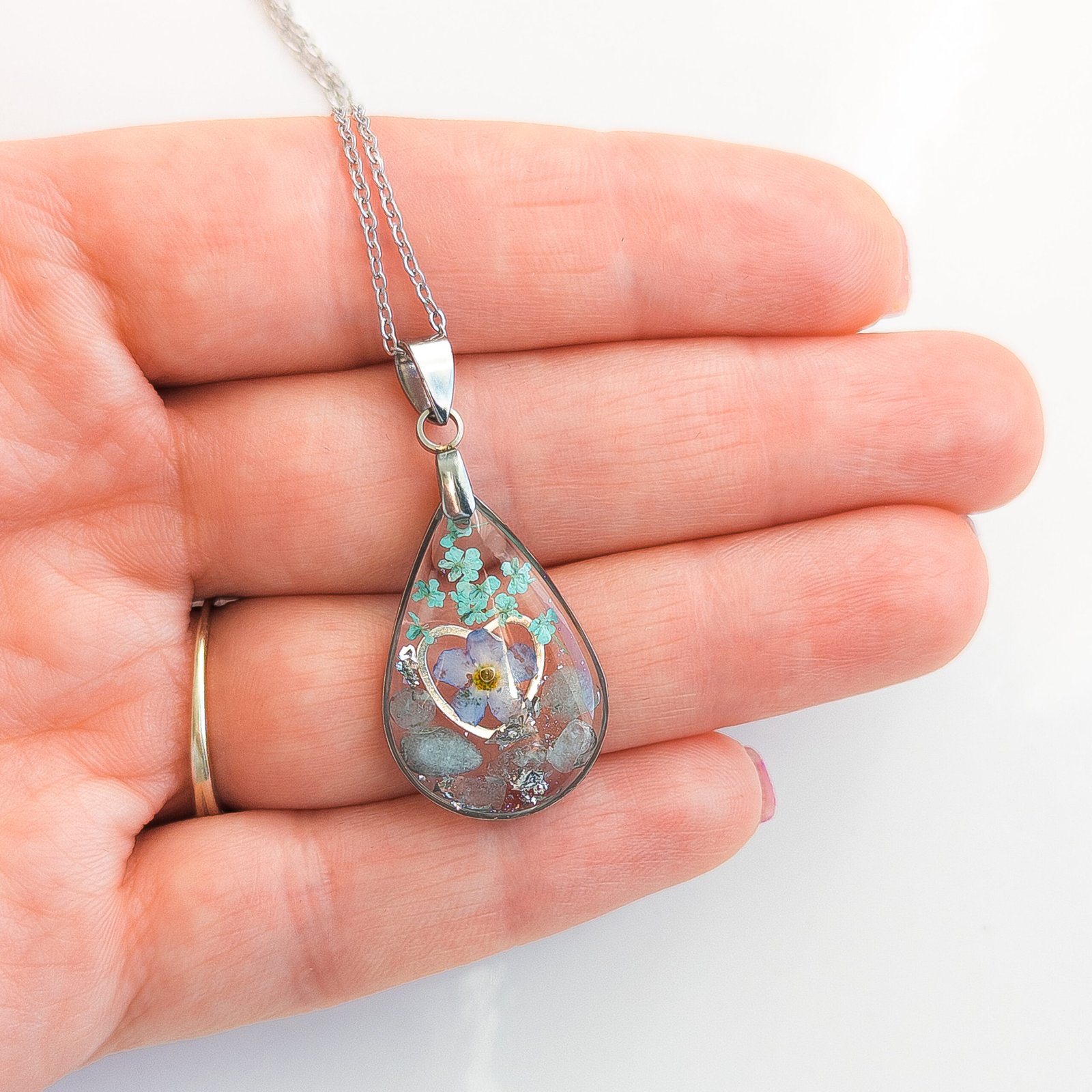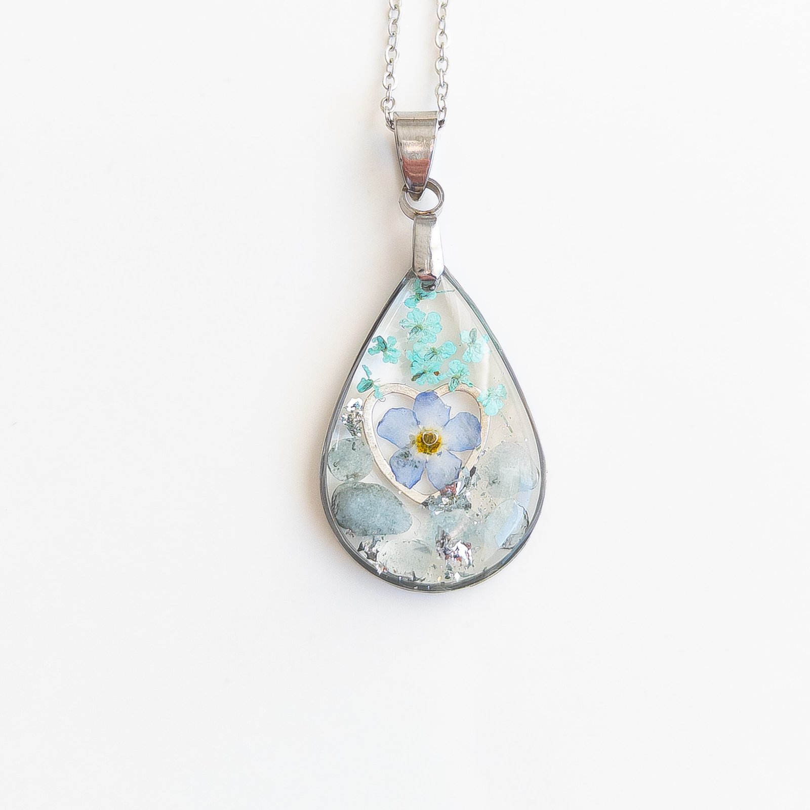 Aquamarine has long been regarded as a stone of calm, courage and harmony in relationships, often associated with the cleansing energy of water and supporting honest communication. The forget-me-not symbolises remembrance, loyalty and a lasting bond with a loved one, which is why it is often chosen to express love and friendship that endures over time.