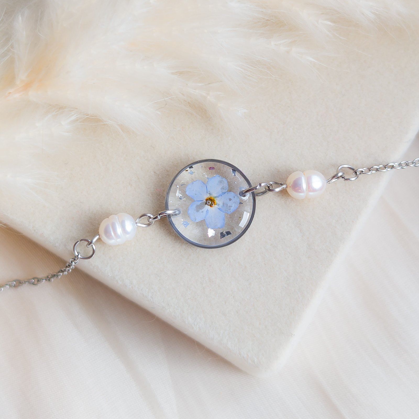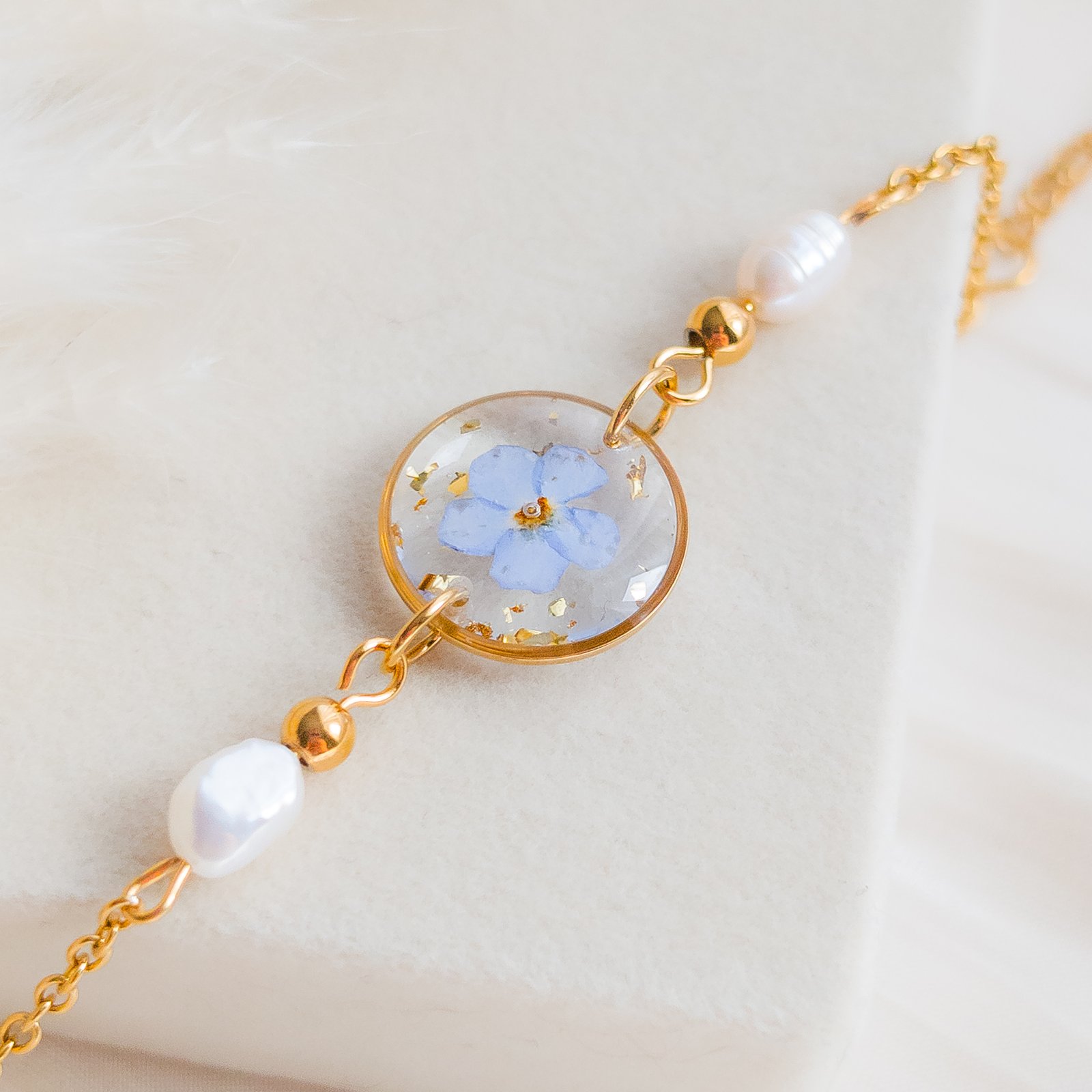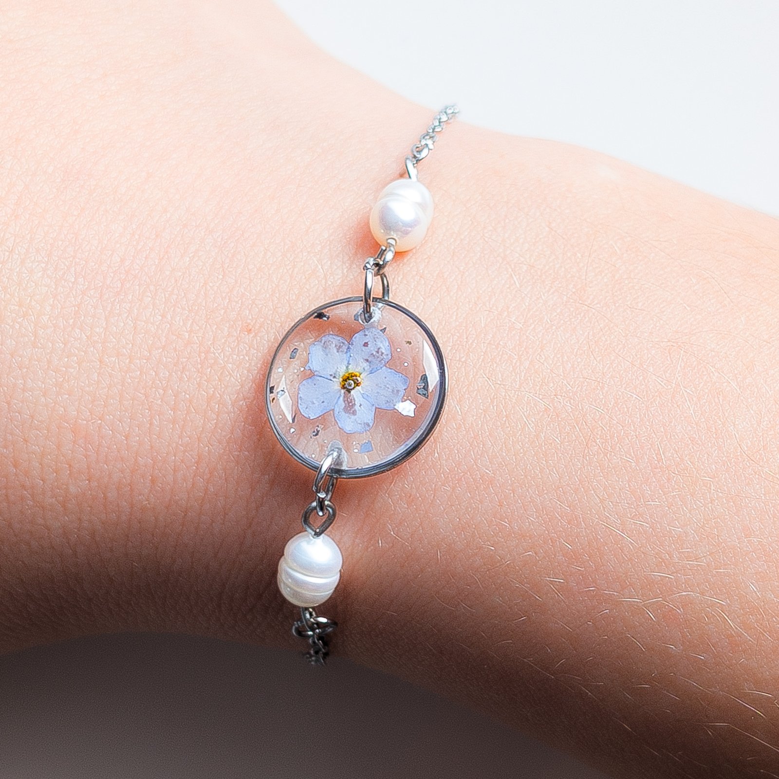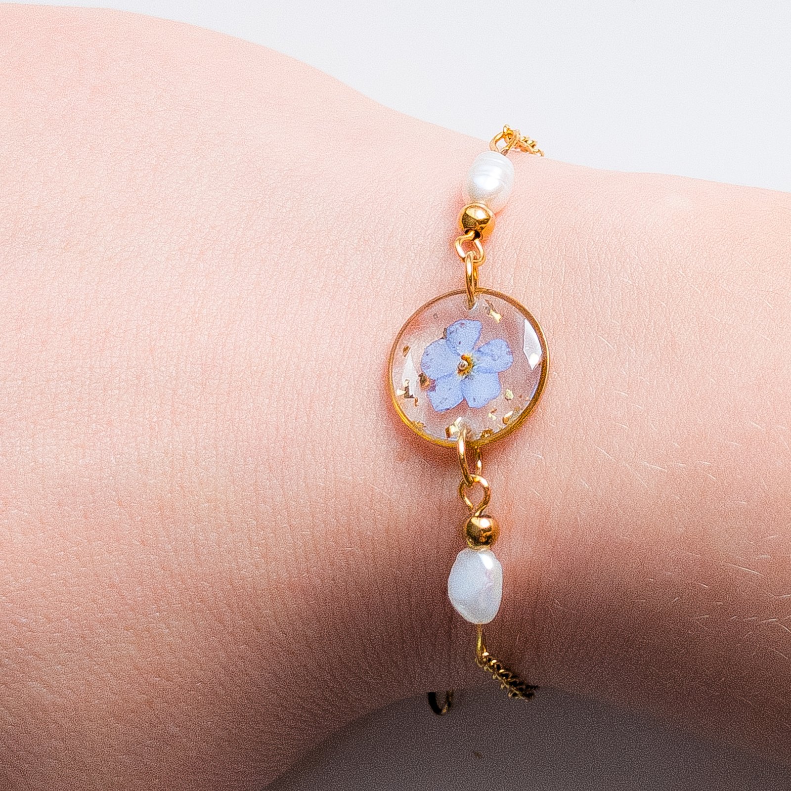 A delicate bracelet featuring a real embedded forget-me-not flower and subtle freshwater pearls, available in both gold and silver versions. The combination of the blue flower with classic pearls creates a graceful piece of jewellery, perfect as a gift or a sentimental accessory.