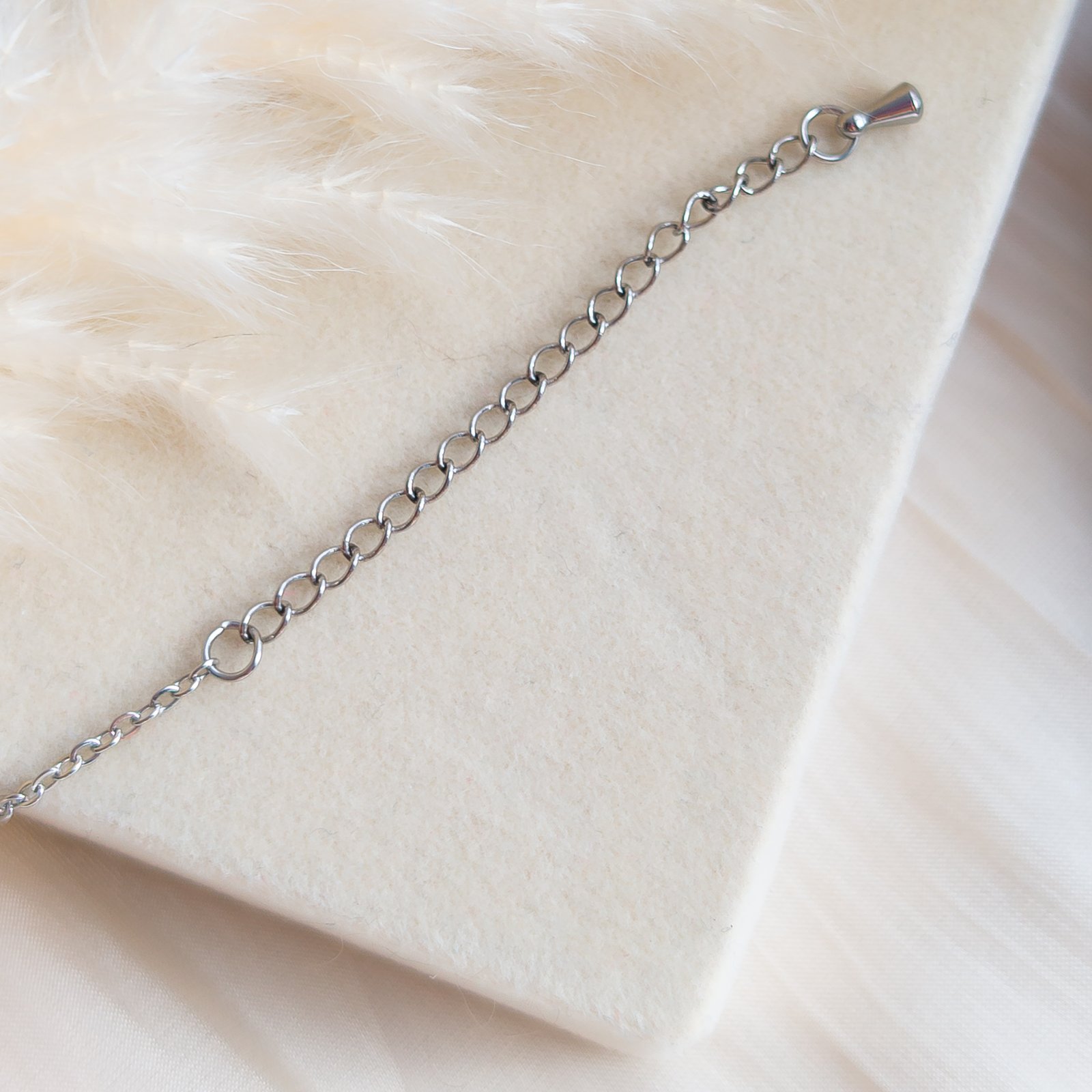 The central flower pendant measures 1.5 cm. The bracelet is 16 cm long with a 5 cm extension for a comfortable fit. All metal components are made of durable stainless steel.