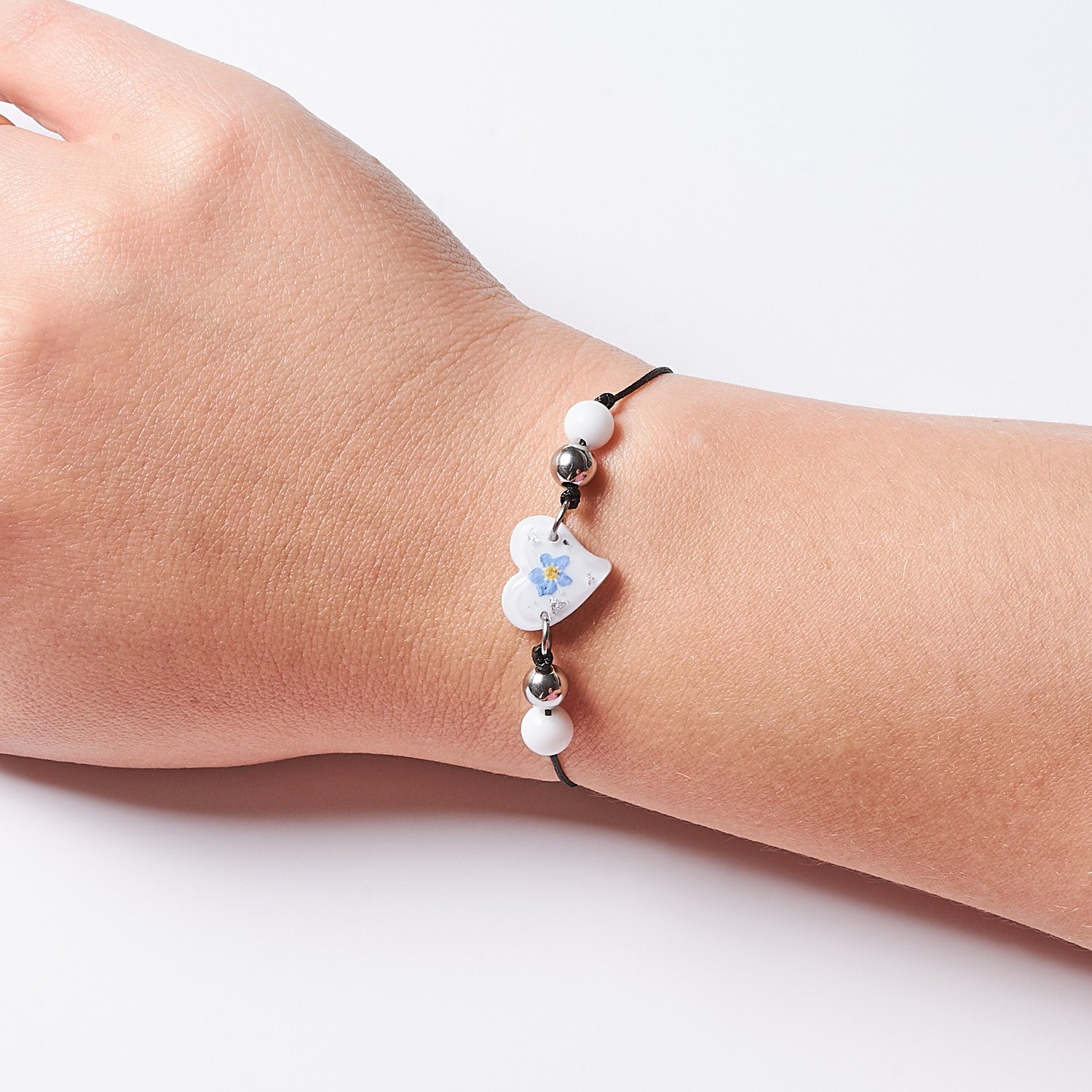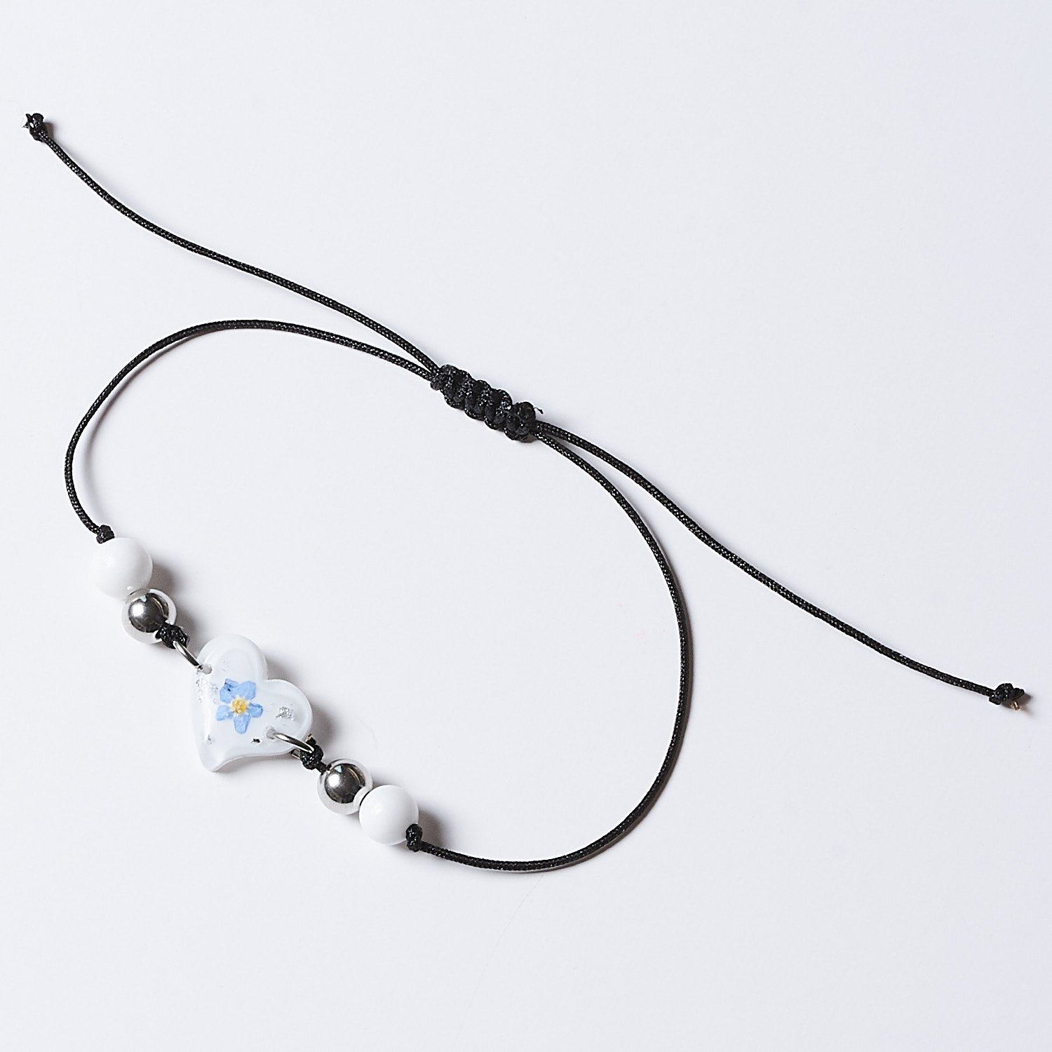A nylon string bracelet with a heart-shaped forget-me-not charm and stainless steel accents combines lightness with meaningful symbolism. The central heart charm contains a real forget-me-not flower, traditionally representing memory, fidelity, and happiness. The bracelet features a sliding, adjustable macramé clasp to fit any wrist, ensuring comfort for everyday wear.