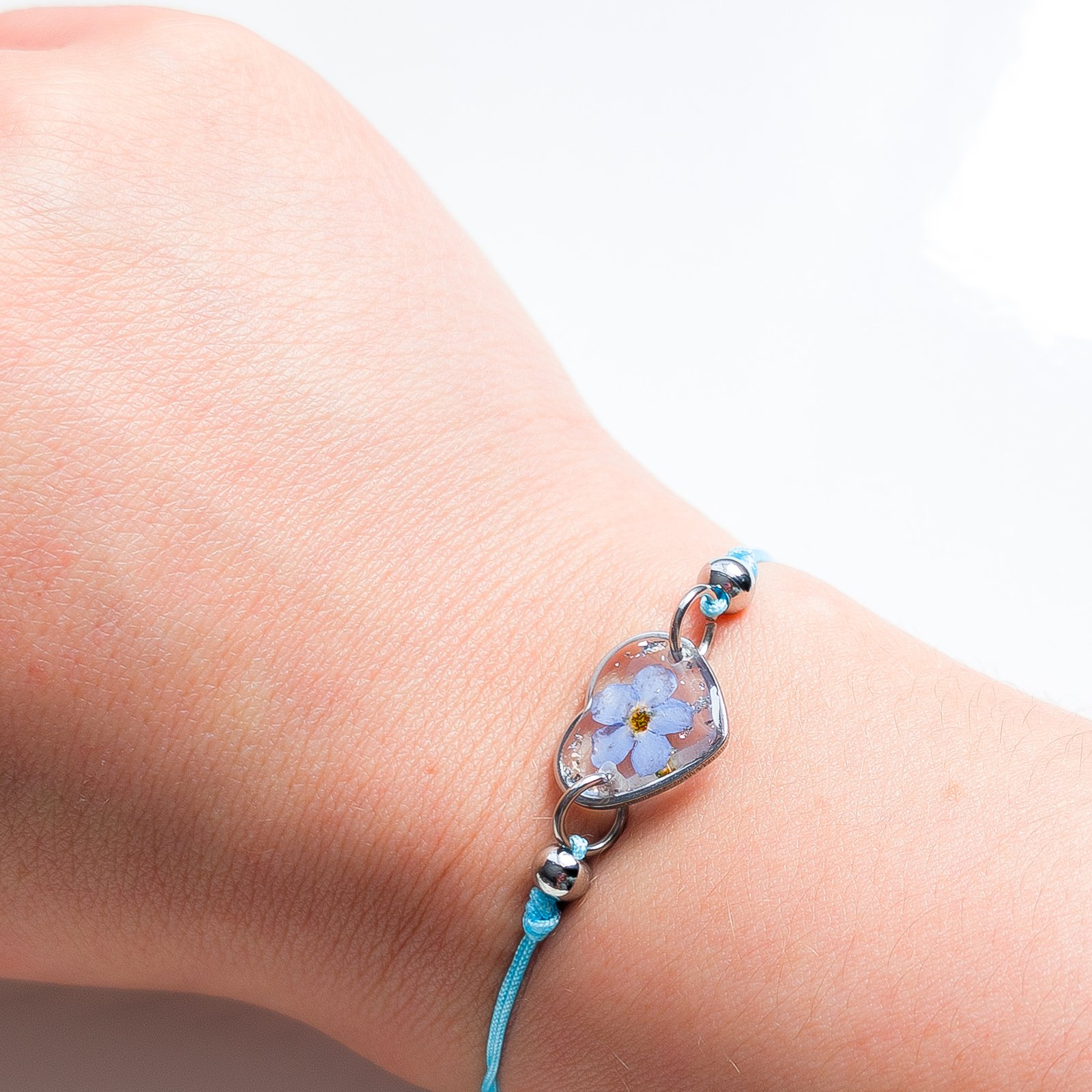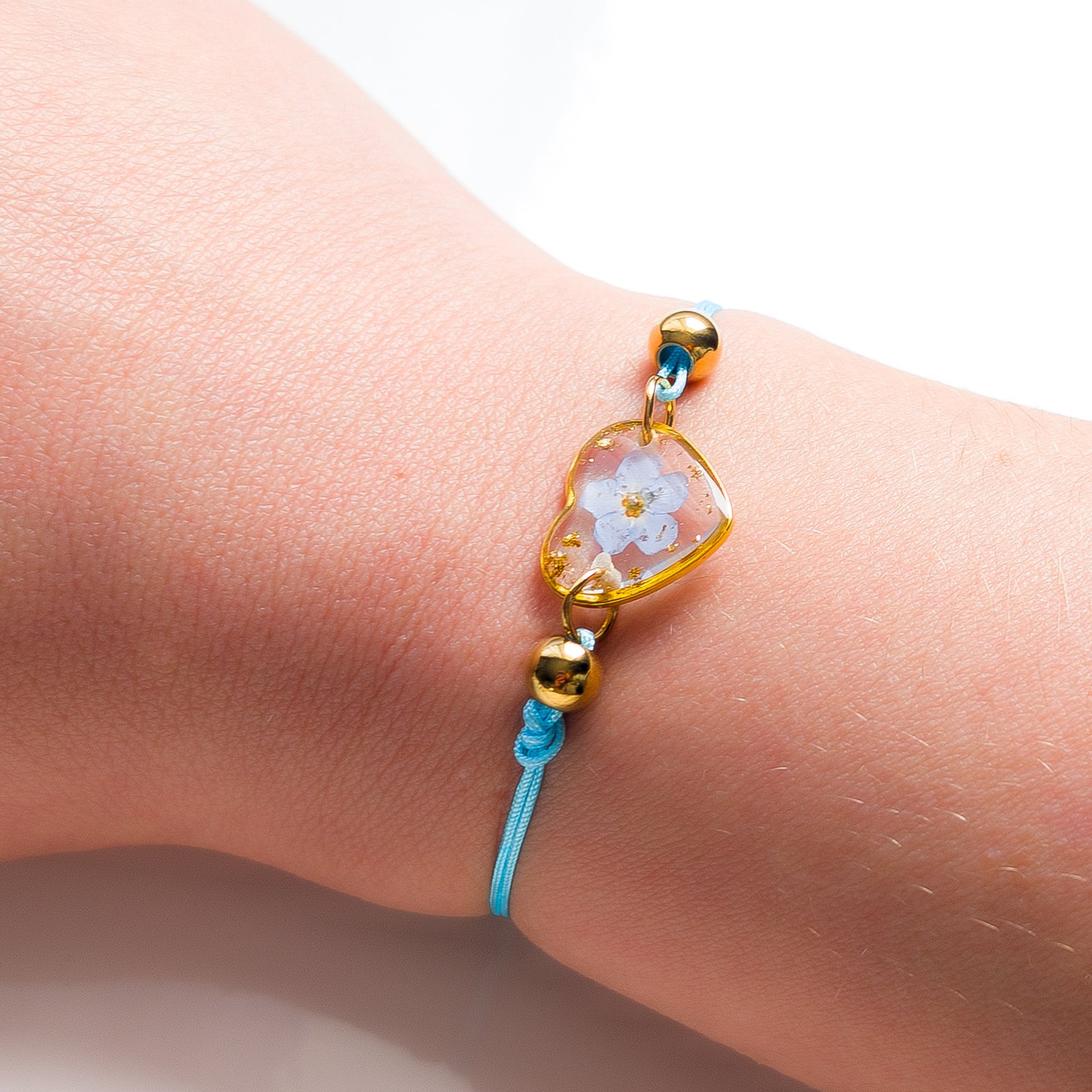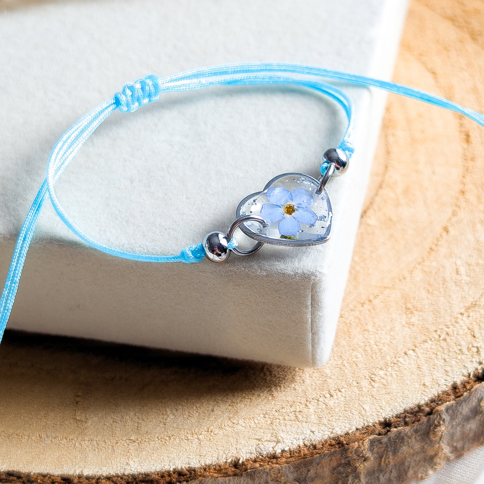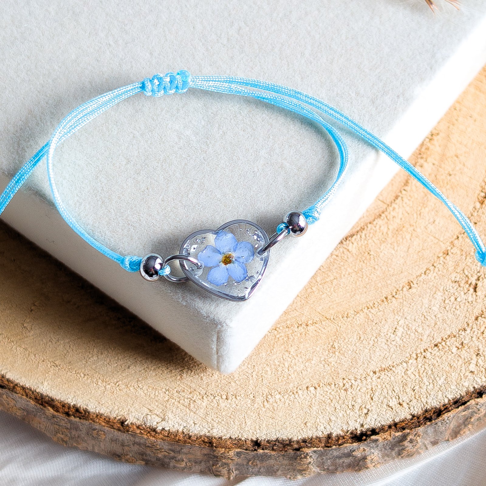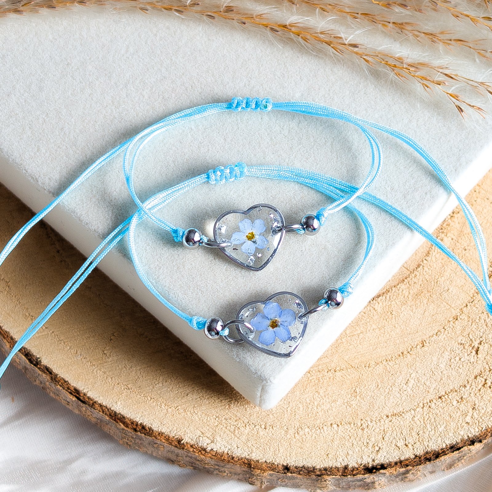 Delicate friendship bracelet set – buy one and get the second one free (buy one get one free). Versions to choose from: gold or silver, both with blue nylon cord, adjustable macramé clasp and a heart-shaped pendant featuring a forget-me-not embedded in resin (1.5 cm). Metal parts made of stainless steel – perfect as a gift for a friend. The forget-me-not symbolises true love, memory, loyalty, and bonds of friendship, making these friendship bracelets an excellent symbol of lasting friendship and memories.