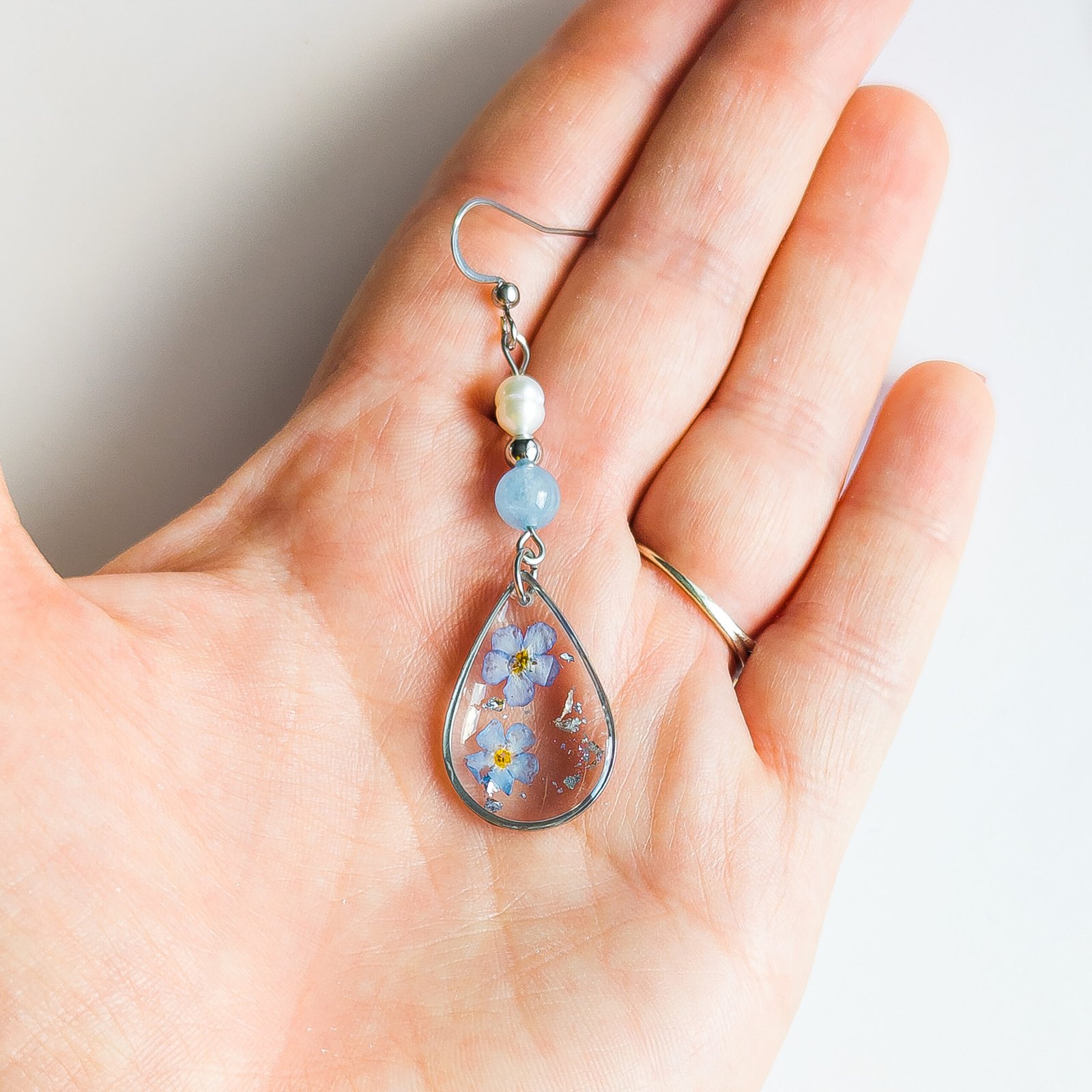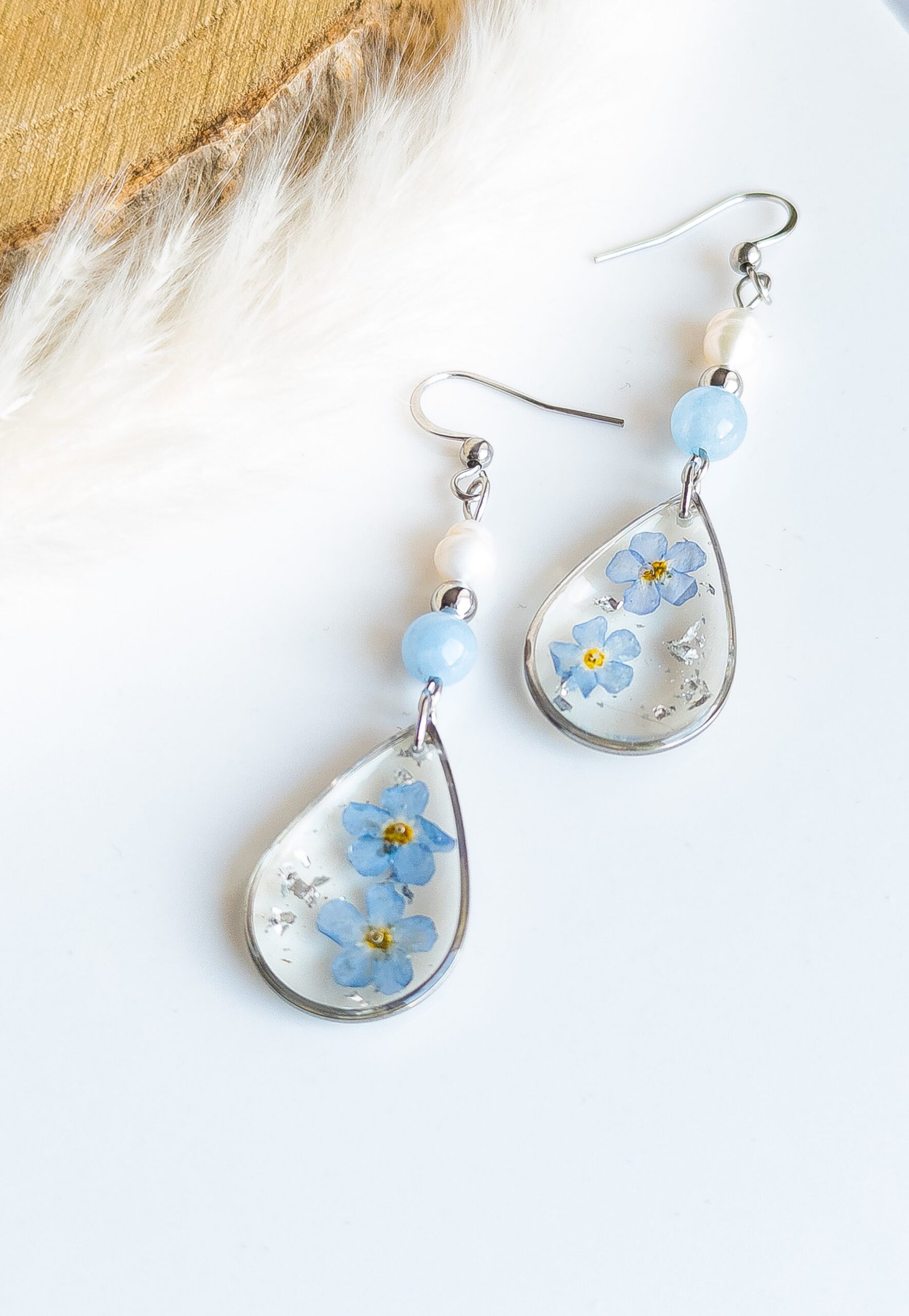 Delicate earrings featuring forget‑me‑nots embedded in clear, teardrop‑shaped resin make a romantic piece of jewellery, perfect for everyday wear and special occasions alike. The soft blue flowers are complemented by beads made of natural freshwater pearls and smooth aquamarine spheres, giving the earrings an elegant and refreshing look.