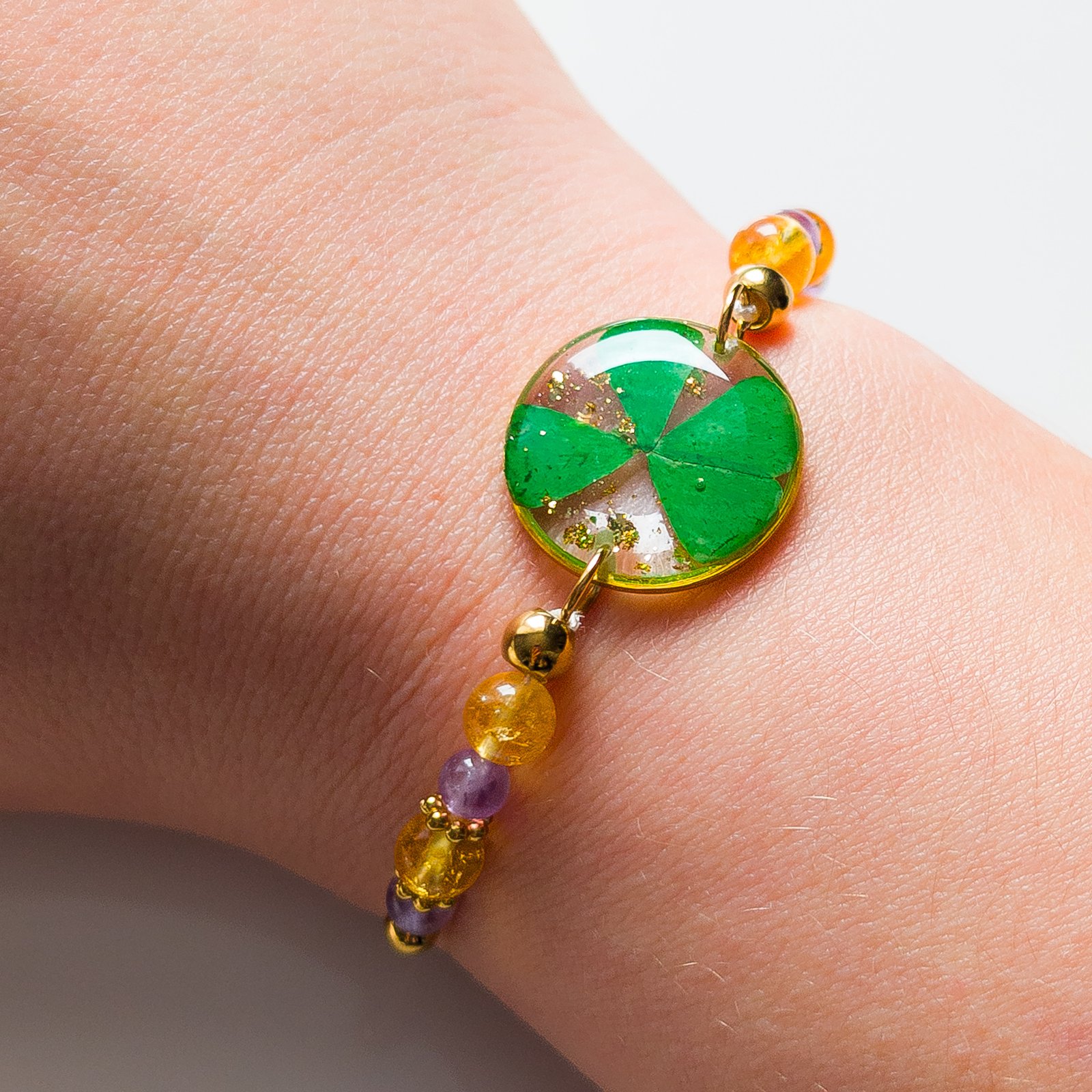 Beautiful bracelet featuring a four-leaf clover and natural stones: citrines and amethysts, perfect as a personal talisman for good luck. Ideal for everyday outfits thanks to its lightweight and comfortable wear.
