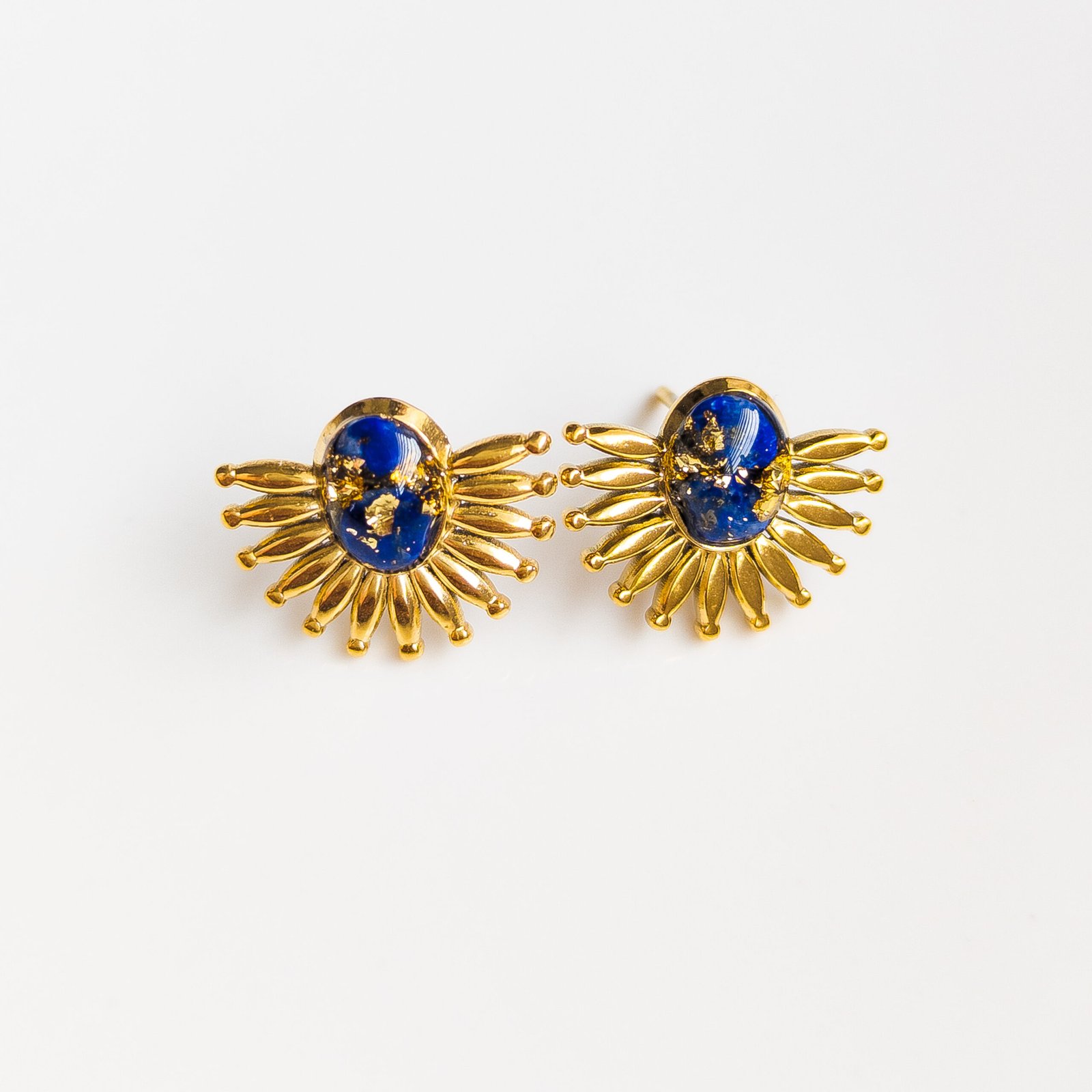Steel earrings in an original sunburst shape, feature encapsulated lapis lazuli with delicate gold flakes in the centre. They measure about 1.5 cm and are made of high-quality stainless steel with a gold finish. The centrepiece is a hand-set lapis lazuli stone, making each pair truly one of a kind.