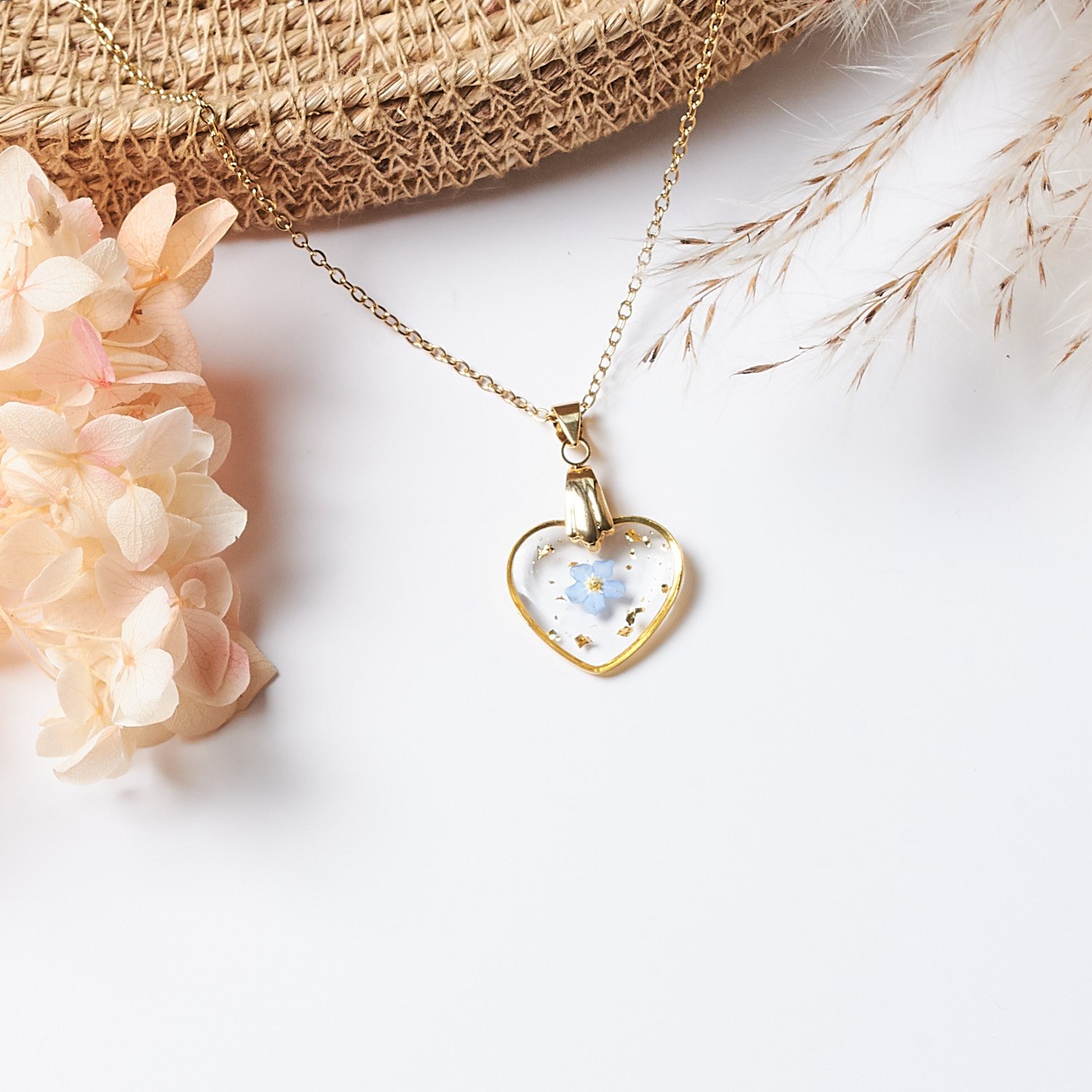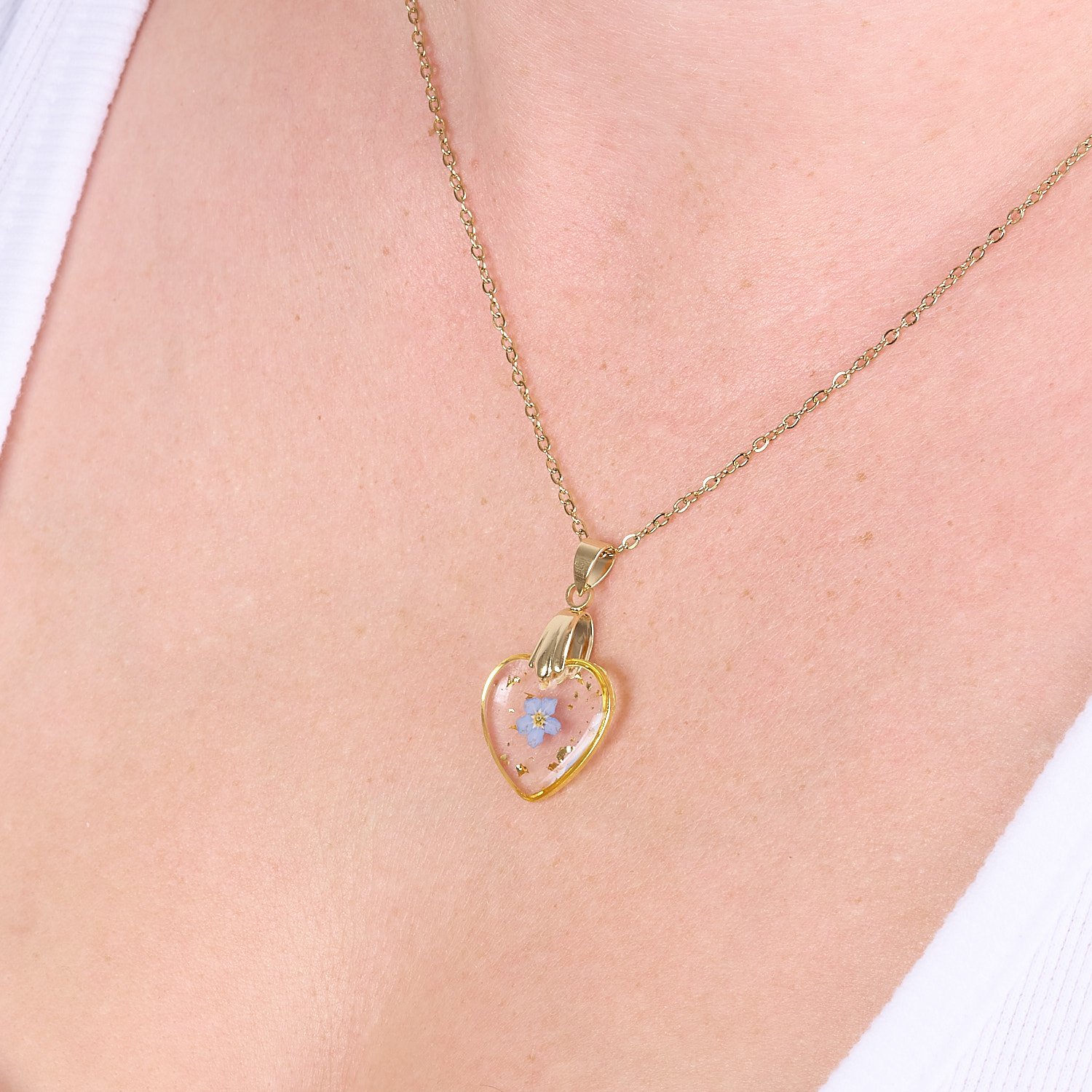 A beautiful necklace featuring real dried forget-me-nots, perfect for everyday wear as well as special occasions. It also makes a wonderful gift. The forget-me-not symbolises memory, true love, loyalty, and lasting, deep bonds between people. It is often associated with care, faithfulness, and unforgettable moments shared with loved ones.