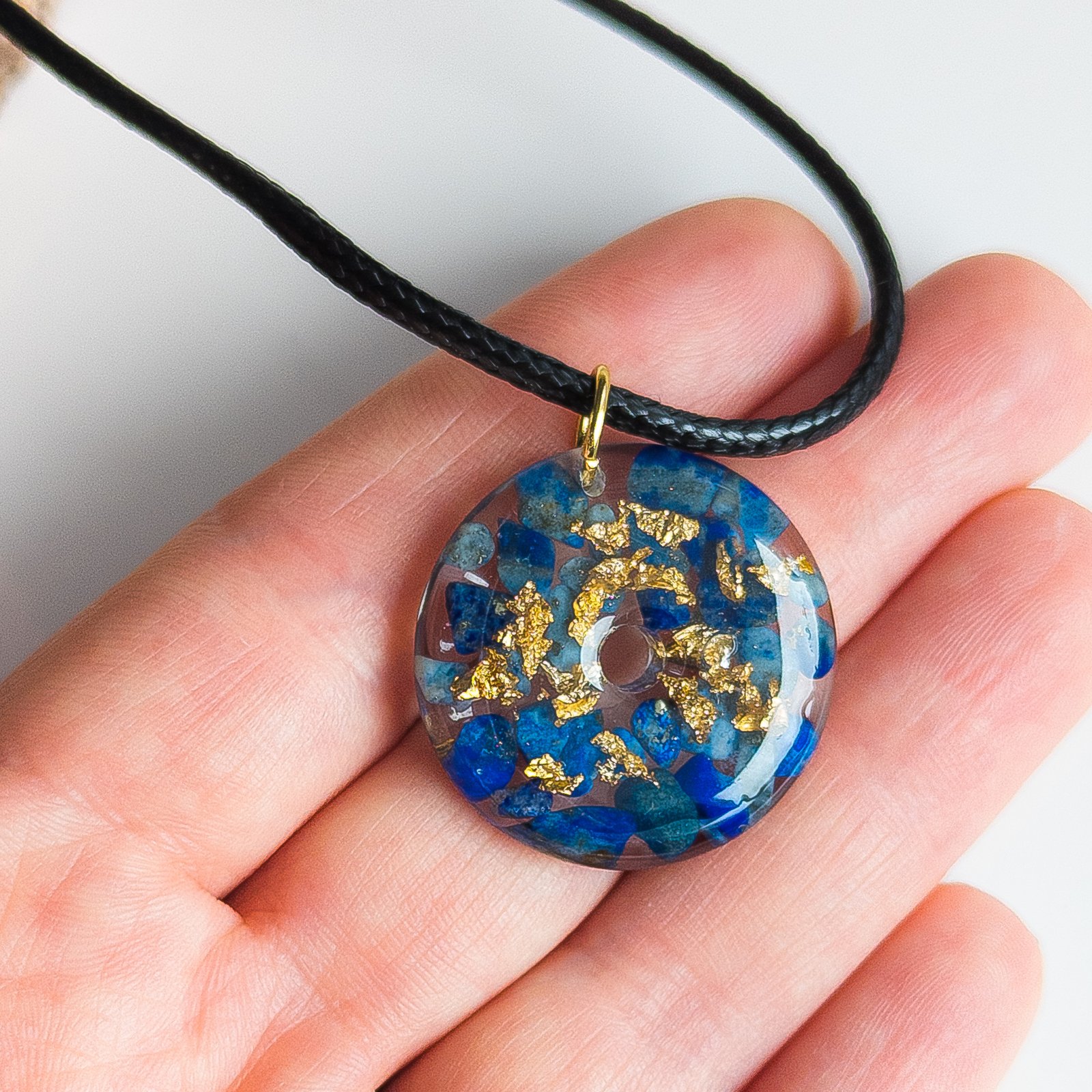 This necklace features a round resin pendant with embedded lapis lazuli chips and gold flakes, hanging from a black cord measuring 60 cm in length and closed with a convenient spring clasp. The pendant is approximately 2.5 cm in diameter, showcasing the deep blue tones of the stone and the elegant golden accents.