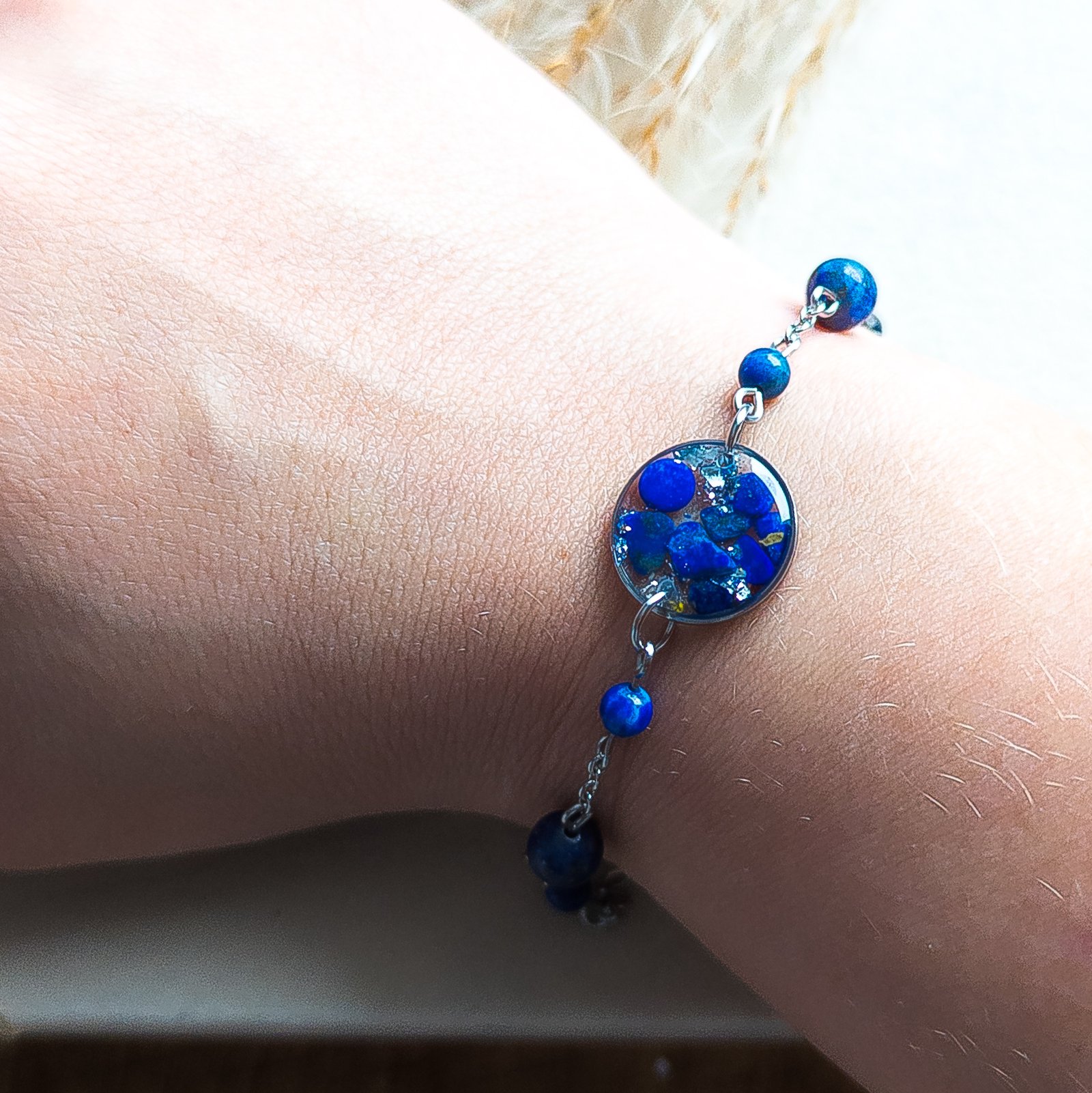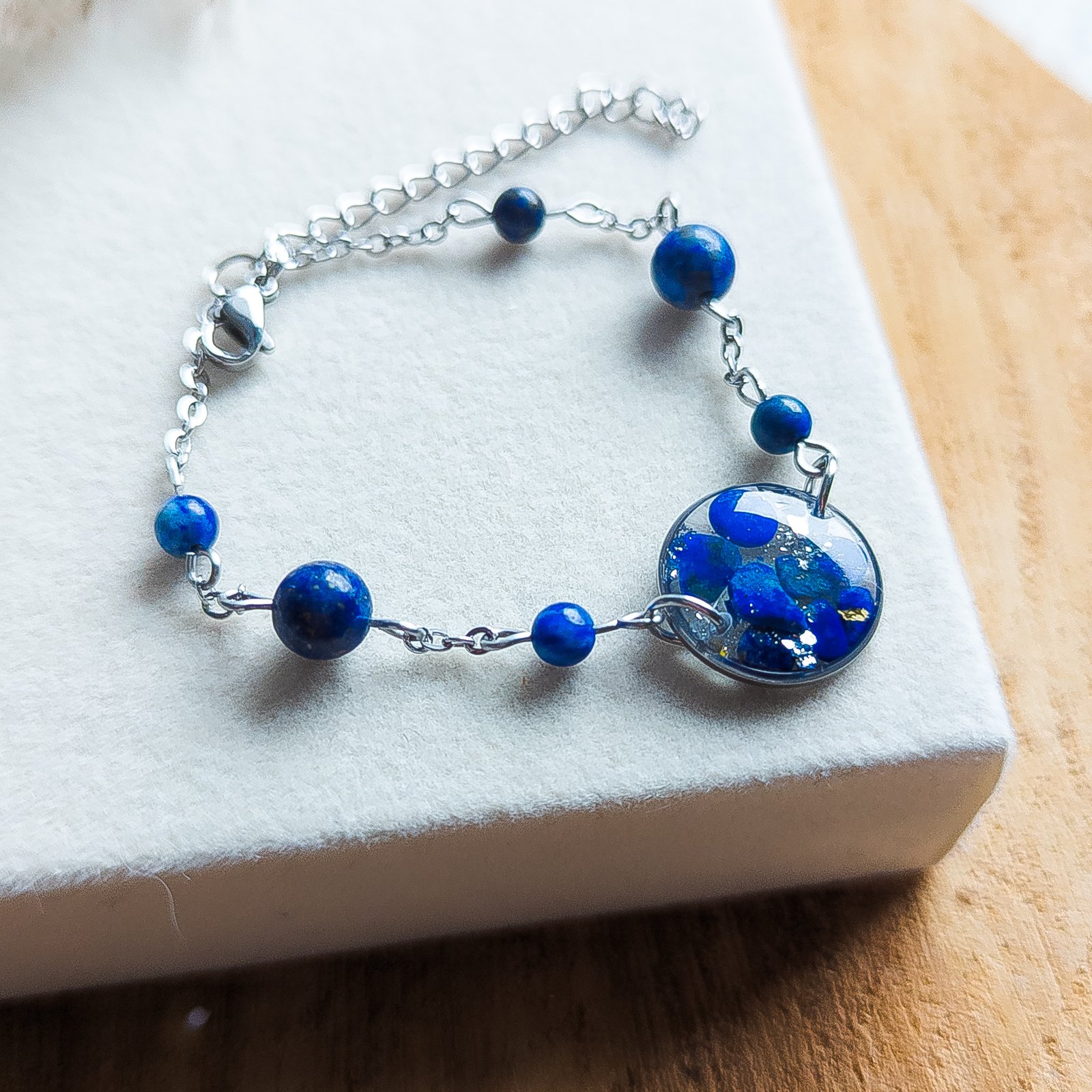 Beautiful bracelet made of natural lapis lazuli and a subtle chain, featuring a unique round pendant with embedded small stones of this precious mineral. The jewellery is lightweight and comfortable to wear, representing a perfect blend of classic elegance and the natural beauty of gemstones.