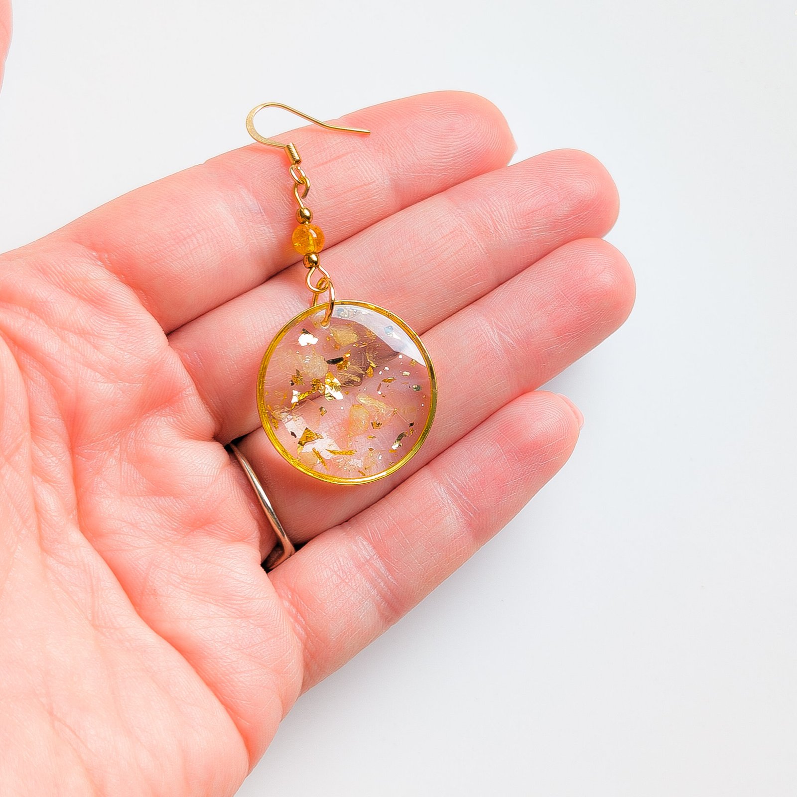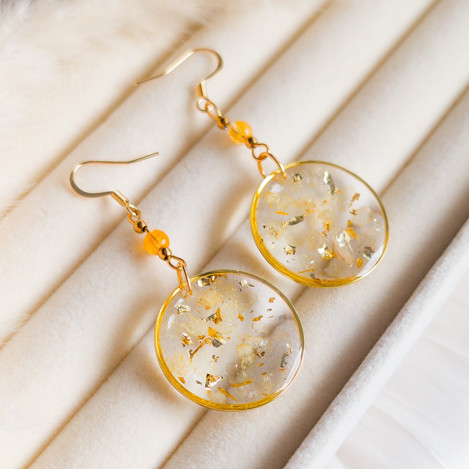 Elegant earrings with a sunny glow, featuring embedded raw fragments of natural citrine and shimmering gold foil flakes. The design is suspended from a delicate citrine bead, creating a cohesive and radiant look, perfect for those who appreciate natural gemstone jewellery.