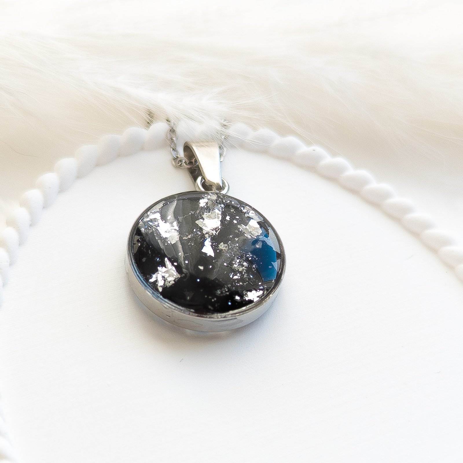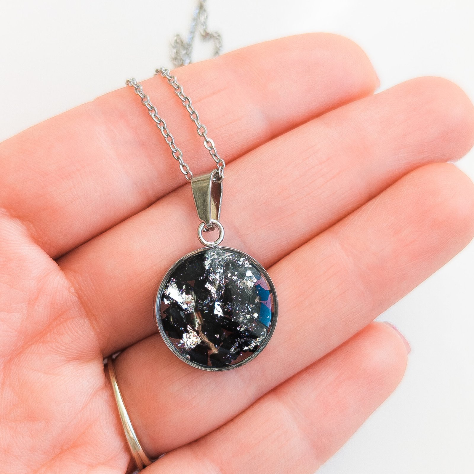 Elegant necklace featuring embedded black tourmaline and silver-toned flakes that evoke a starry night sky.