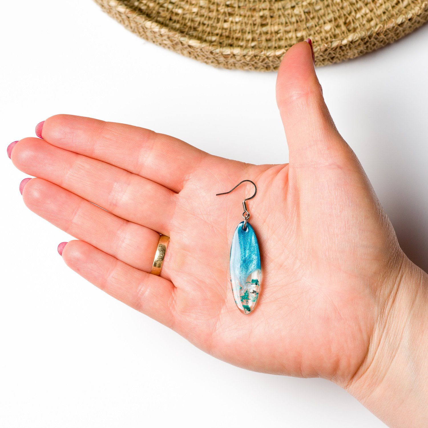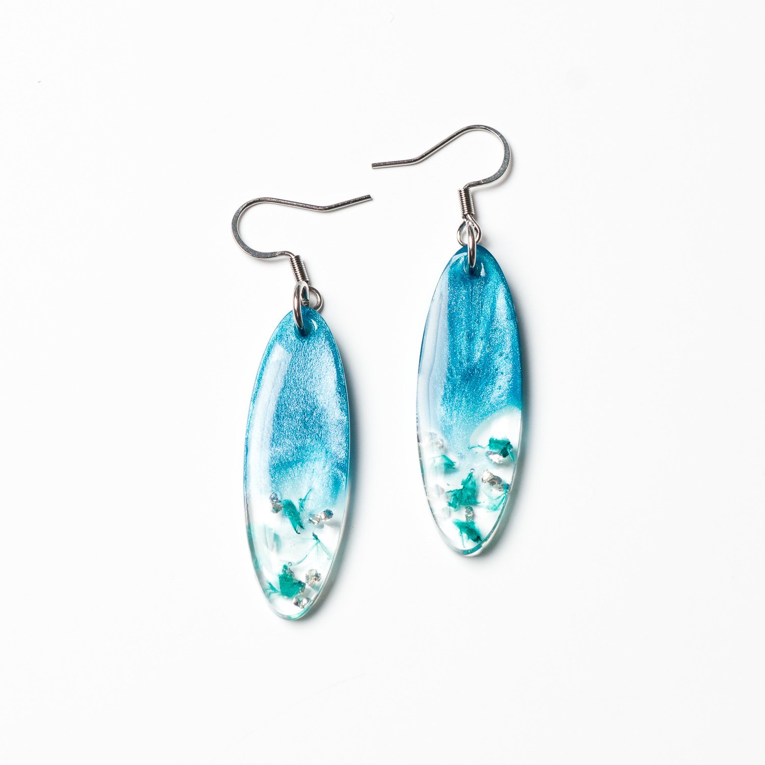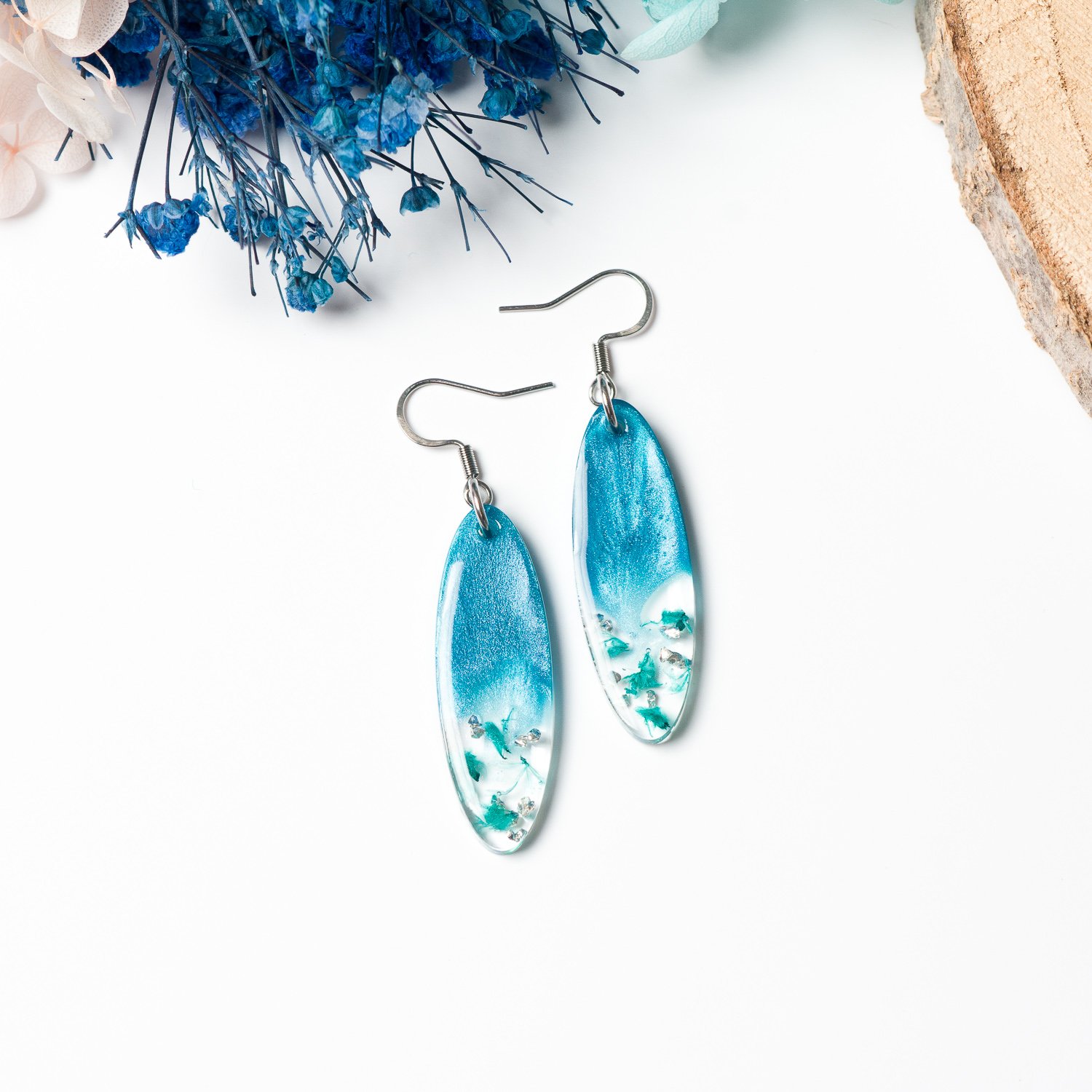Enhance your jewelry collection with these stunning handcrafted earrings, designed with a sleek stainless steel hook and frame. Each piece is made with high-quality clear resin, encapsulating delicate baby’s breath petals and shimmering foil flakes. A touch of mica powder creates a beautiful, luminous effect, adding depth and elegance to the design. The elongated oval shape offers a modern and graceful look, making these earrings a perfect blend of nature and artistry. Perfect for gifting or adding a unique, nature-inspired charm to your collection!