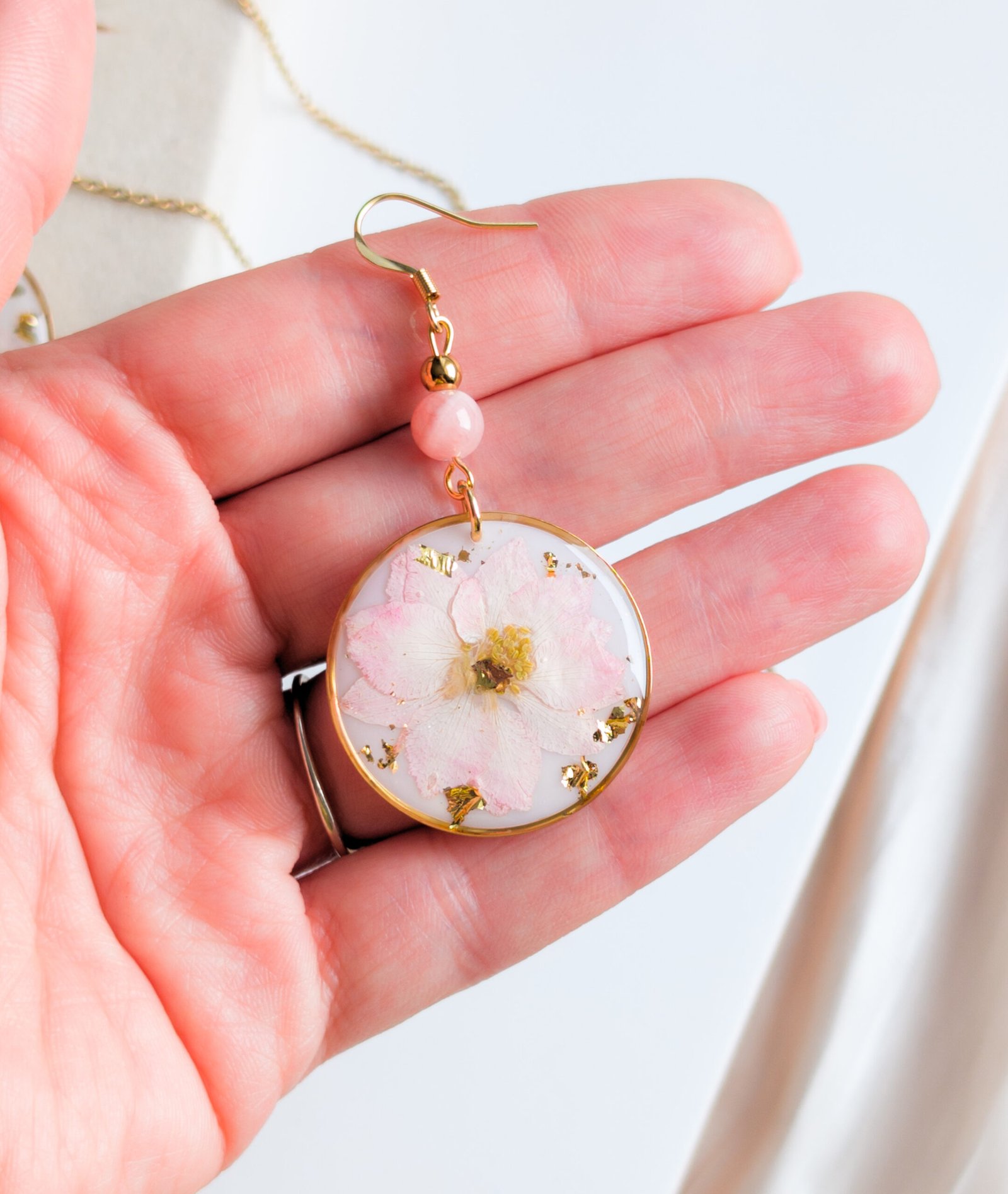 Beautiful jewellery set with embedded dried flowers and delicate gold foil flakes, perfect for spring and summer outfits. The set is lightweight and comfortable to wear.