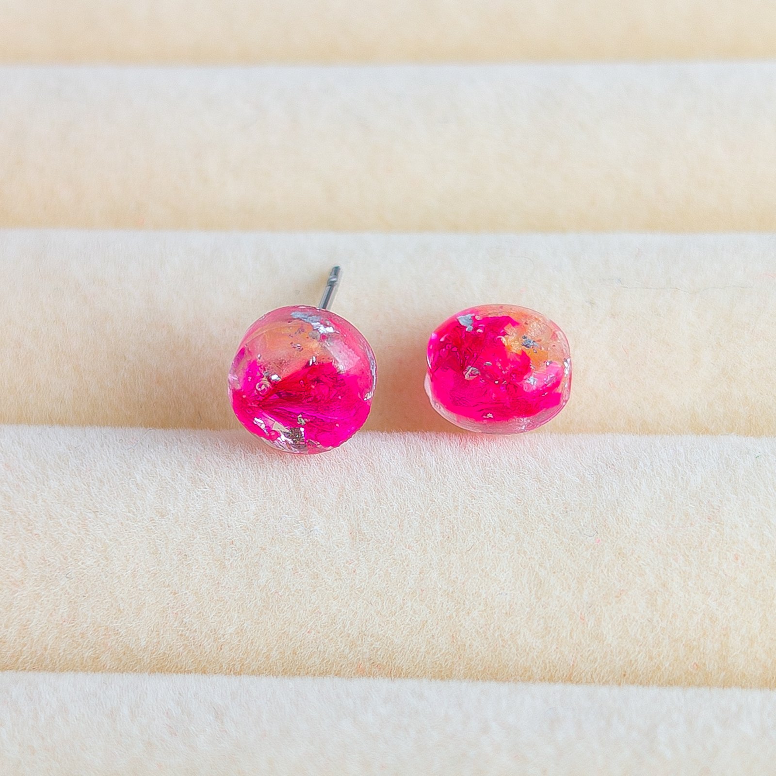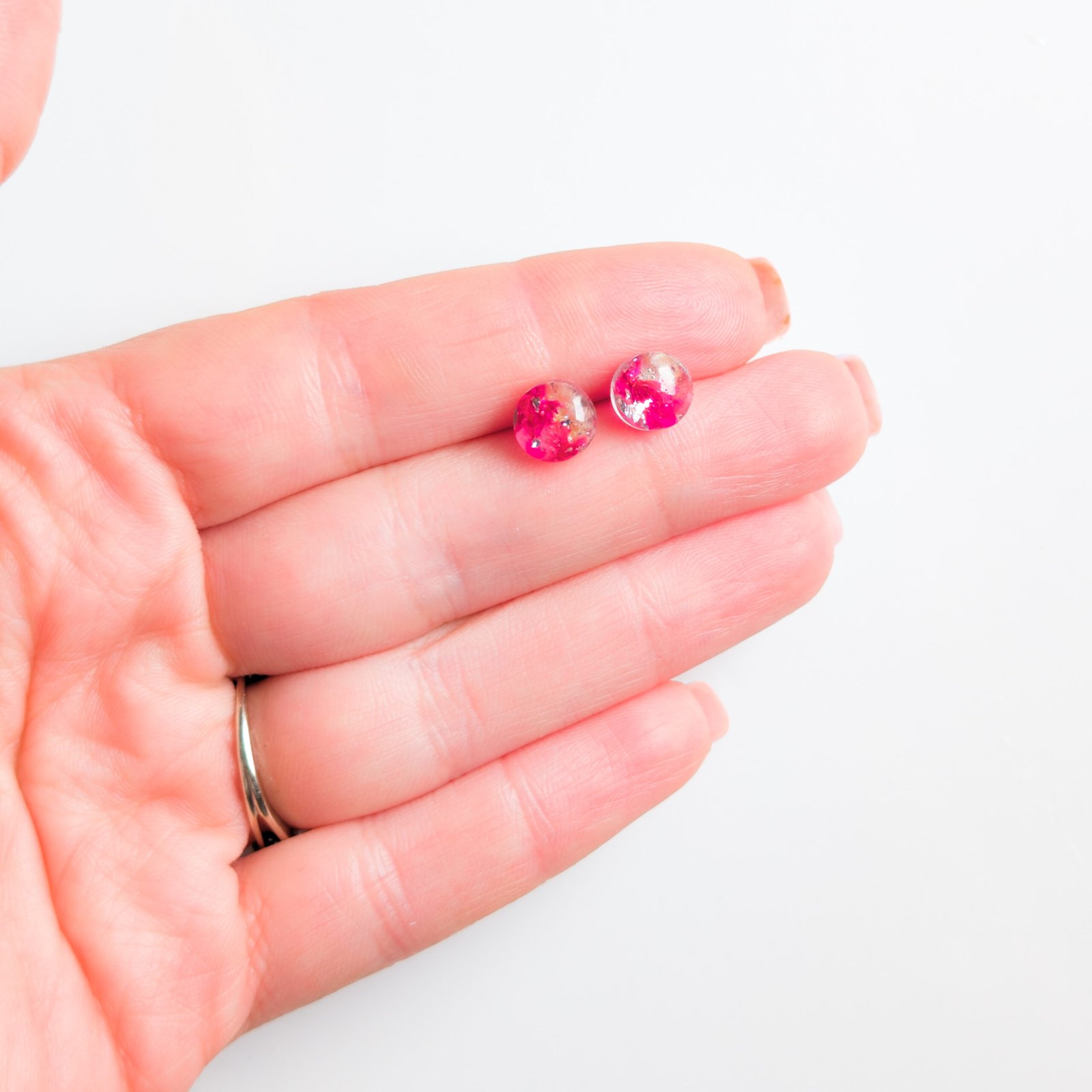 Stud earrings with dried petals set in resin, in an intense shade of pink with subtle gold flecks. The delicate spheres measure around 0.5 cm in diameter, and the metal parts are made of stainless steel, making them durable yet lightweight. They are a romantic, feminine accent that beautifully completes everyday outfits, matching both a simple T‑shirt and jeans and a floaty dress.