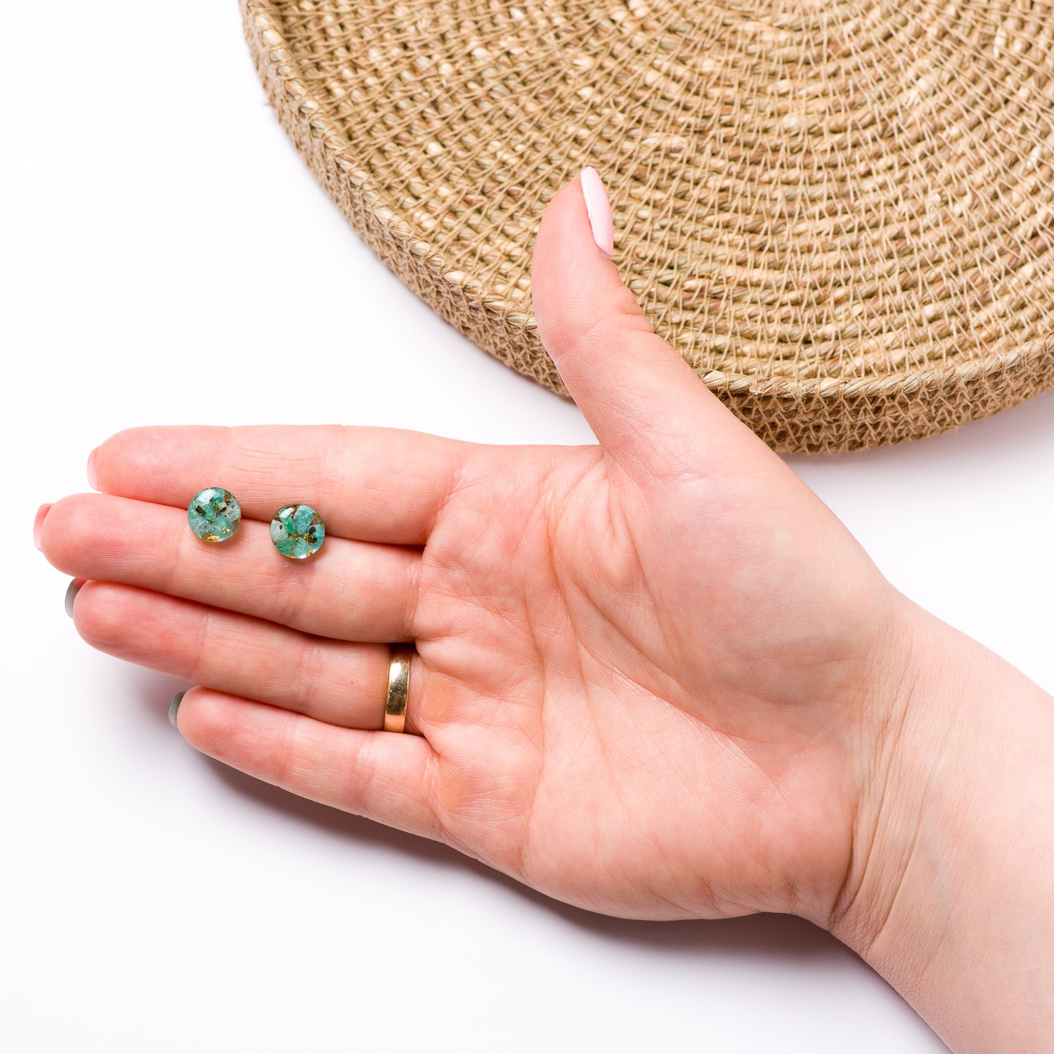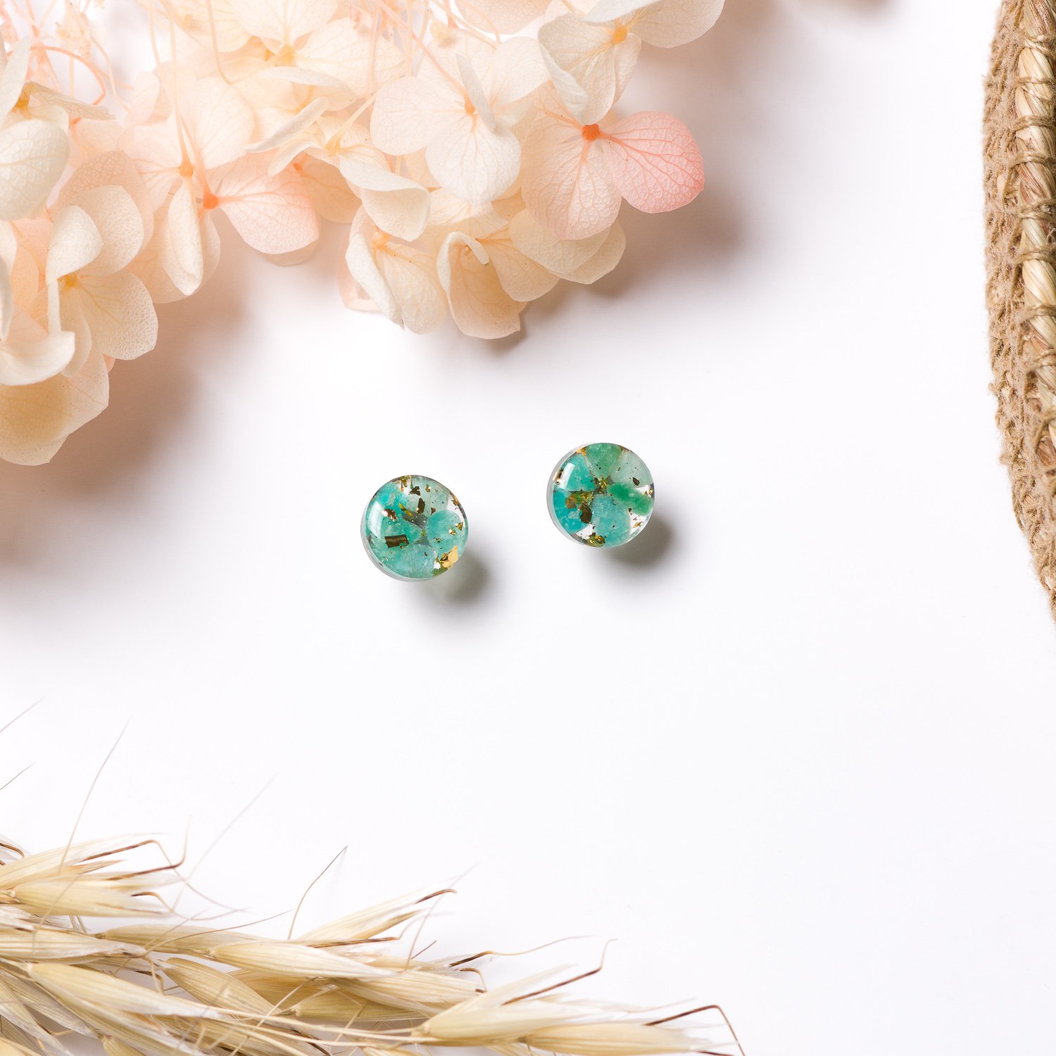 These beautiful earrings with embedded amazonite stones are the perfect choice for everyday styling. The embedded specks of gold foil add an elegant touch. Amazonite is often considered a stone of calm and harmony. It is believed to particularly benefit Gemini, Libra, and Sagittarius.
